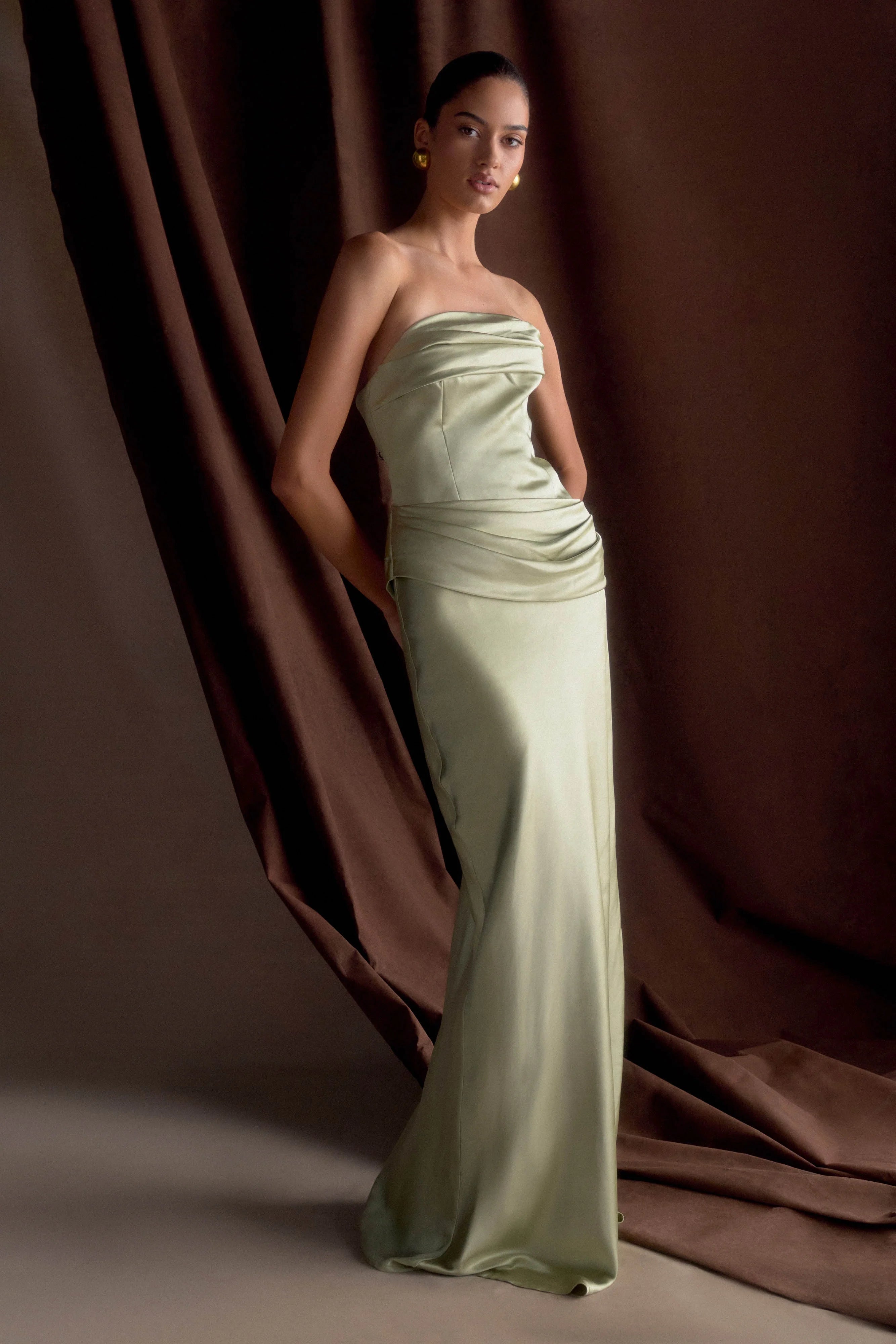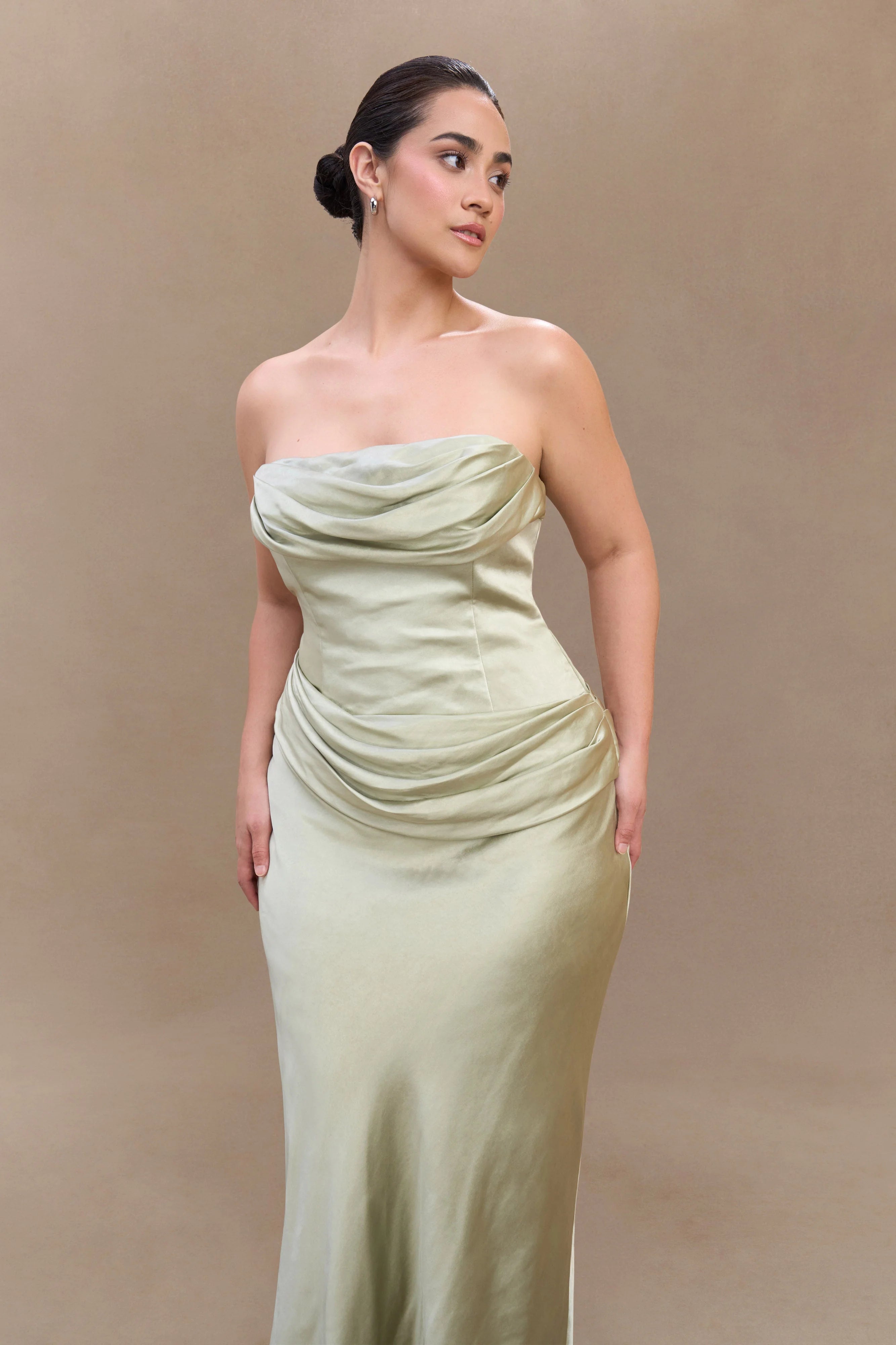 The JASMINE Strapless Satin Maxi Dress is the epitome of refined glamour. Designed with a softly gathered bust overlay, this strapless silhouette creates a romantic yet sculpted effect. The boned bodice provides structure and support, while the gathered hip detail enhances the figure with elegant draping. A maxi-length skirt flows effortlessly, ensuring graceful movement with every step. Featuring an internal elastic waist stay for a secure fit and a discreet side zip with a hook-and-eye closure, this dress is perfect for formal occasions, evening events, and modern bridal moments.