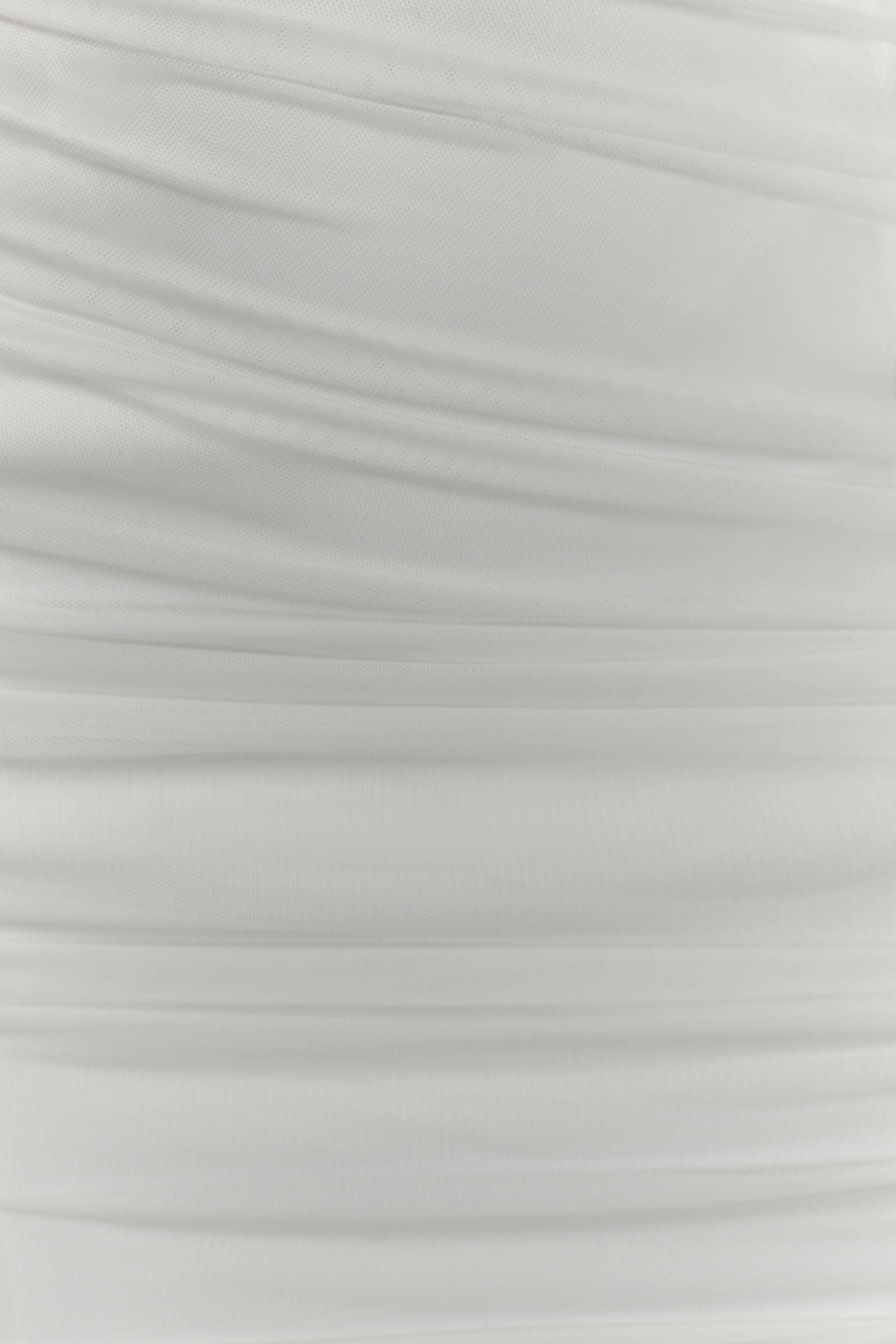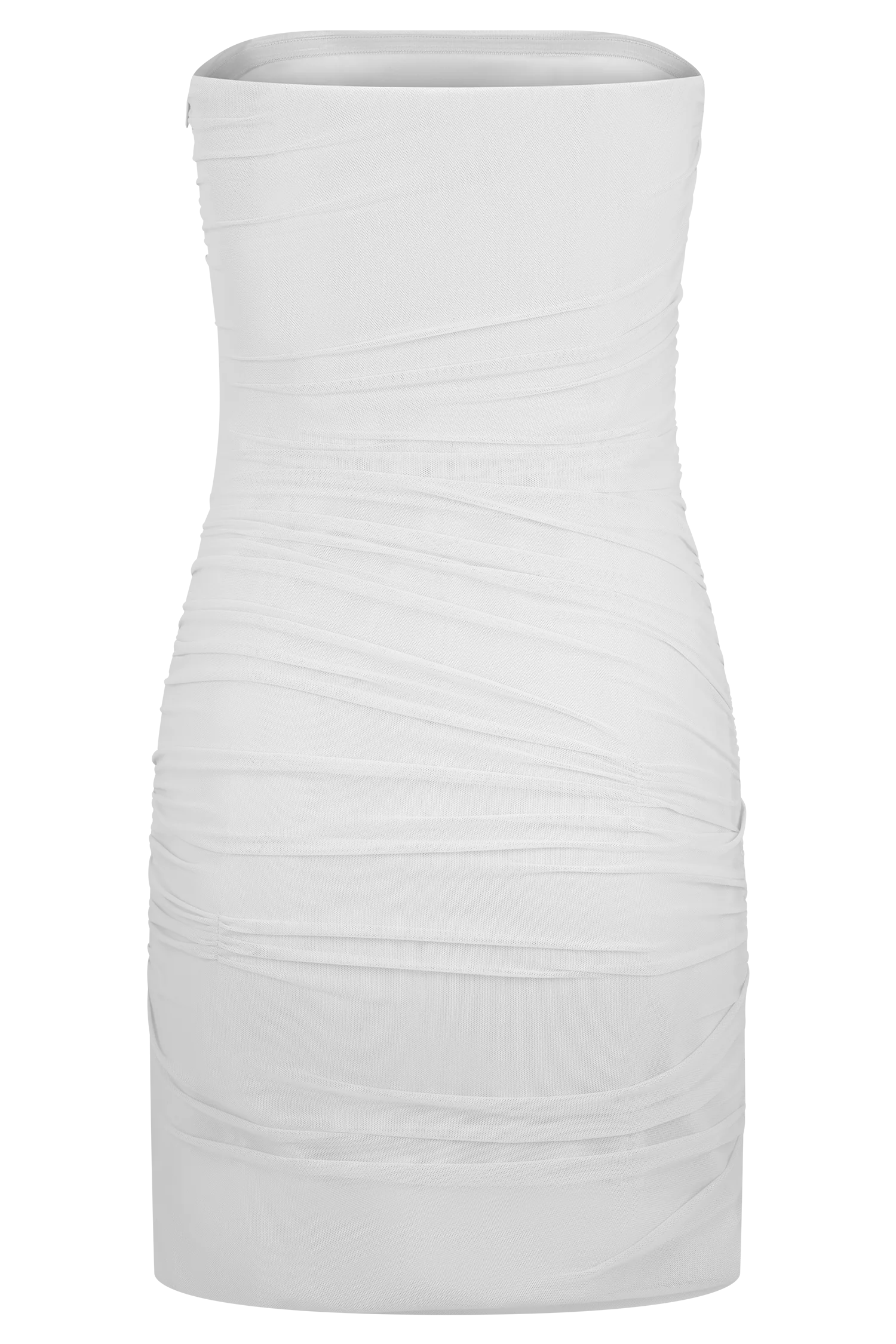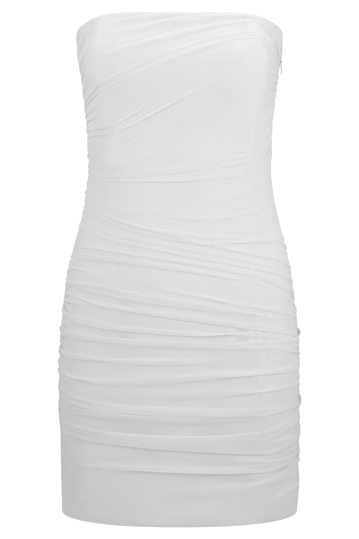 The JIANNA Strapless Mesh Mini Dress is your go-to for a bold, structured silhouette. Designed with a straight strapless neckline and internal boning for support, this bodycon mini contours with soft gathered mesh and a fully lined finish. Whether it's date night or dance floor, this dress is built to stand out—no straps, no fuss, all impact.