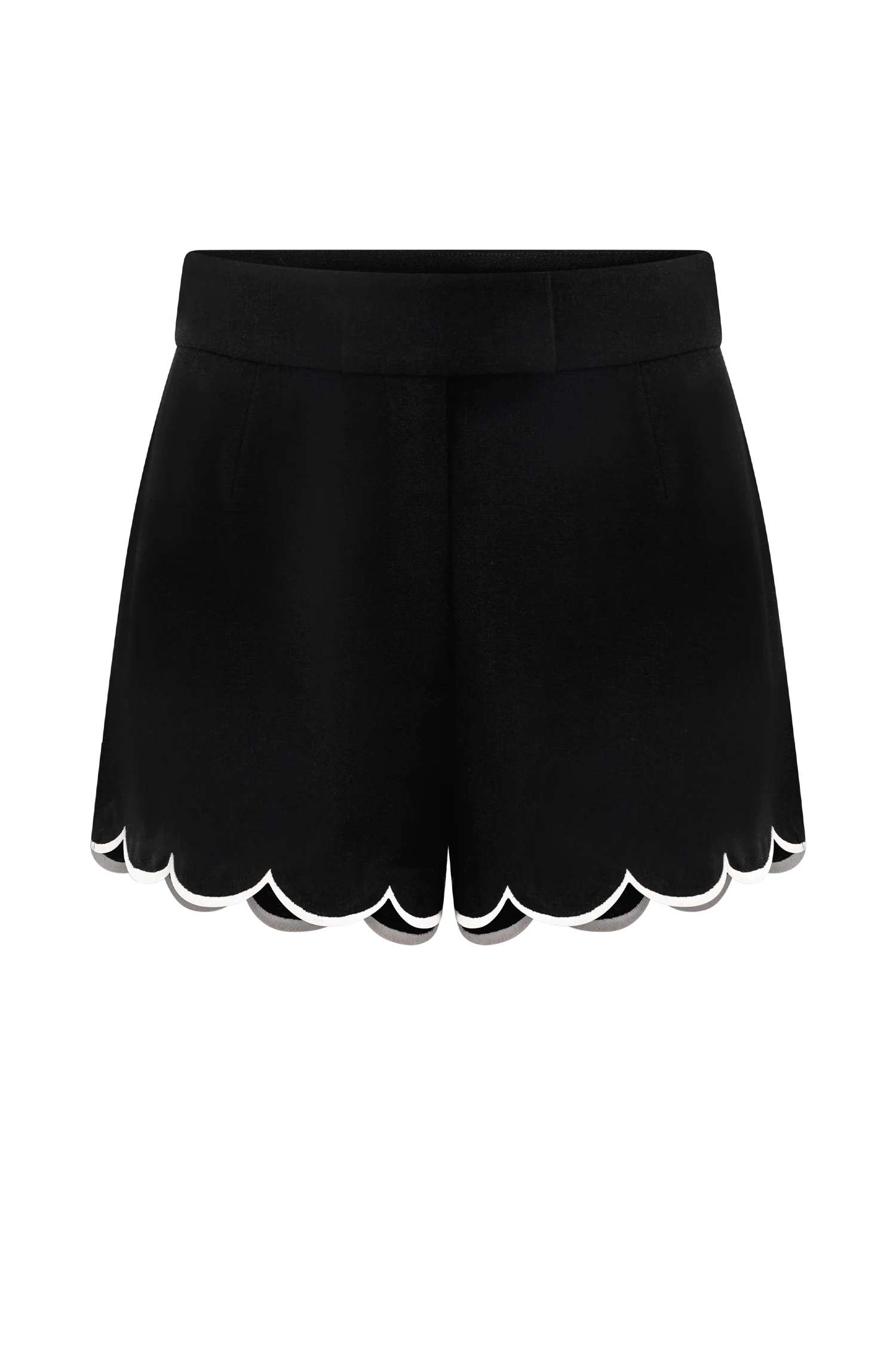 The JUDITH Scallop Shorts bring a feminine twist to classic tailoring. Designed with a flattering high-waisted fit and mini length, these shorts feature a scalloped hem highlighted by contrast white embroidery stitching for a refined finish. A fly front with bar tab fastening ensures a clean, structured look. Pair with the for a matching set that blends charm, confidence, and effortless summer styling.