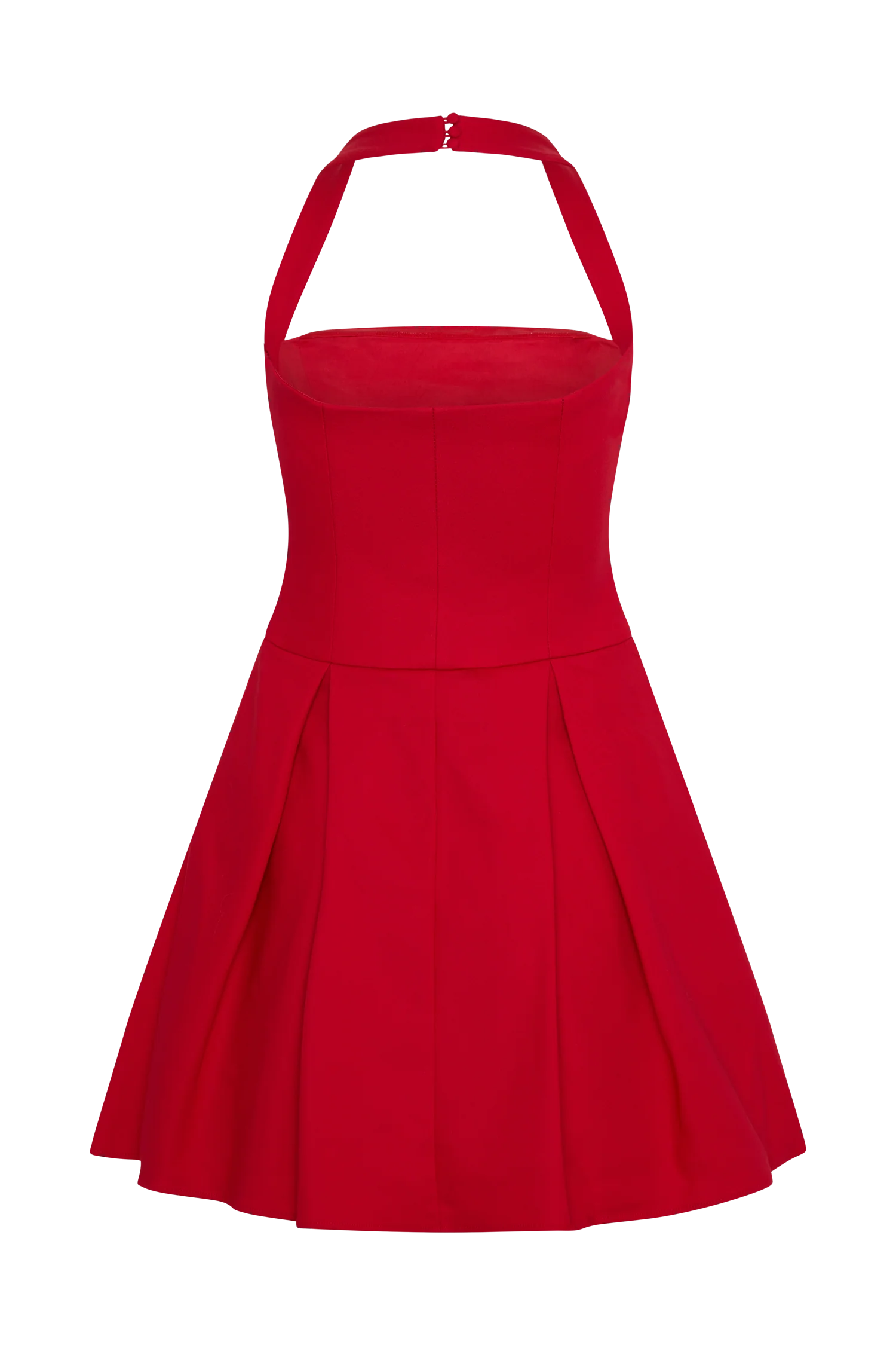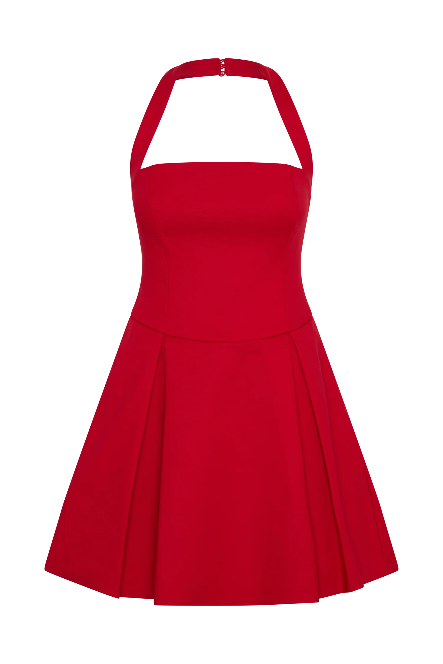 Turn heads with the JULIA Halter Mini Dress, a perfect blend of charm and sophistication. Featuring a halter neckline and a rounded waistline, this dress accentuates your figure while maintaining an effortless feel. The front and back skirt pleats add dynamic movement, bringing a playful touch to the chic mini length. Finished with a convenient side zip for easy wear, this dress is your go-to for parties, date nights, or any occasion where you want to make a stylish statement.