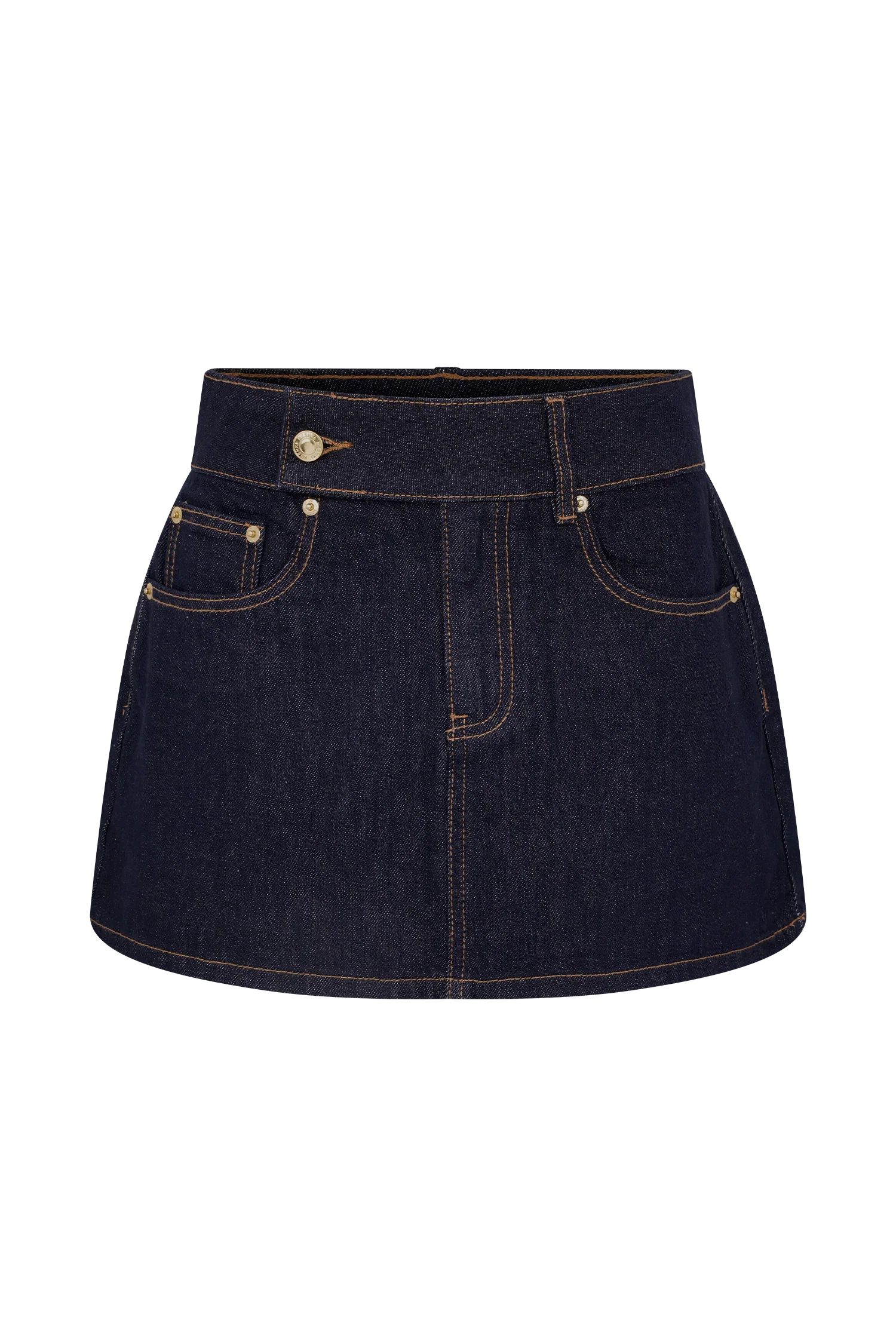 JULIENNE is a low- to mid-rise denim mini skirt with a wide waistband and no lining. Its casual, straightforward design makes it a minimalist piece that works with a variety of day-to-night outfits. The classic button fly closure at the front paired with the clean denim wash and cotton fabrication only adds to its modern, comfortable versatility.