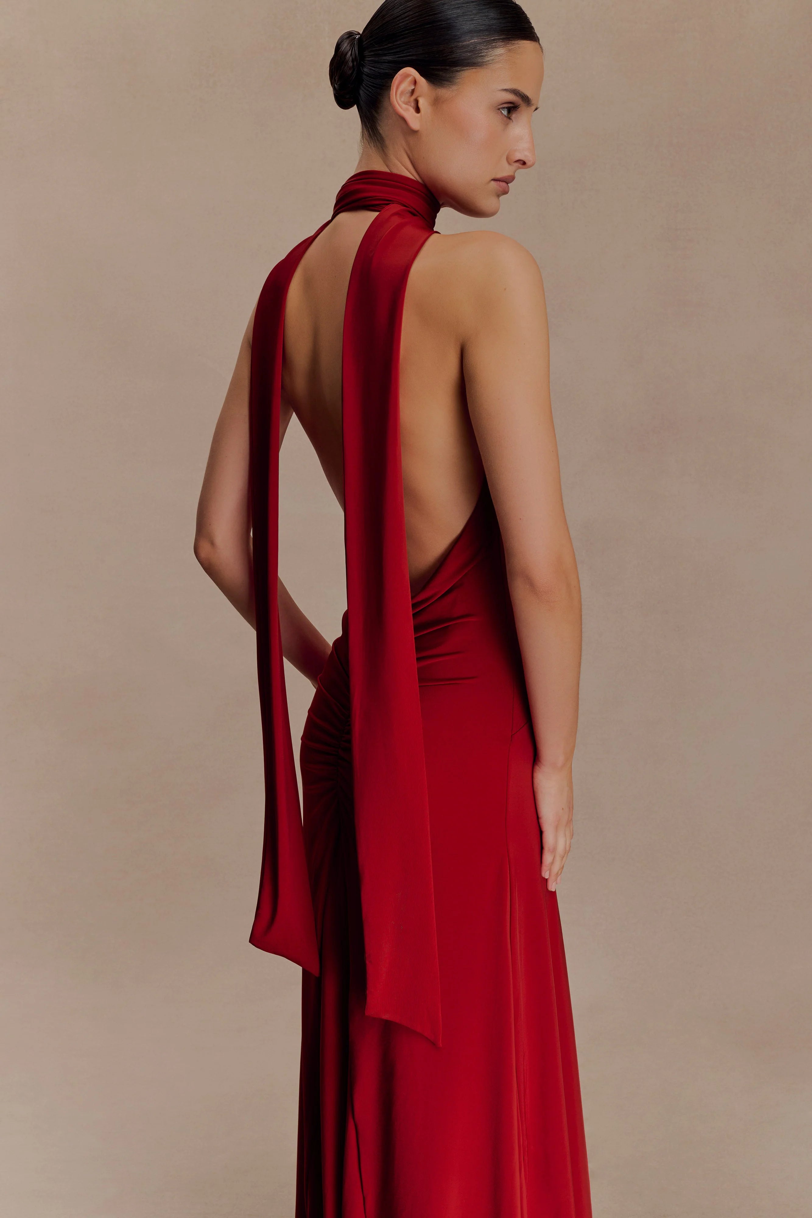 The JULIET Slinky Maxi Dress With Scarf is designed for fluid movement and versatile allure. Featuring a deep V plunge neckline and a fitted bodice, this silhouette skims the figure without the need for a zipper, ensuring a smooth, pull-on fit. The attached neck tie detail can be styled several ways, while the low back and gathered back detailing add a hint of drama. Fully lined for comfort, this dress is finished with a back neckline tie that completes its refined, adaptable design.