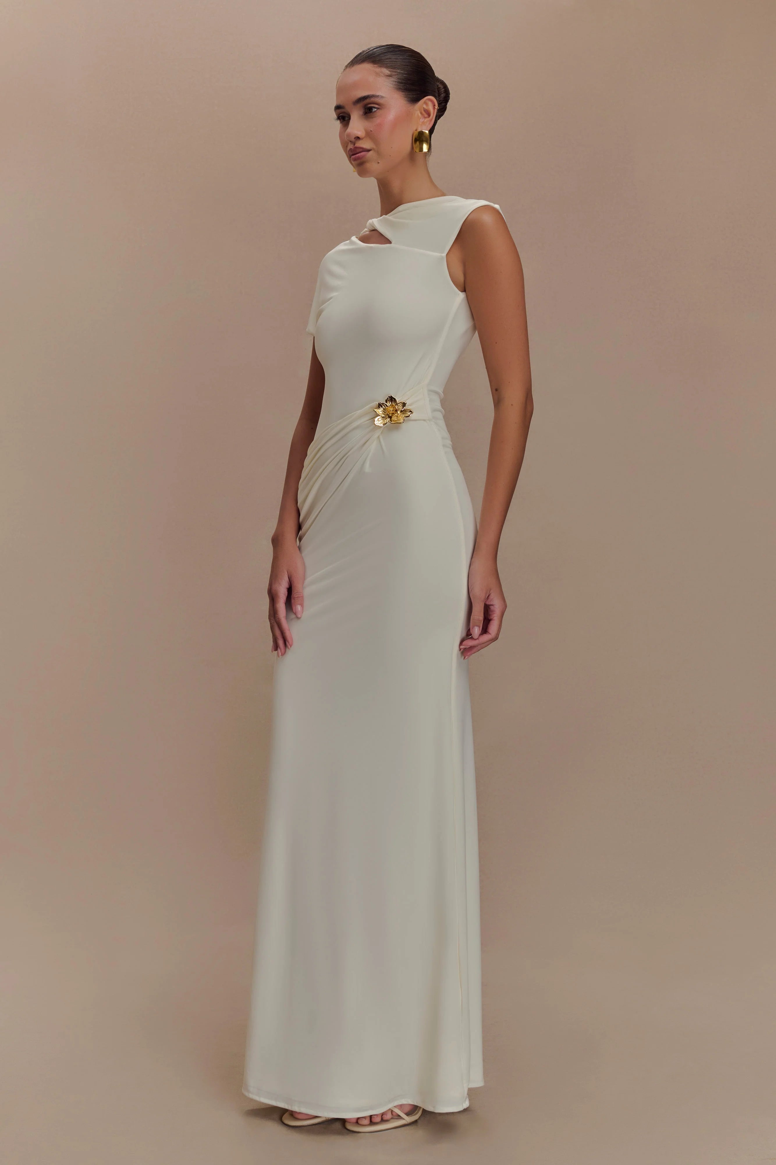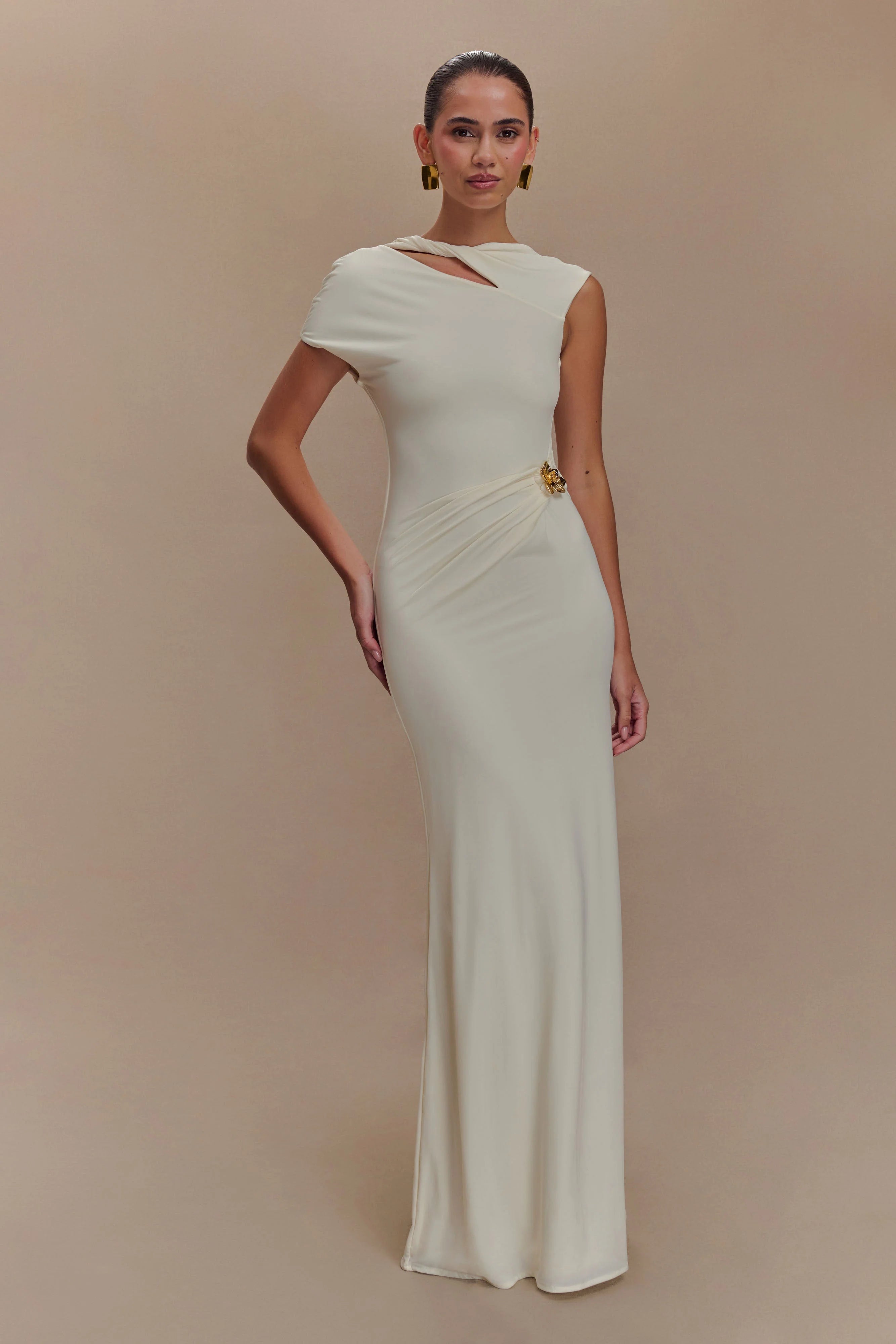 Step into sophistication with the KAIDA Slinky Maxi Dress, designed to turn heads. Featuring an eye-catching asymmetrical neckline, this dress elegantly frames your shoulders while the twist detail front cutout adds a touch of allure. The bodycon silhouette hugs your curves, enhanced by ruching at the hip for a flattering fit. Adorned with striking hardware at the hip, this dress exudes modern elegance. The open back adds an element of intrigue, ensuring you stand out from every angle. Crafted in a luxe slinky fabric and fully lined for comfort, the maxi length flows beautifully, making it perfect for special occasions or upscale evenings out.