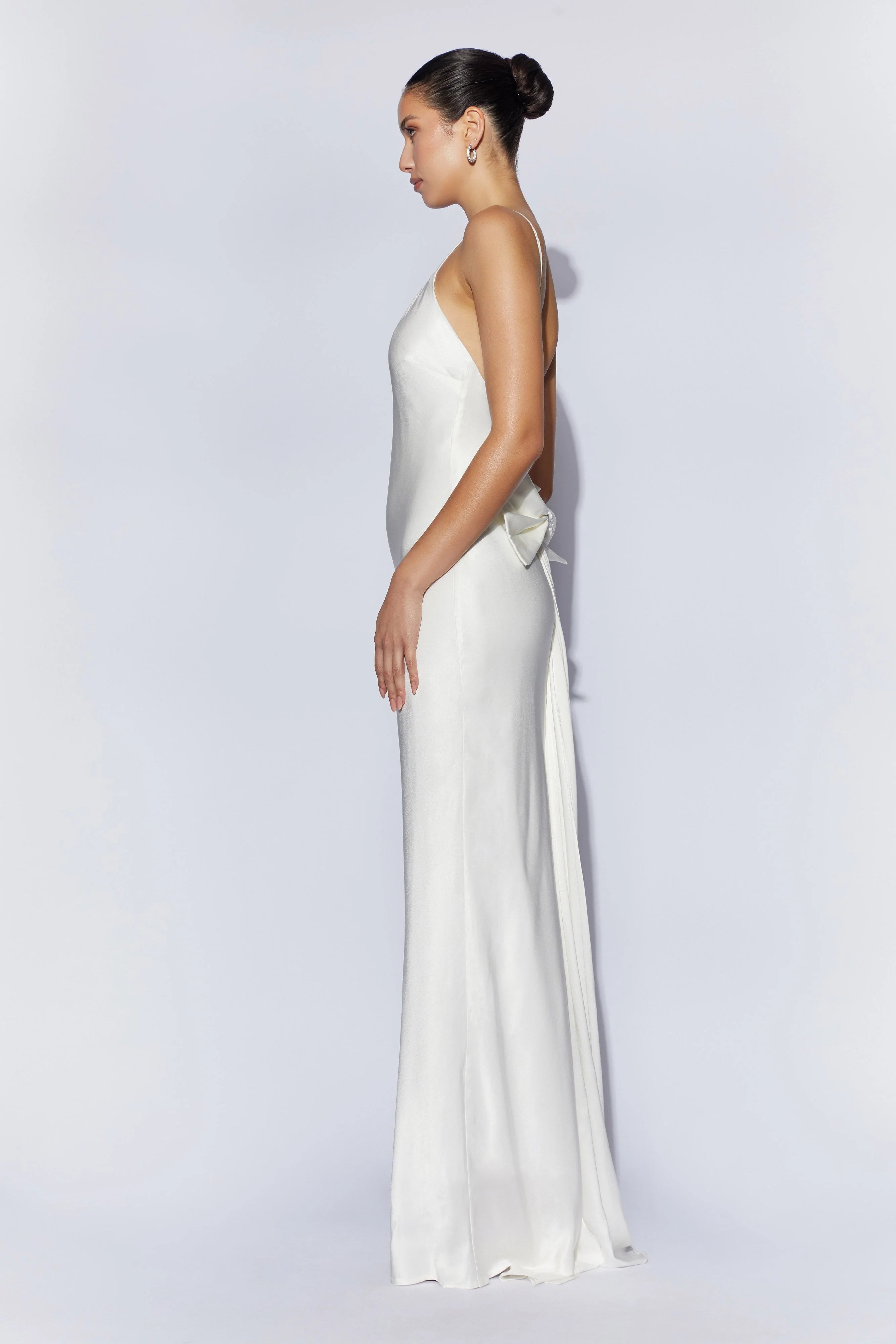 Length KAILEY is so sophisticated and so pure, she’ll have you looking – and feeling! – like a blushing bride on her big day. Draped in swathes of soft ivory, she’s a walking dream; light, elegant, airy, untouchable. Her cut is simple and clean; no intricate details, no modern cut-outs, no extra hardware. Just rayon blended with viscose, falling about your feet and swirling with every step you take. Like a bride’s veil, she comes with a bow train. It flows smoothly and effortlessly, working in tandem with KAILEY’s full skirt to lengthen the hem and create drama. As a queen cuts a path to her throne, so, too, does Kailey’s form. Slip her on; you’ll feel romantic, alluring, and wanted. Don’t forget your crown!