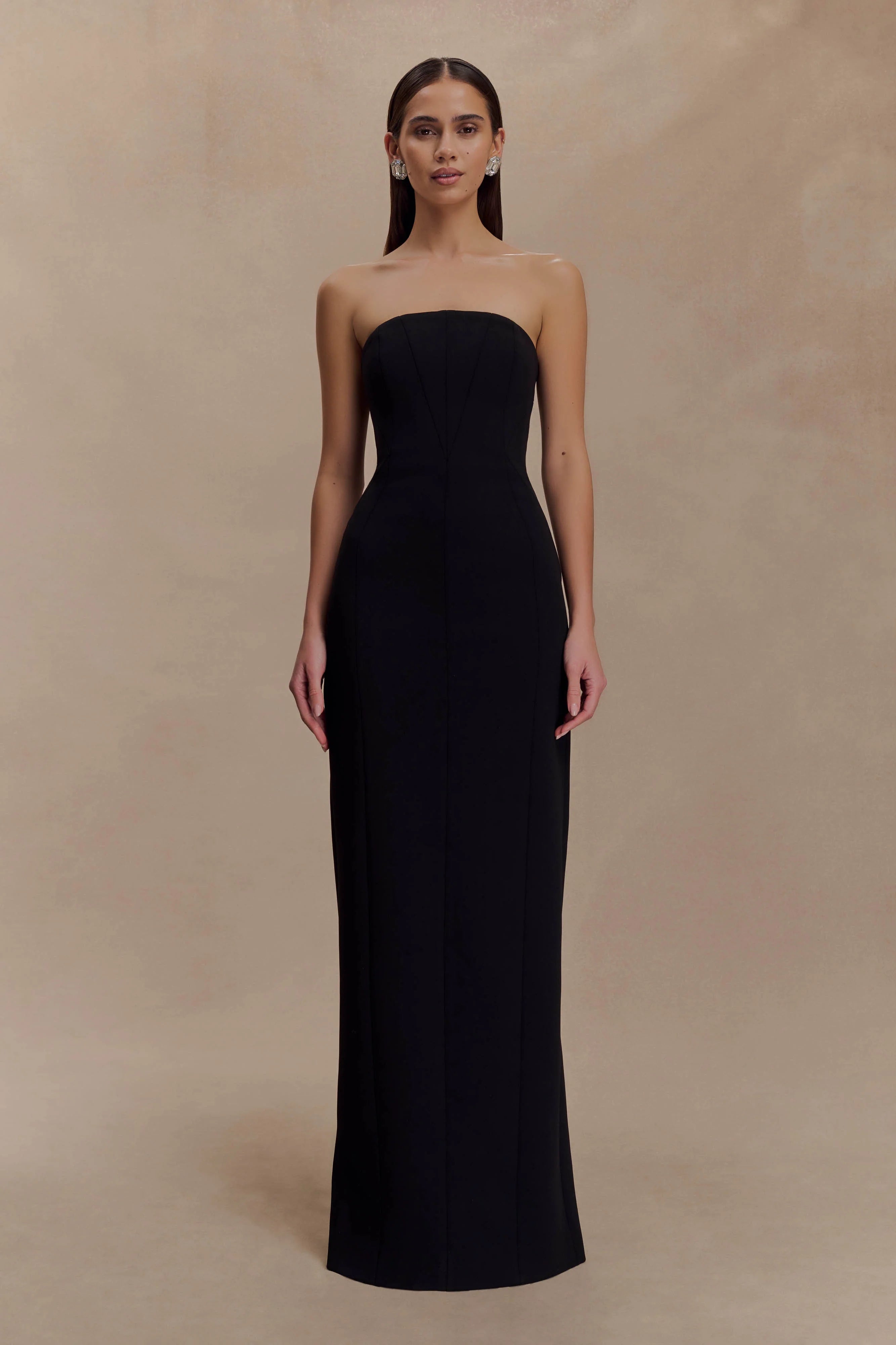 The KALILA Strapless Crepe Maxi Dress is a masterclass in minimalist elegance. Featuring a clean strapless neckline and a sculpted bodycon silhouette, it’s designed with an internal waist stay for secure, confident wear. A back leg vent allows for ease of movement, while the invisible zip ensures a sleek finish. Fully lined for comfort, this dress is the perfect choice for moments that call for understated glamour with a flawless fit.