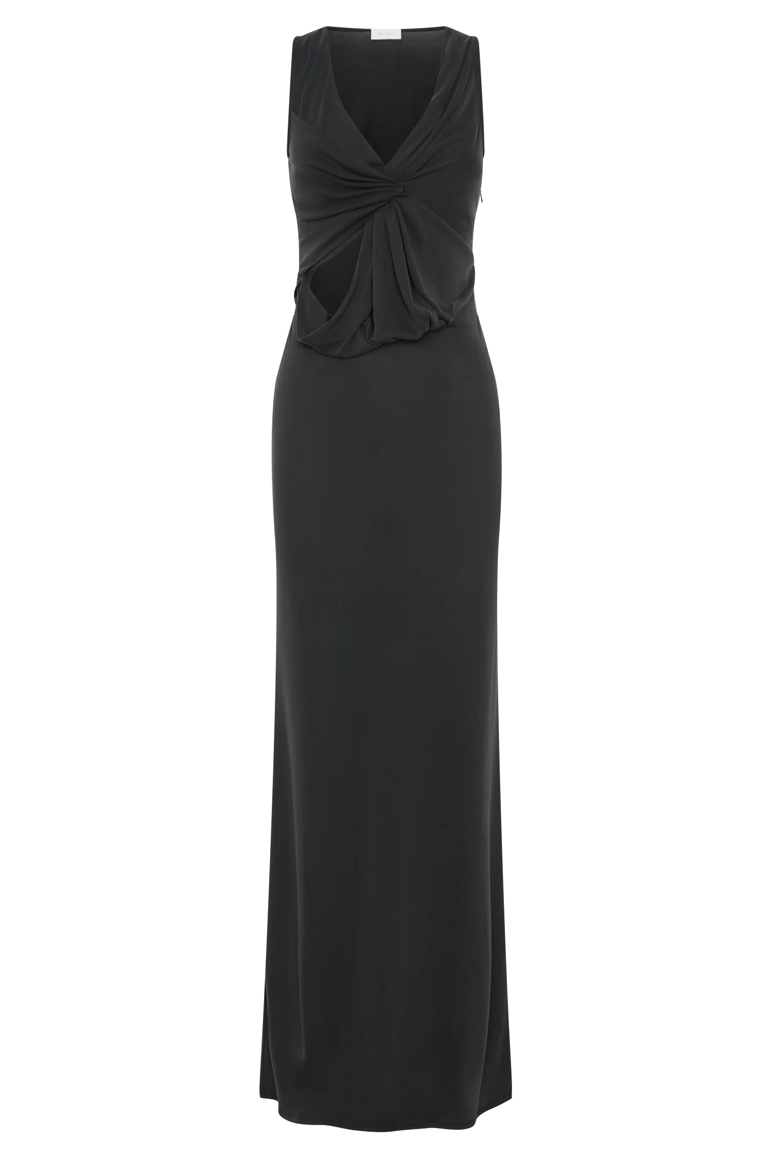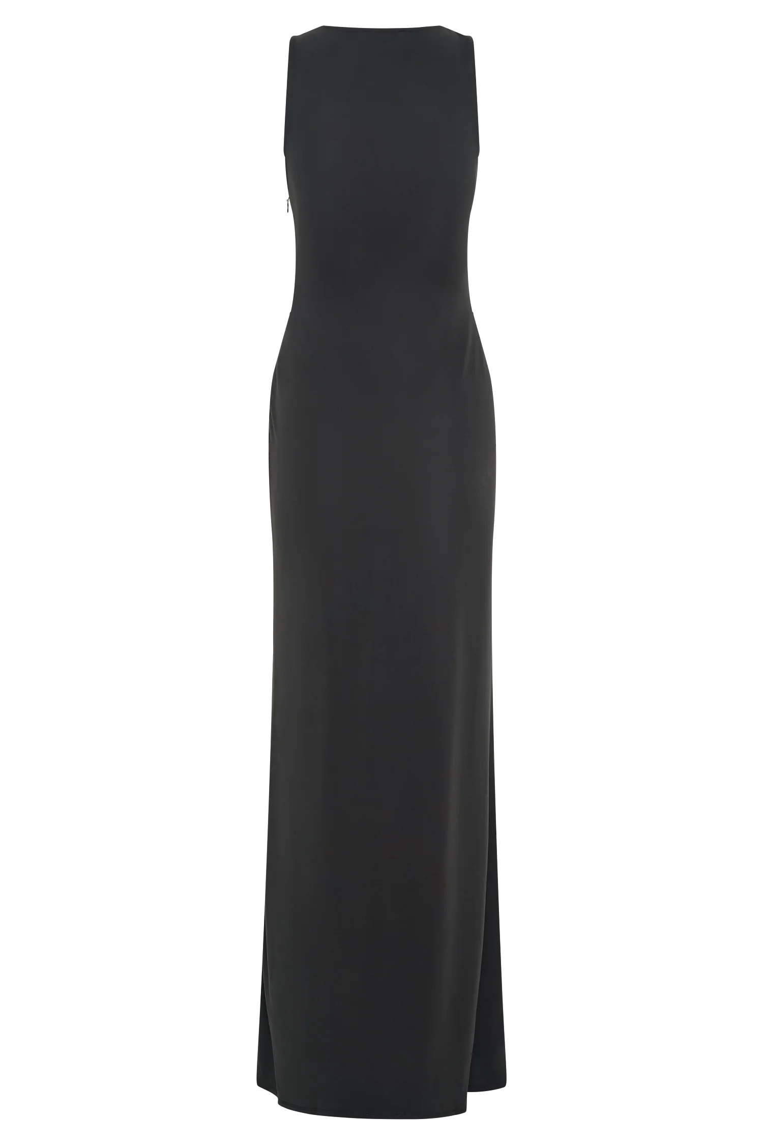 The KASSIDY Peached Jersey Maxi Dress exudes effortless sophistication with its modern twist front neckline and dramatic draped front cutout. Designed to highlight your curves, this sleeveless bodycon dress offers a flattering, form-fitting silhouette that skims your figure beautifully. The maxi length adds an elegant finish, making it the perfect choice for evening events or any occasion where you want to stand out. Crafted from soft peached jersey, this dress combines comfort and style, offering a luxe feel while ensuring you look your best.