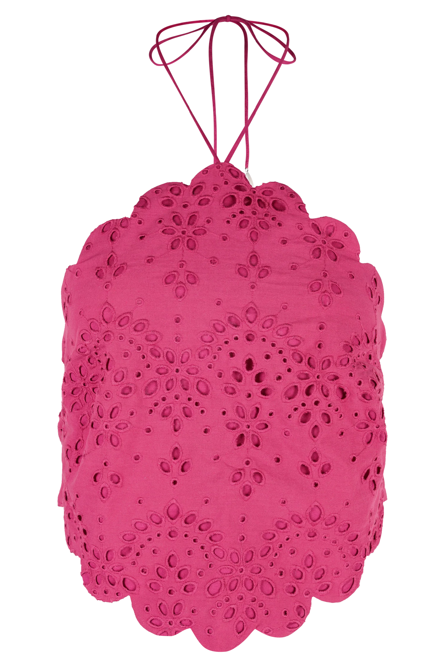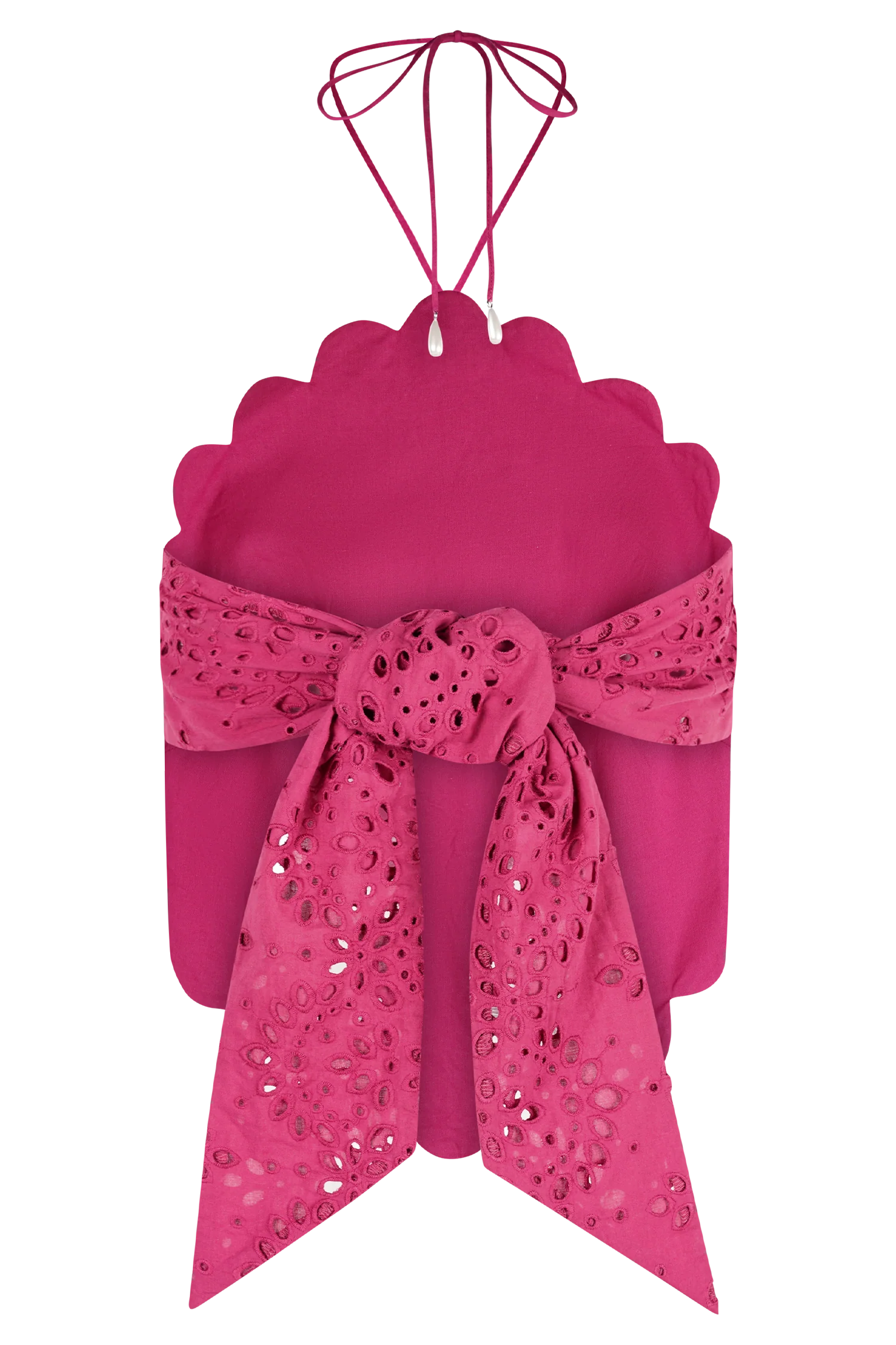 The KENSLEY Broderie Halter Top is a feminine essential crafted for warm-weather days and effortless elegance. Featuring a halter neckline with delicate rouleau ties and a scalloped edge, this top combines intricate broderie with a soft, structured silhouette. A shirred back panel ensures a comfortable, flexible fit, while the lined bodice adds coverage and ease. Pair with the for a romantic, coordinated set perfect for garden parties, long lunches, and sunlit getaways.