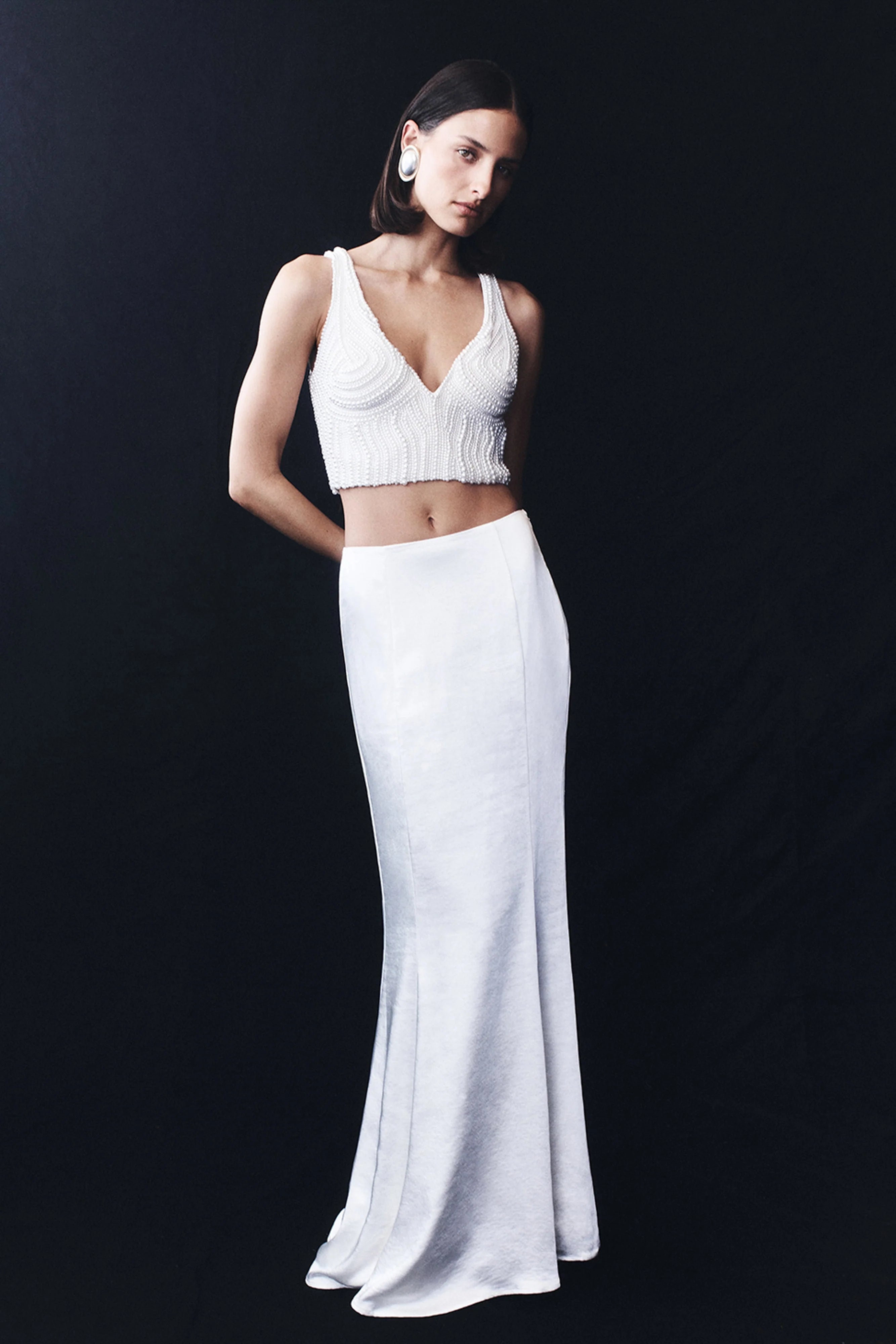 The KHLOE Satin Fishtail Maxi Skirt is the epitome of refined glamour. Designed with a flattering high-waisted fit, this silhouette-skimming piece flows seamlessly into a dramatic fishtail hem, creating elegant movement with every step. The luxe satin fabrication enhances its fluidity, while the maxi length adds a timeless touch. Unlined for a lightweight feel, the Khloe skirt pairs effortlessly with the for a look that’s equal parts sophisticated and statement-making—perfect for evening events, bridal celebrations, or any occasion that calls for effortless elegance.