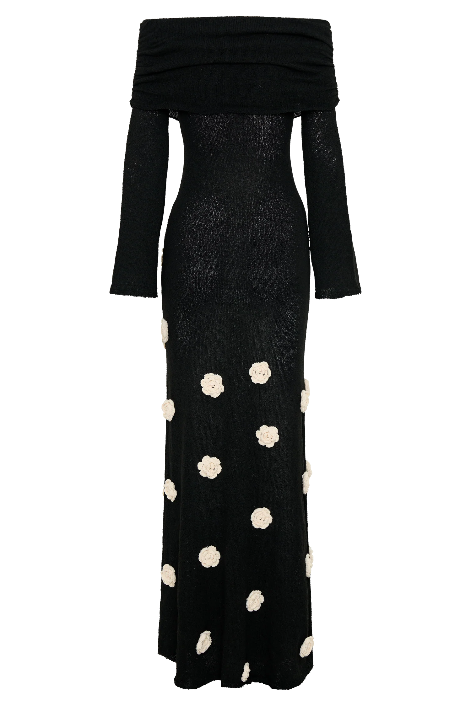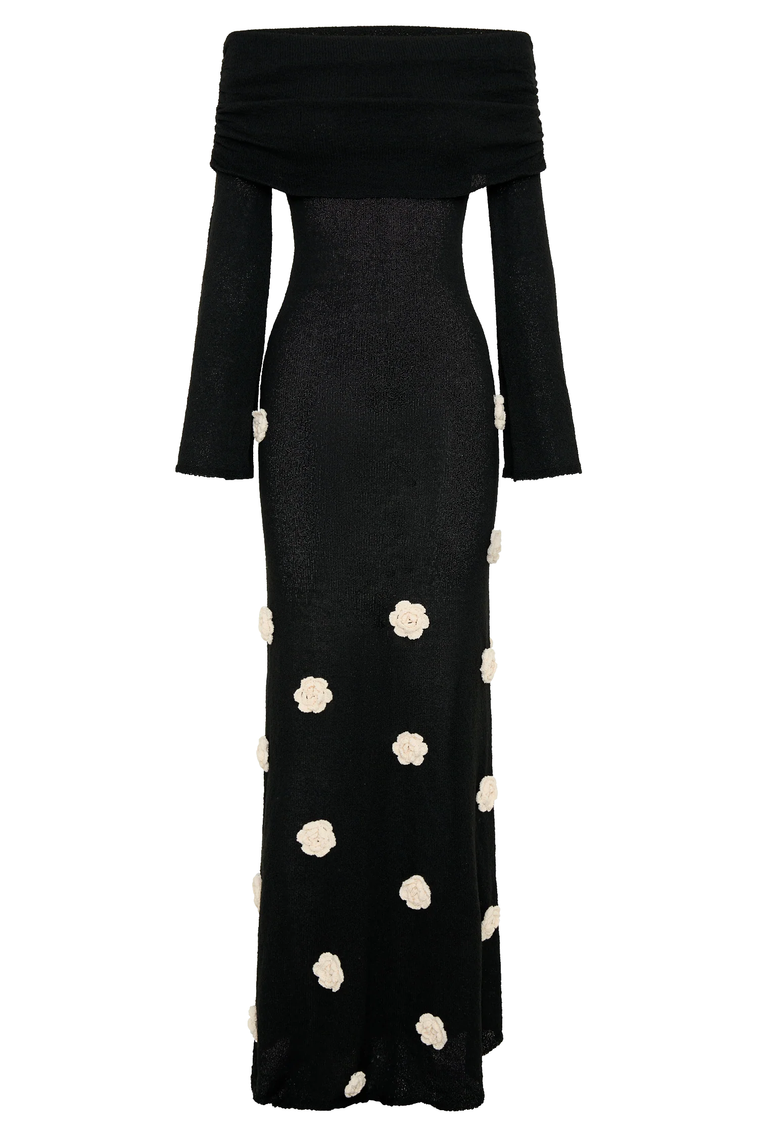 The KIKI Off Shoulder Knit Rose Maxi Dress exudes timeless sophistication. With an off-shoulder neckline and long sleeves, this bodycon dress beautifully contours the silhouette. The delicate flower applique adds a touch of romance, while the lightweight knit fabrication ensures a comfortable fit. Designed in a maxi length, this is a refined choice for your next rendezvous.