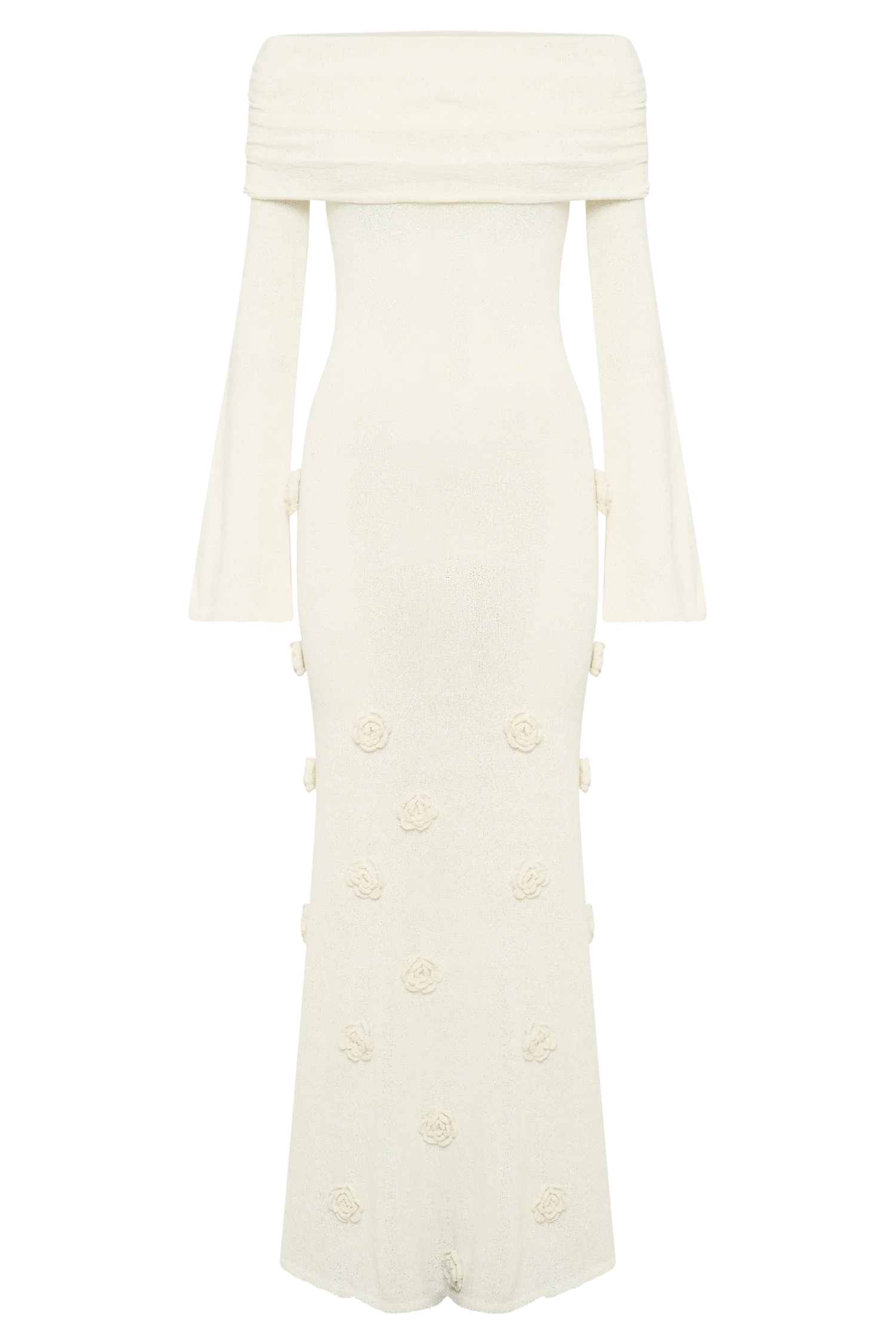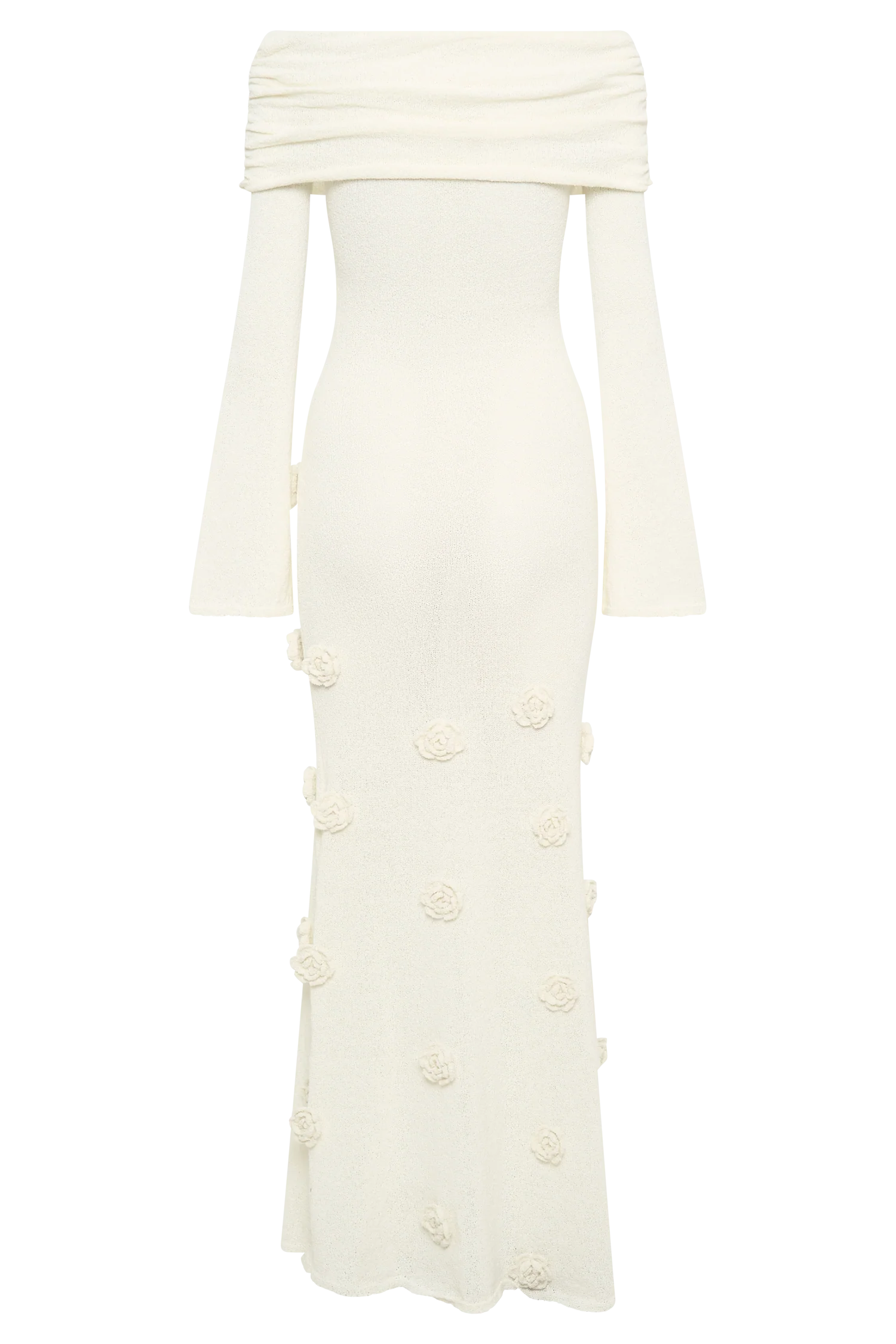 The KIKI Off Shoulder Knit Rose Maxi Dress exudes timeless sophistication. With an off-shoulder neckline and long sleeves, this bodycon dress beautifully contours the silhouette. The delicate flower applique adds a touch of romance, while the lightweight knit fabrication ensures a comfortable fit. Designed in a maxi length, this is a refined choice for your next rendezvous.