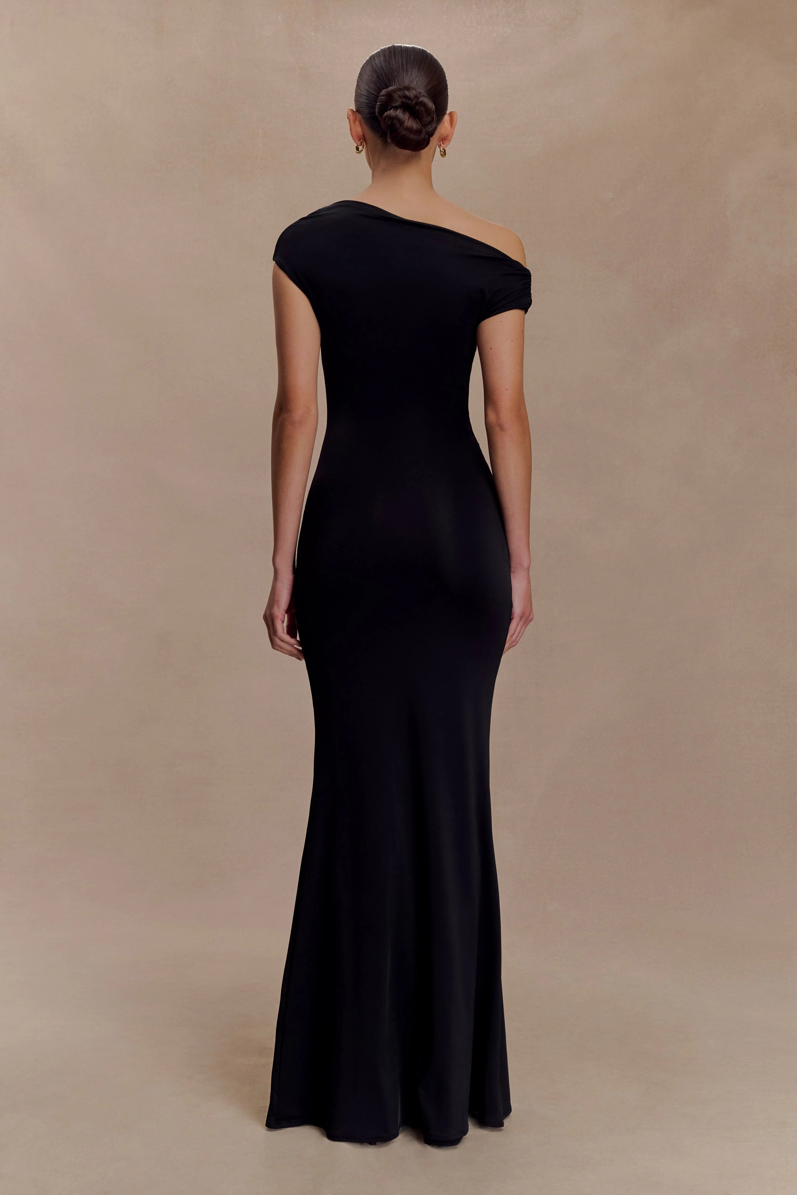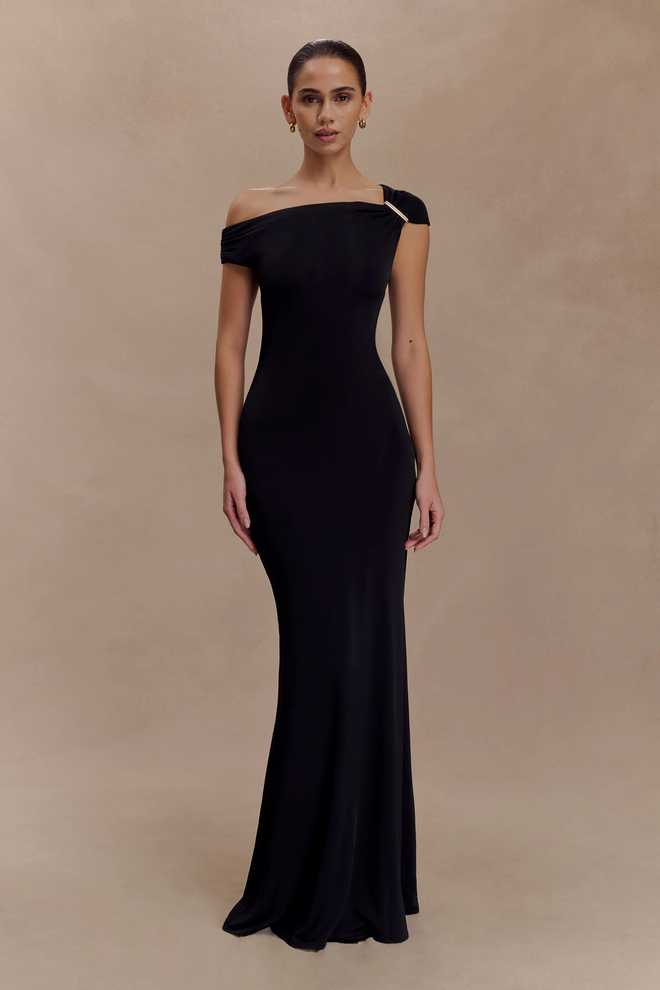 Make an unforgettable entrance in the KINSLEY Slinky Maxi Dress with Hardware, a show-stopping silhouette that hugs and highlights in all the right places. Featuring an asymmetrical neckline and gathered shoulder seams, this fitted style is adorned with gold hardware for a touch of refined edge. The maxi length flows into a fishtail hem, creating elegant movement with every step. Fully lined for a seamless fit, this dress is your ultimate plus-one for any elevated occasion.