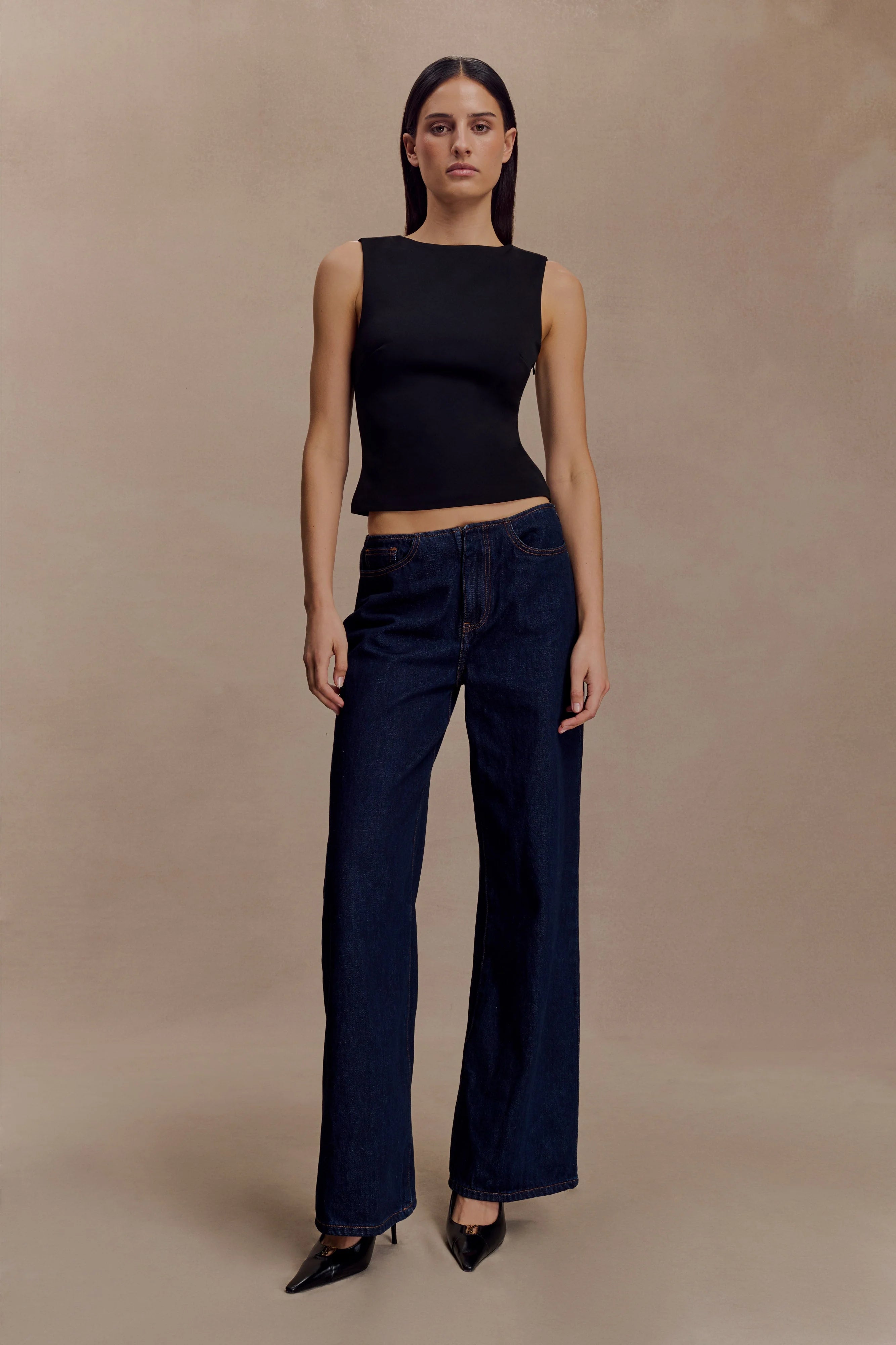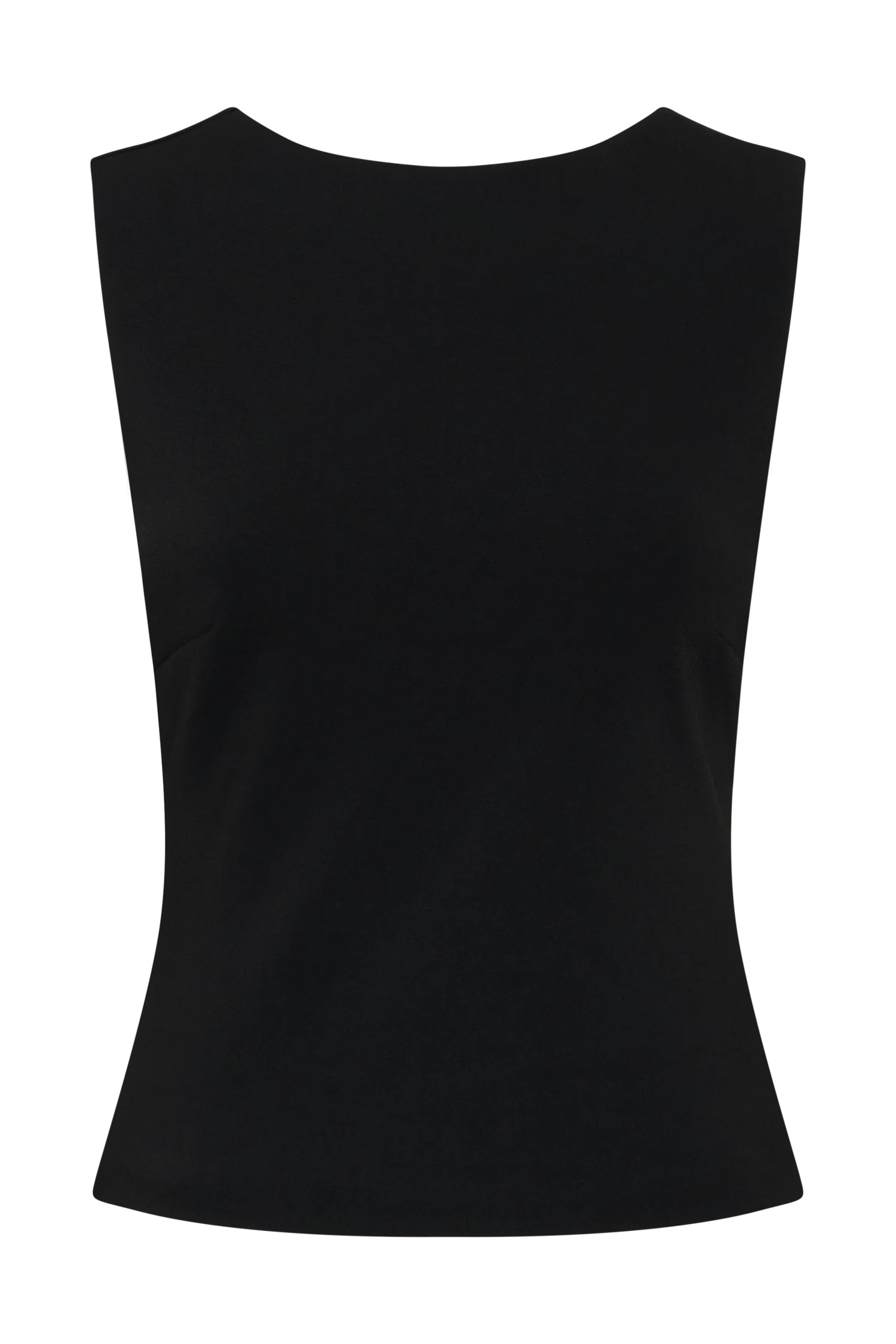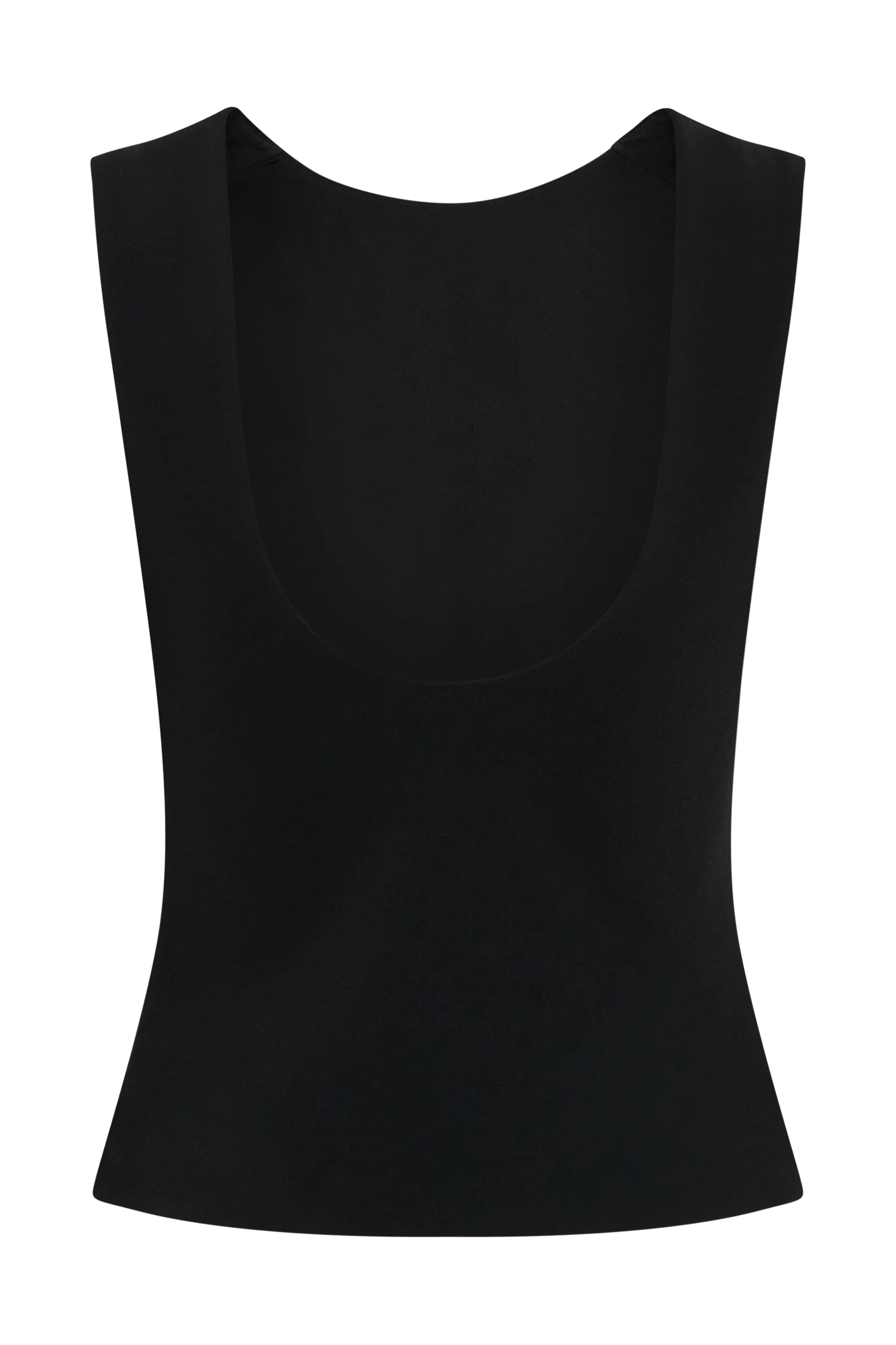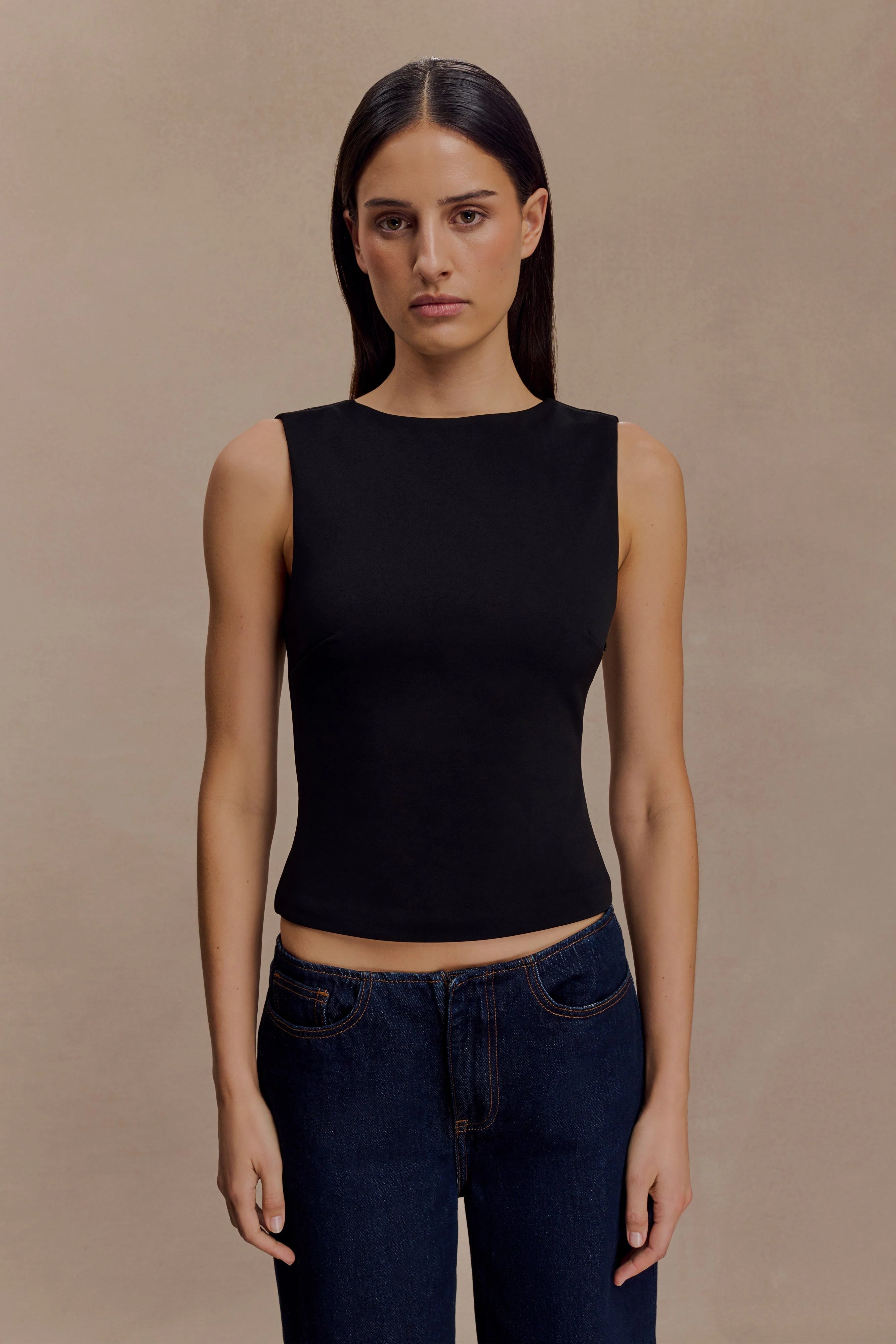 The KYRA Open Back Scuba Crepe Top is a sleek silhouette with a modern edge. Designed with a clean boat neckline and a fitted bodice, it sculpts the frame with effortless precision. The sleeveless cut keeps the front streamlined, while the open back creates a striking reveal. Fully lined for comfort, this top is the perfect balance of understated polish and contemporary allure.