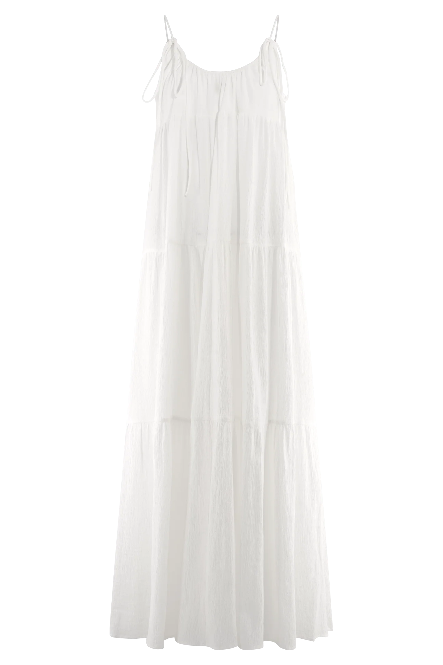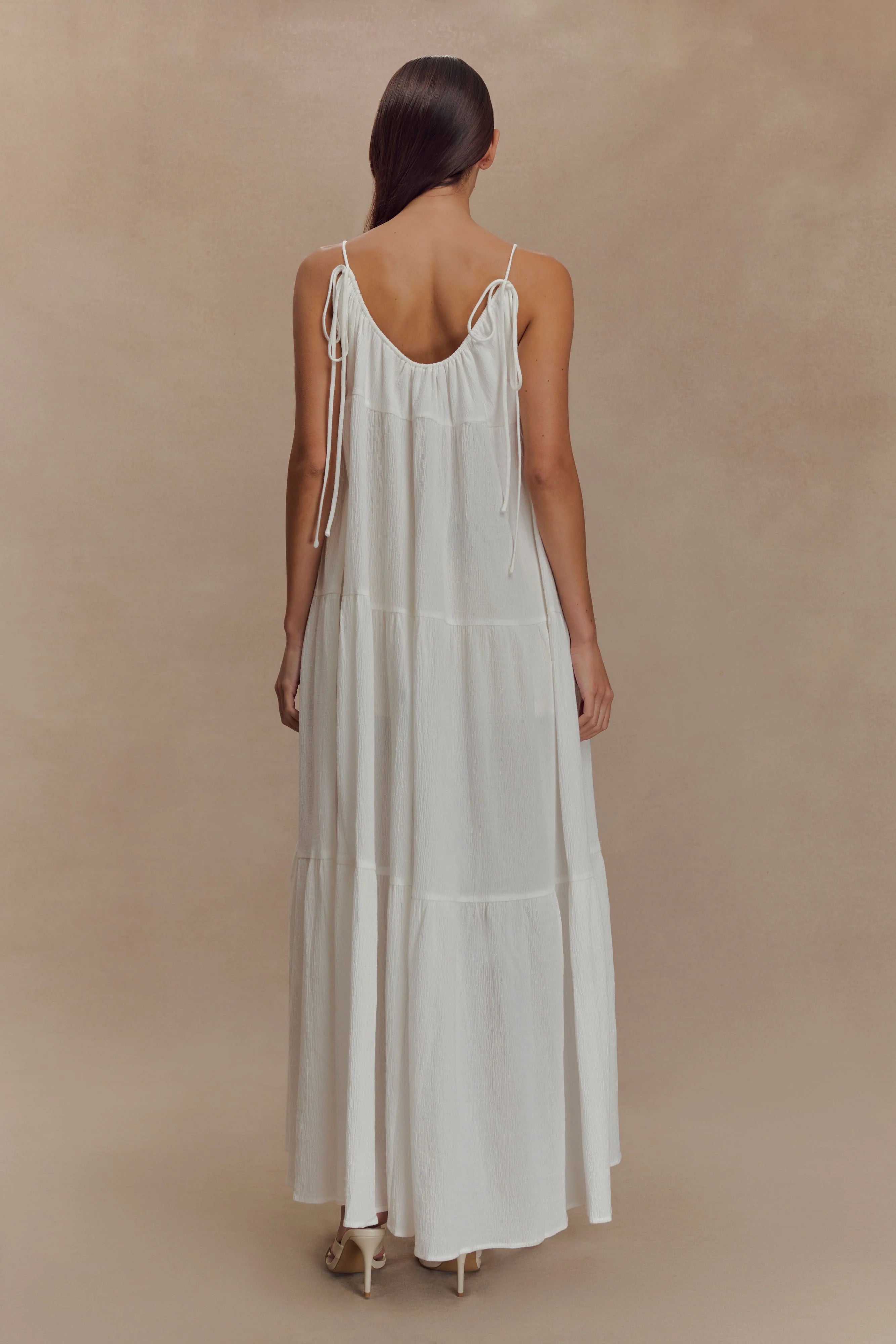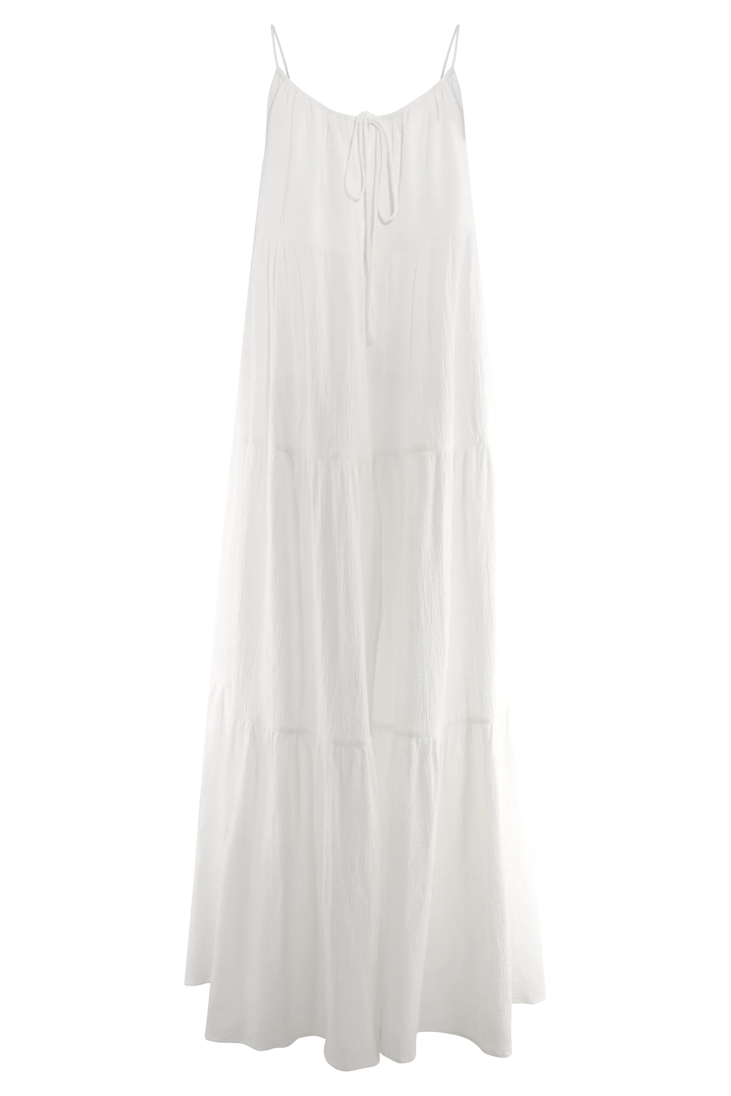 The LENNY Front Tie Top is your go-to for relaxed romance with a playful twist. Designed with a gathered neckline and delicate spaghetti straps, this maxi silhouette features a tie-front detail and softly gathered tiers that flow into a full hem. The relaxed fit makes it perfect for sun-soaked days and balmy evenings alike—just add sandals and you’re set.