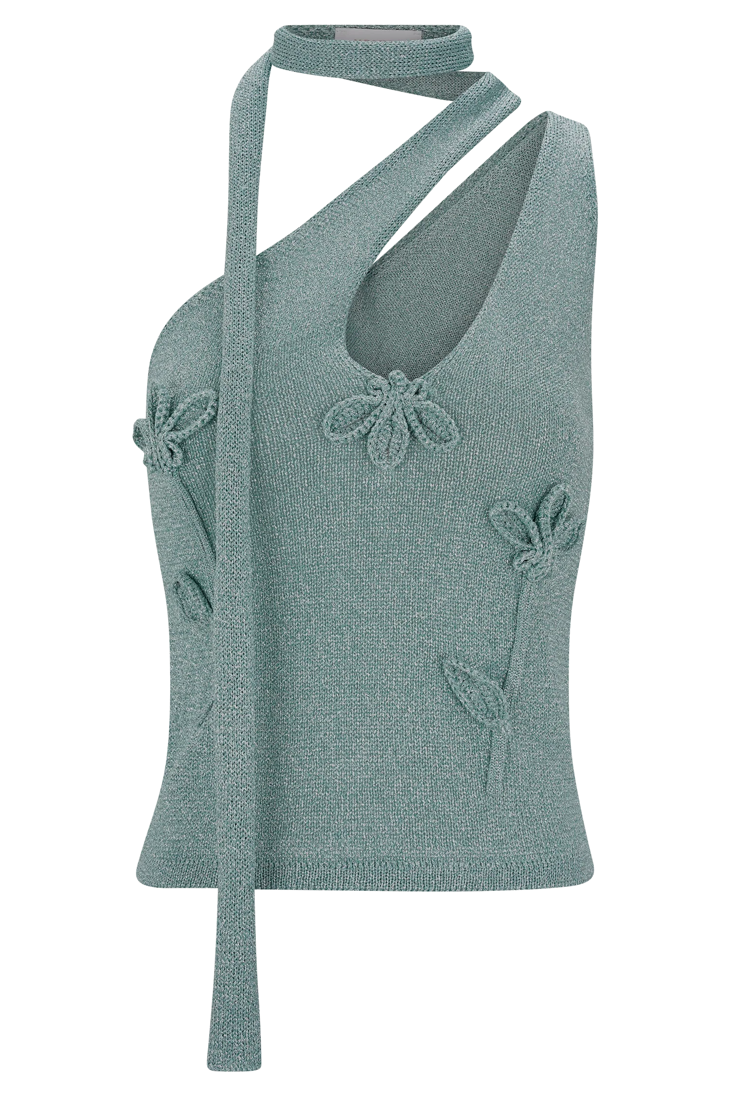 The LEONE One Shoulder Metallic Knit Top is designed to stand out in sun-drenched moments and after-dark glow. With an asymmetrical cutout neckline and a dramatic wrap-around neck sash, this longline silhouette is crafted in a lightweight metallic knit that catches the light with every movement. A delicate floral decal adds a romantic focal point, while the one shoulder design brings modern allure. Pair with wide-leg trousers or a flowing skirt for an effortlessly elevated resort look.