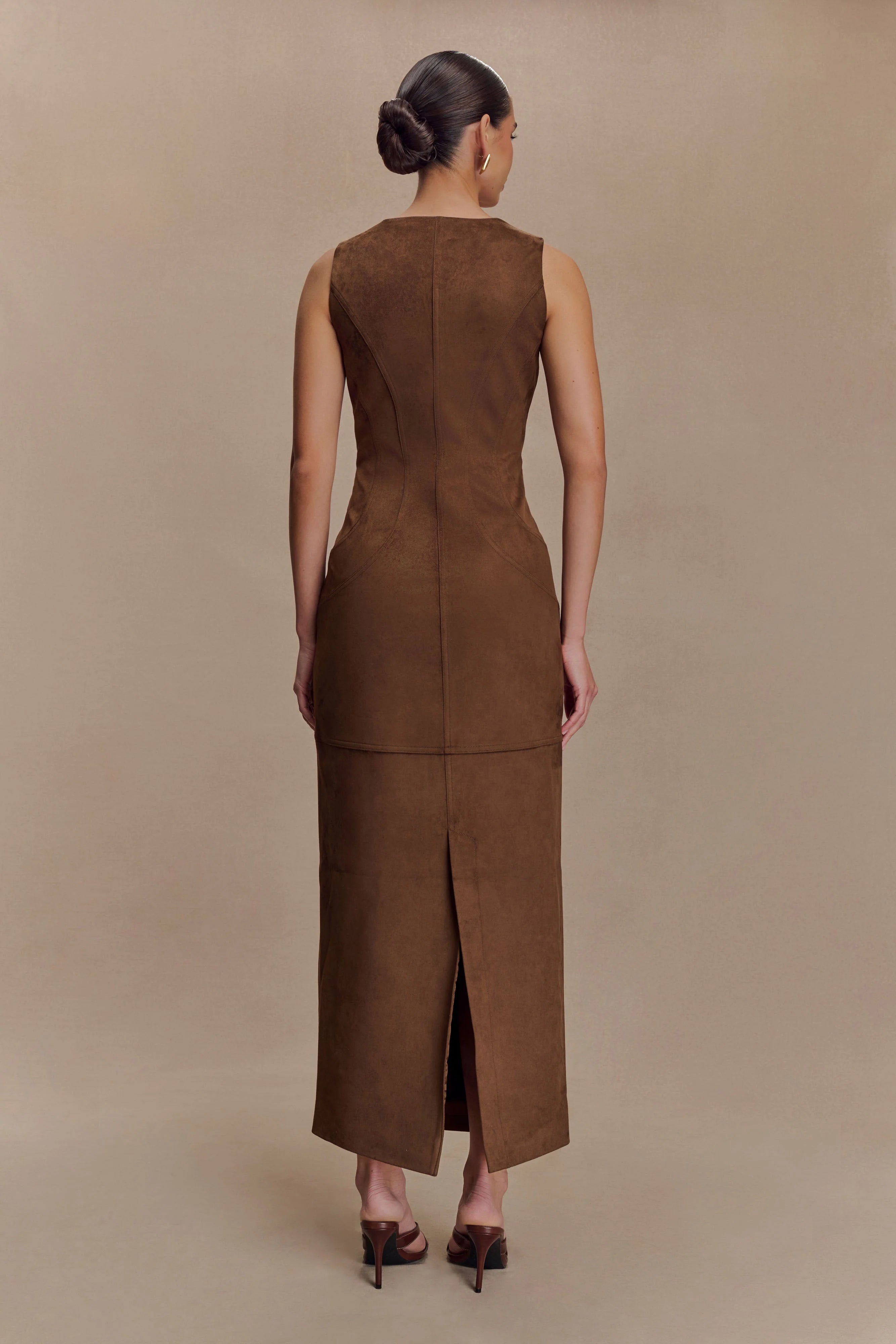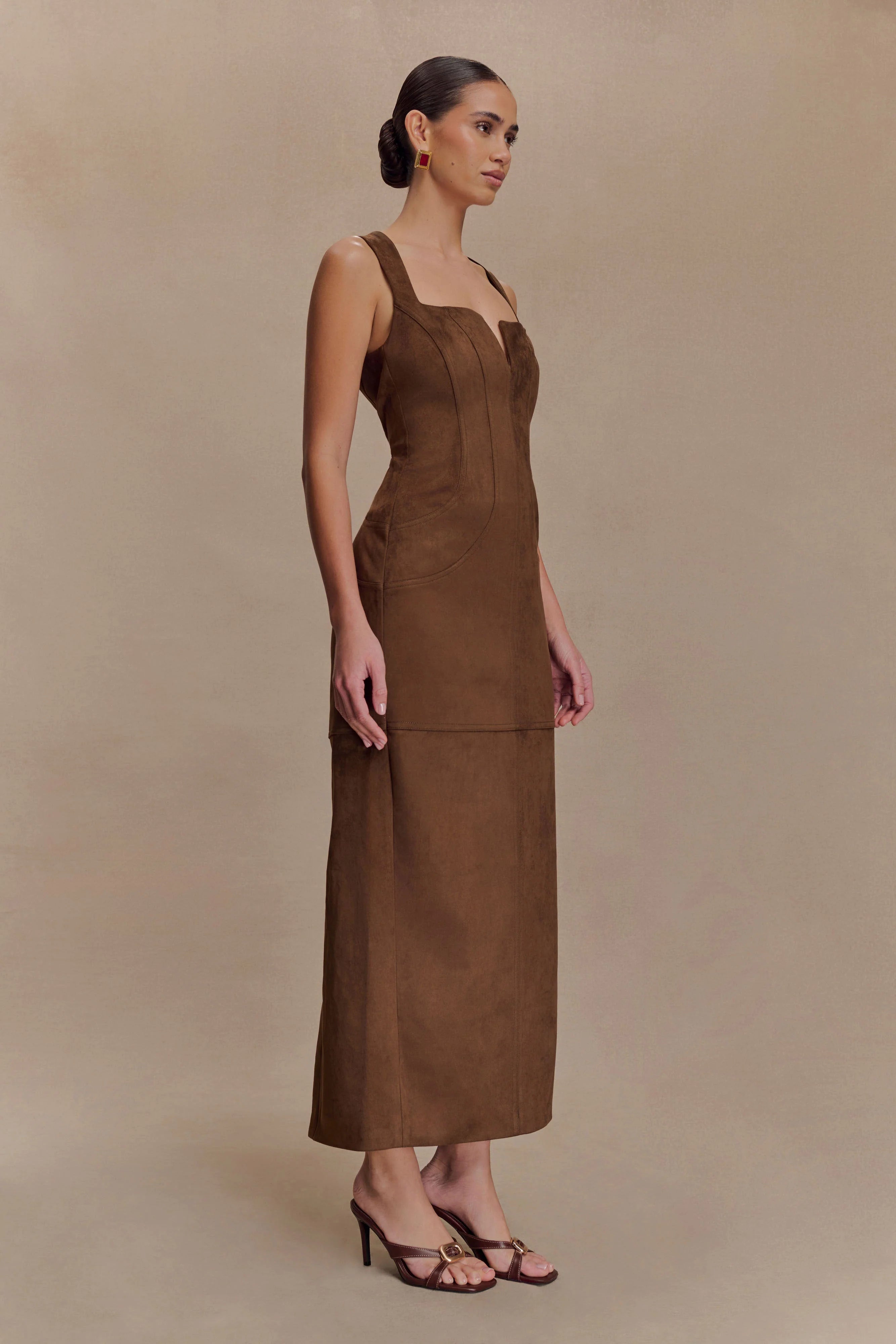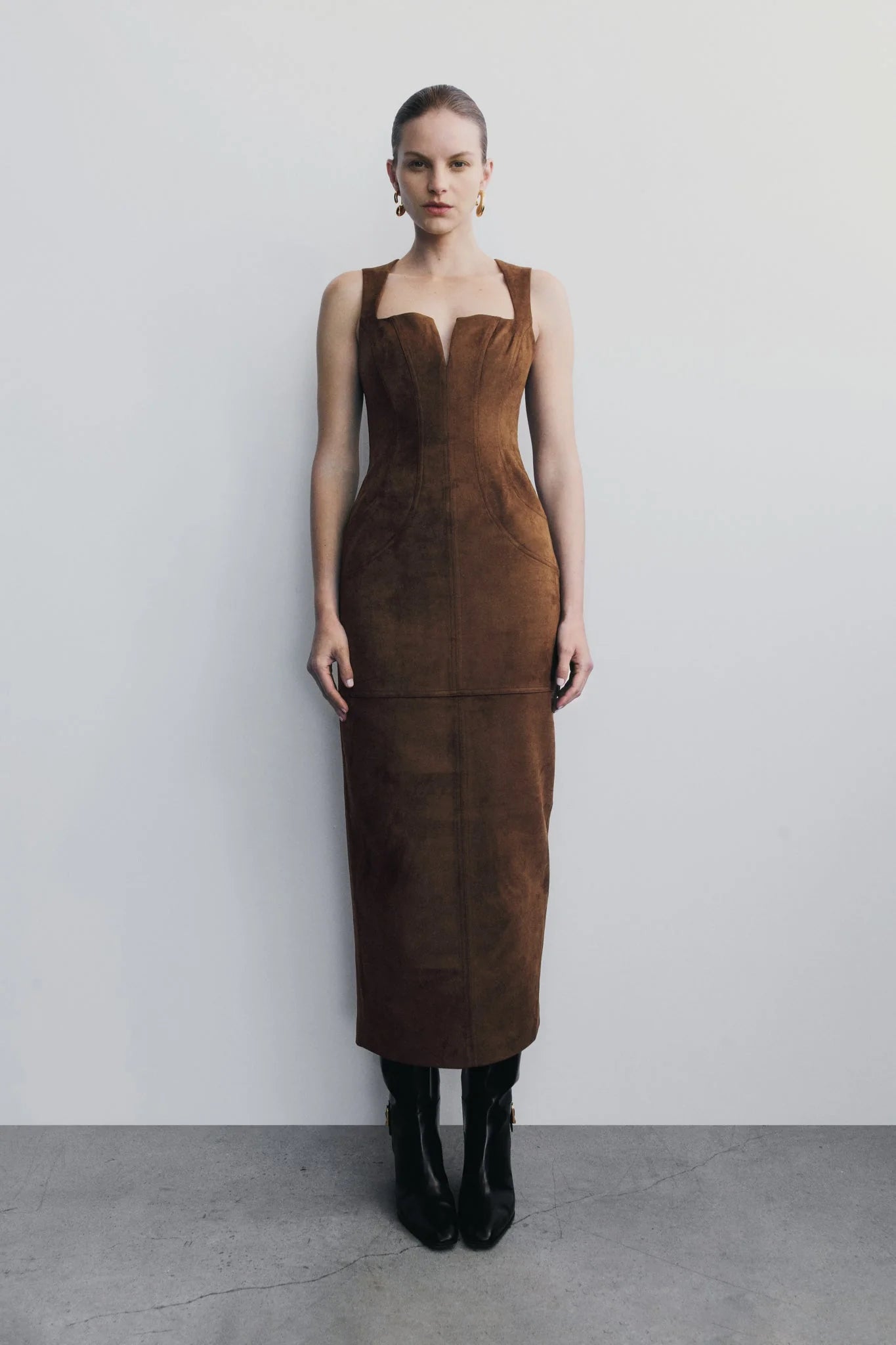 The LIAM Faux Suede Maxi Dress blends sleek tailoring with tactile appeal for an effortlessly modern look. Designed in a buttery faux suede with a structured bodice, this maxi silhouette contours the body with clean lines and refined softness. The strapless neckline highlights the shoulders, while the floor-grazing length elongates the frame. Perfect for day-to-night dressing, this dress brings understated drama and elevated texture to any occasion.