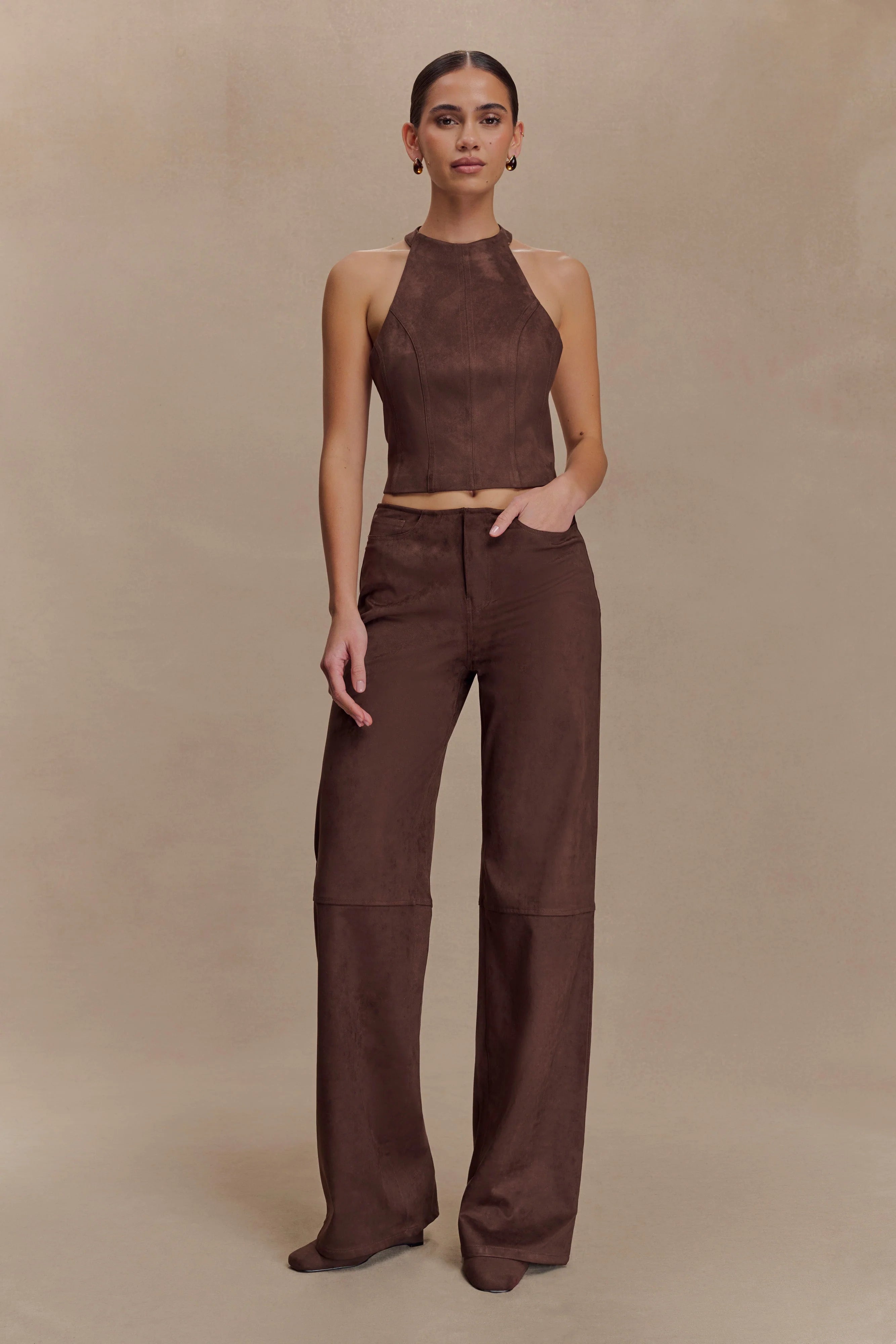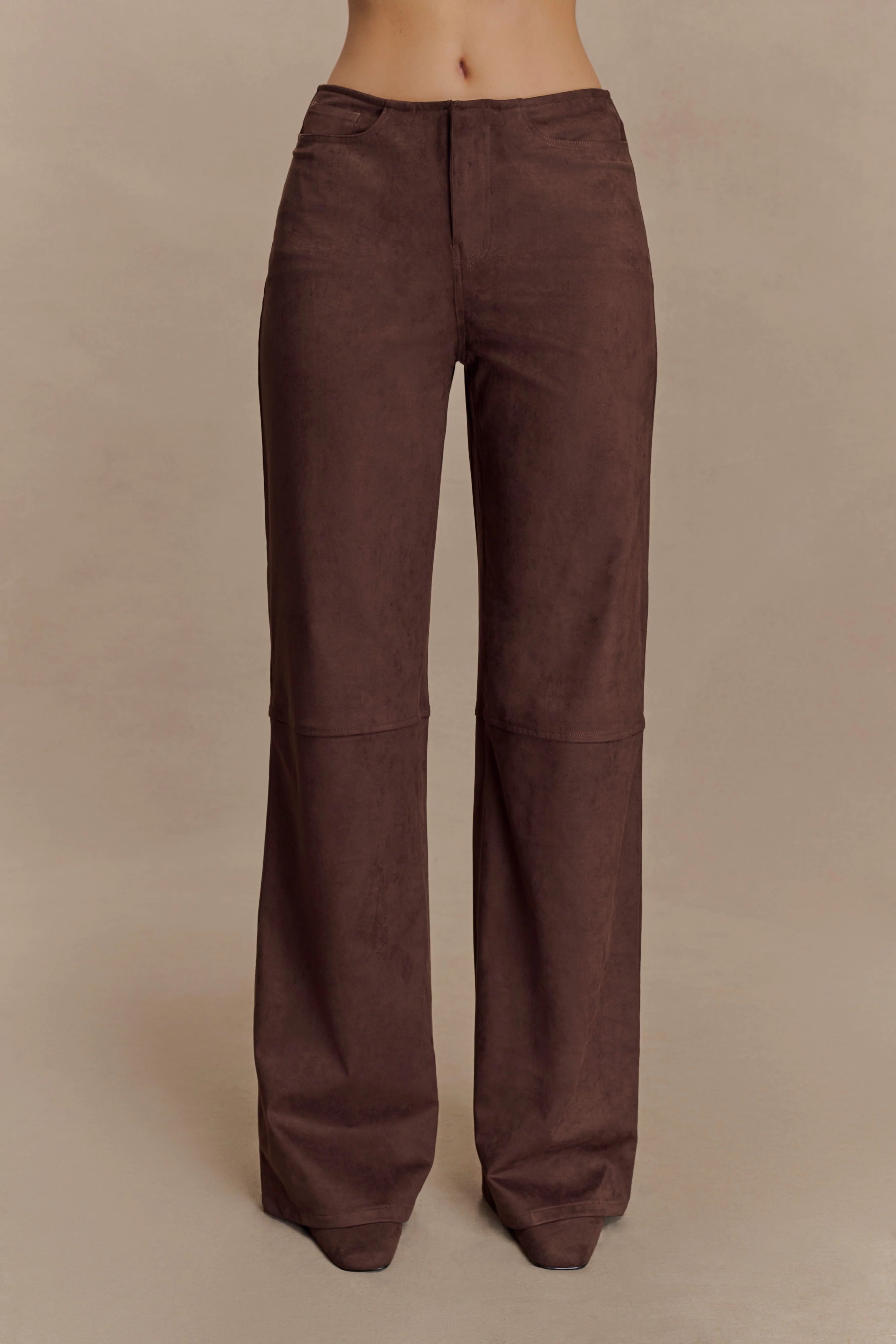 The LOGAN Faux Suede Pants bring modern minimalism to your wardrobe with a touch of softness. Designed in a sleek straight-leg silhouette, these mid-rise pants feature clean panel lines, a fly front closure, and practical front and back pockets. Crafted from supple faux suede, they offer a luxurious hand-feel while remaining effortlessly wearable. With no waistband for a seamless fit, these pants are made to pair with structured tops or soft layers for a refined, off-duty look that transitions from day to night with ease.