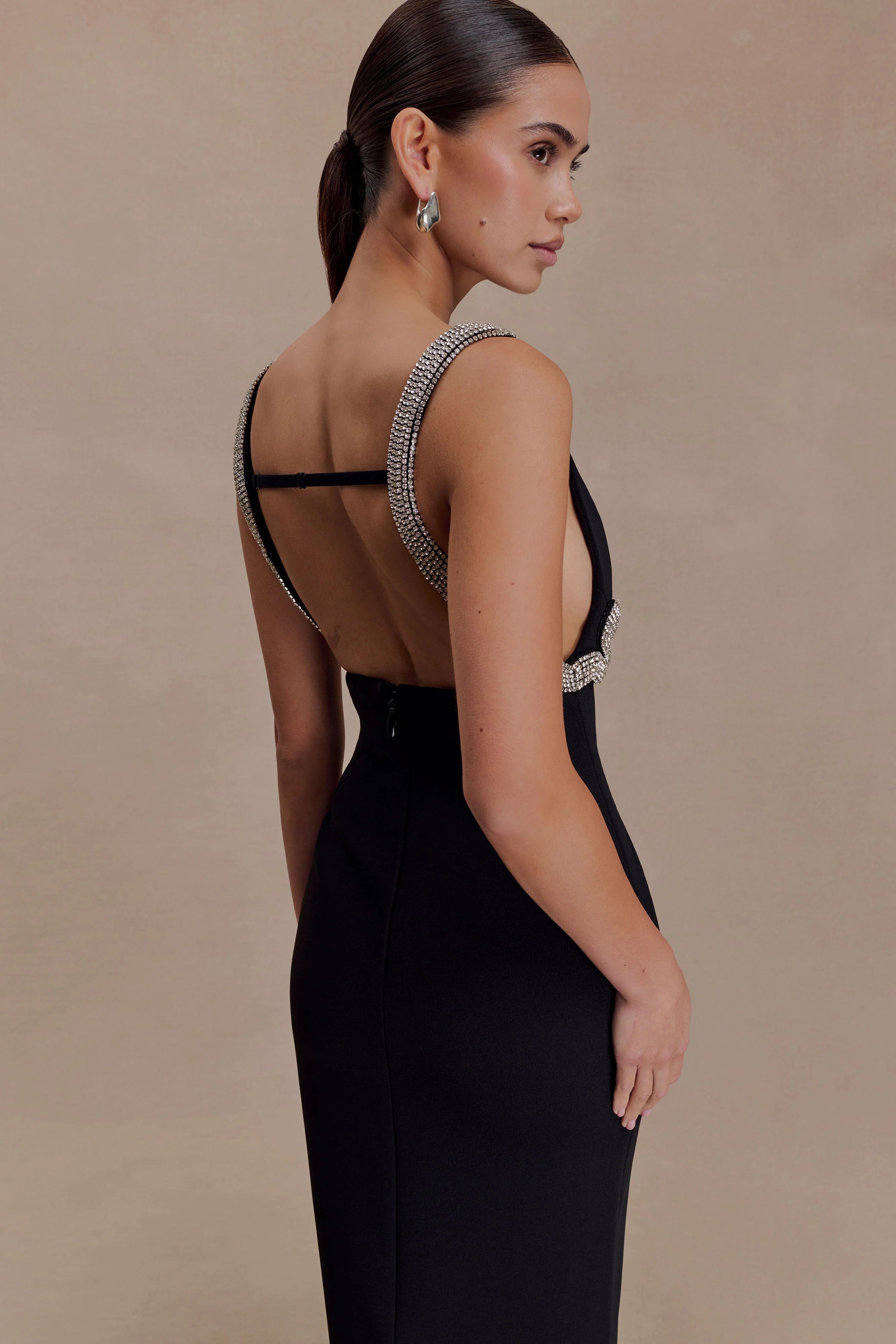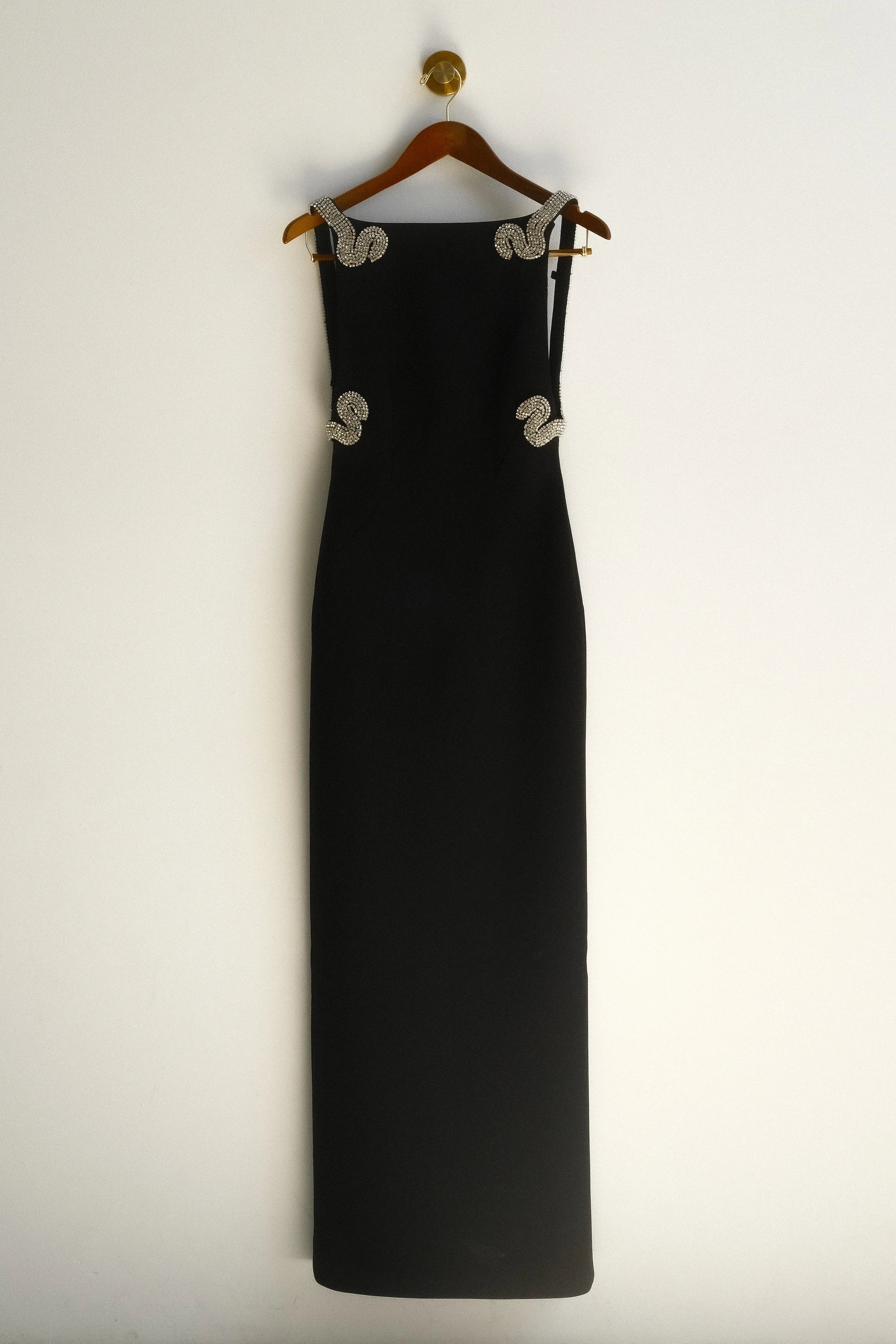 The LORDE Embellished Crepe Maxi Dress redefines minimal glamour with architectural precision and luminous detail. Designed with a high, straight neckline, it features an embellished strap that curves elegantly across the front body — a statement focal point that catches the light with subtle sophistication. The open back is secured by an adjustable strap for a confident fit, while the fully bonded crepe fabrication sculpts the silhouette to perfection. Fully lined in stretch matte fabric for comfort and movement, this bodycon design is finished with a centre back split and invisible zip for ease and refinement.