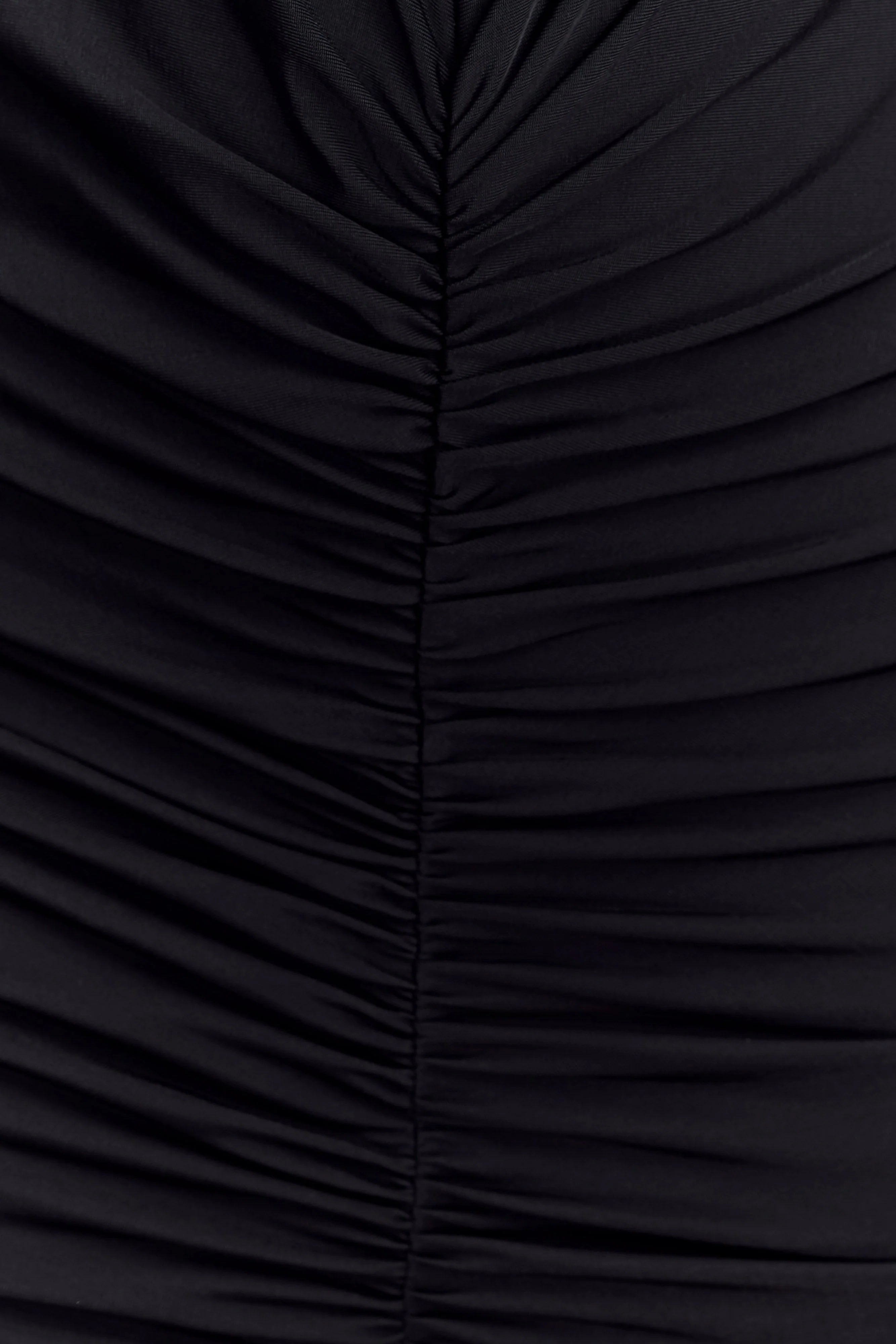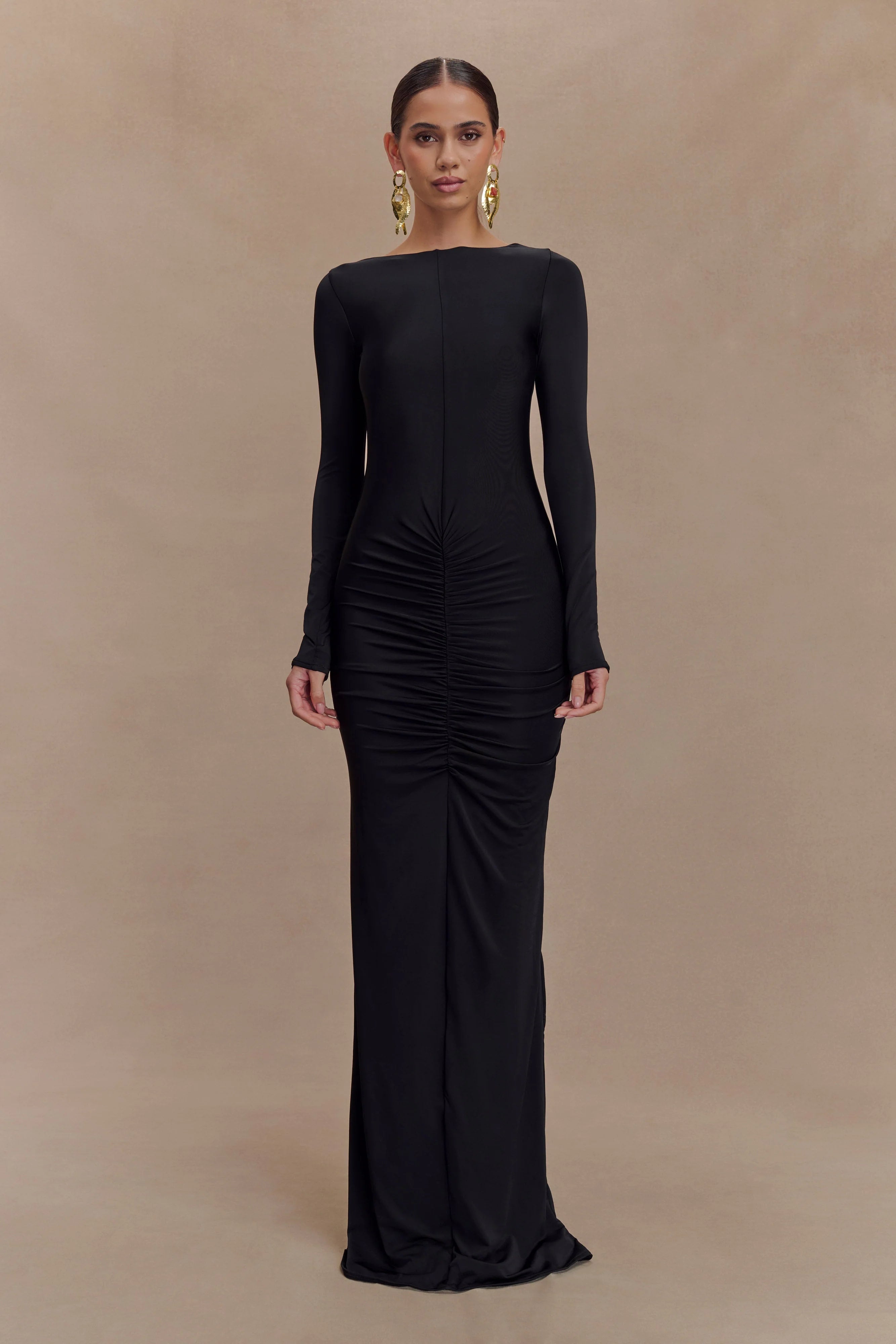 The LOUISA Long Sleeve Slinky Maxi Dress is an elegant statement in modern minimalism. Designed with a graceful boat neckline and a dramatic low V-back, this fully lined silhouette hugs the body with a sleek, fitted shape. Long sleeves and gathered shoulder details add soft volume, while a ruched hip brings subtle texture and movement. Finished in a floor-grazing maxi length, this dress is made for evenings that call for quiet drama and effortless sophistication.