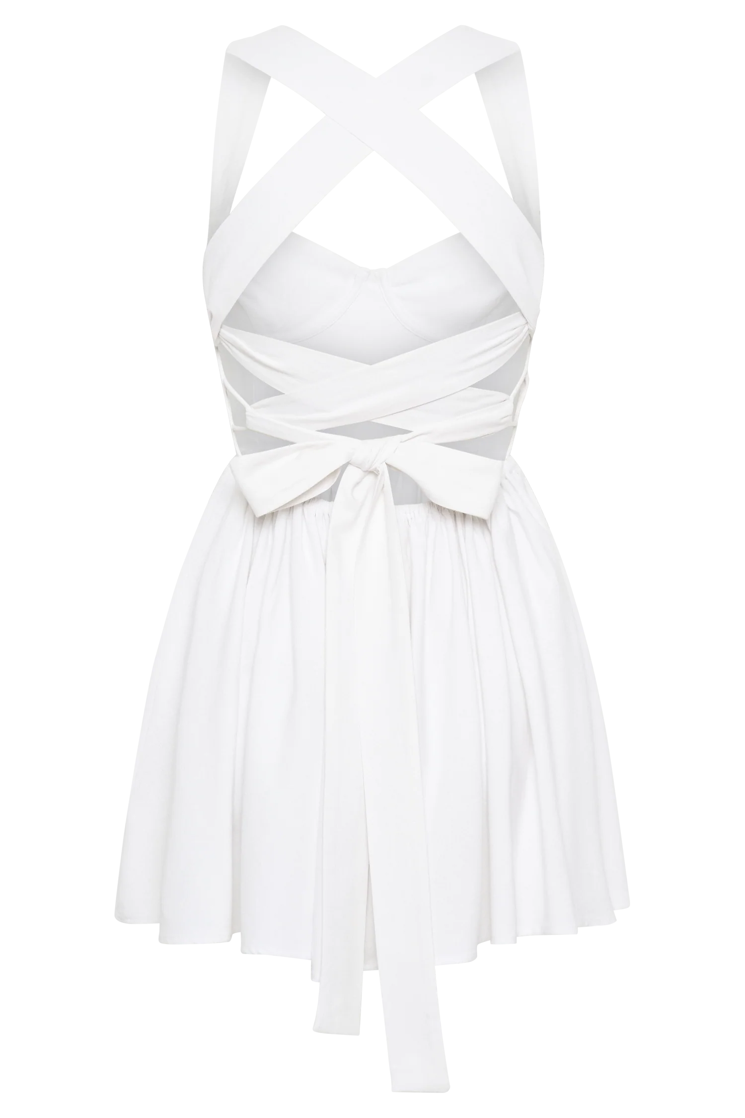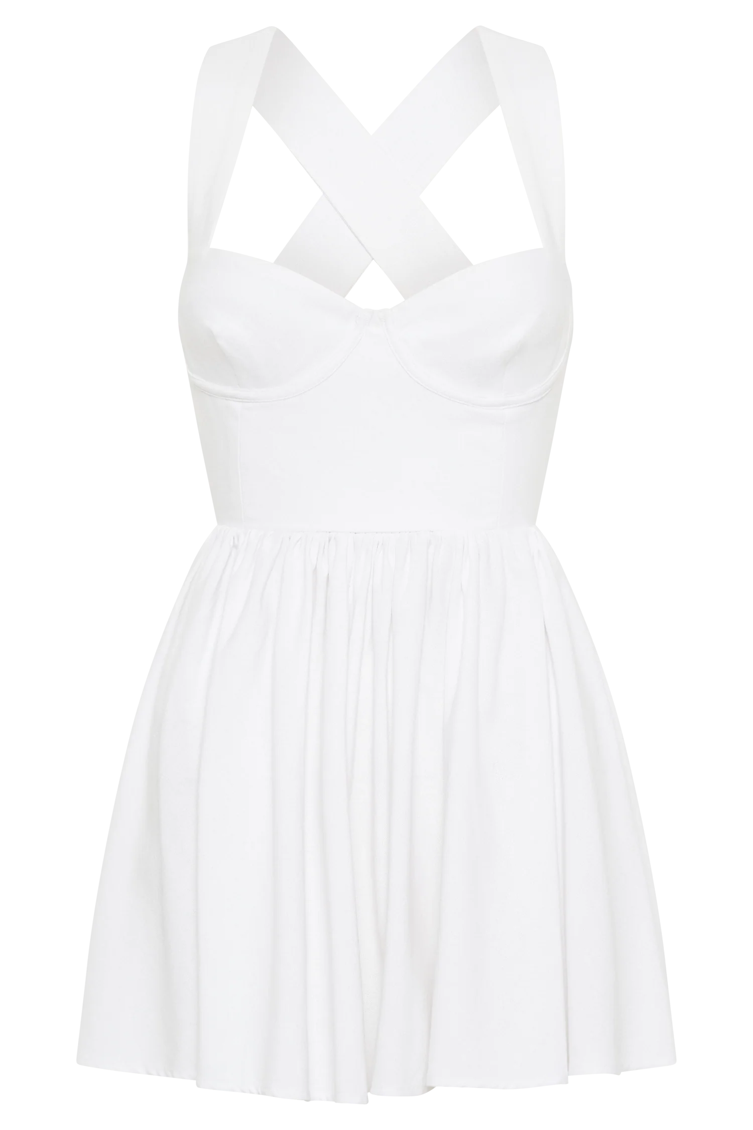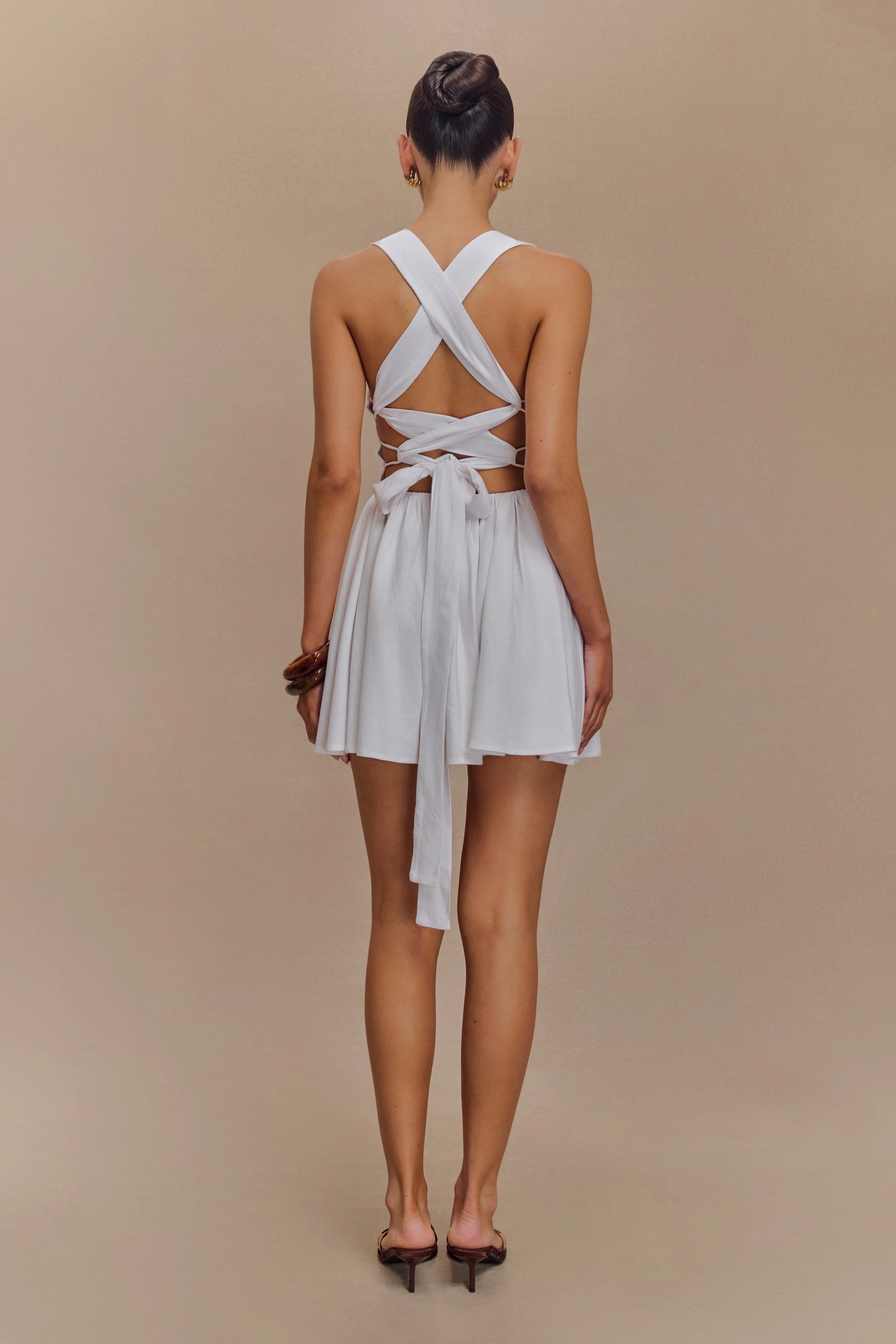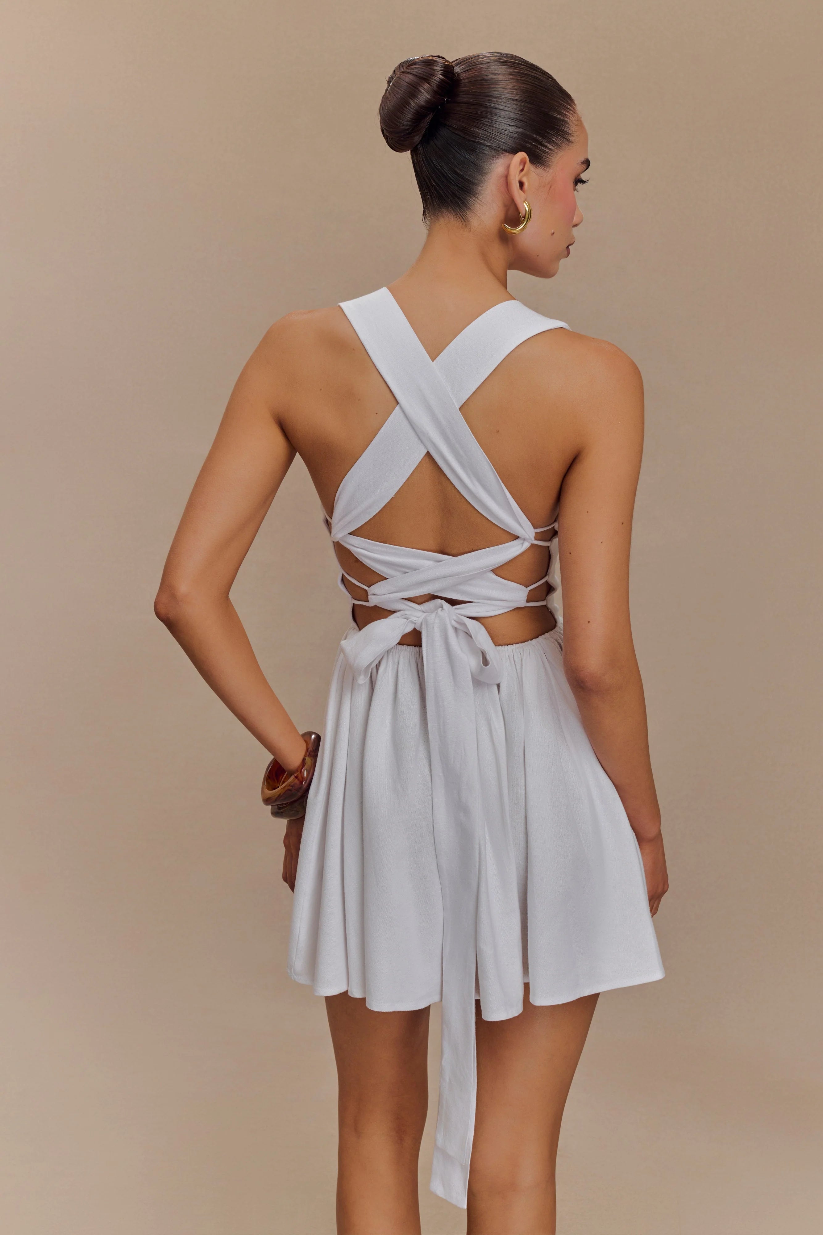 The LOZ is a linen dress that features a sweetheart neckline, finished with adjustable tie-back straps and a criss-cross back detail. Made from lightweight and breathable fabric, this mini-length dress also boasts an elasticated back waist, creating a gathered A-line skirt that flatters the body.