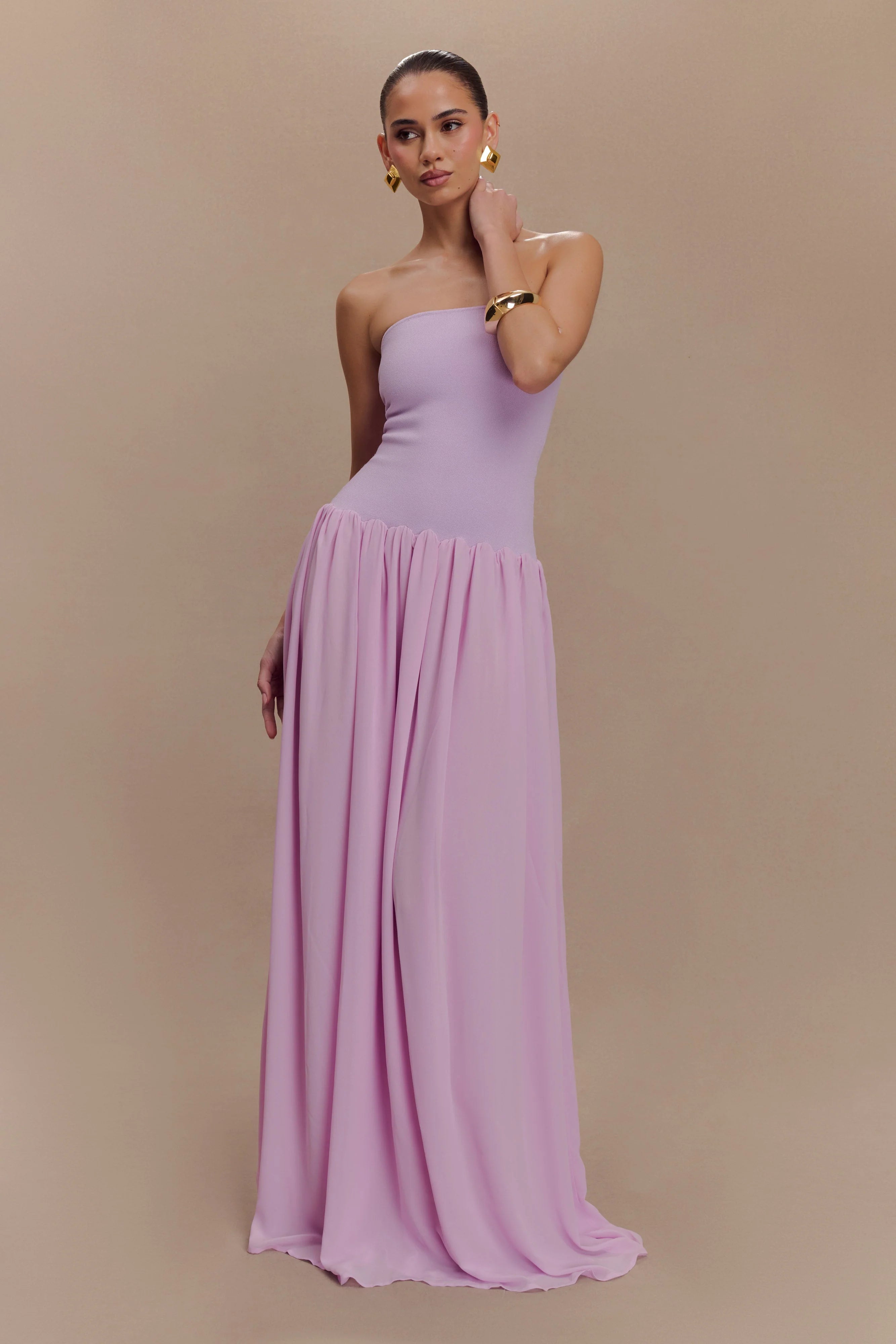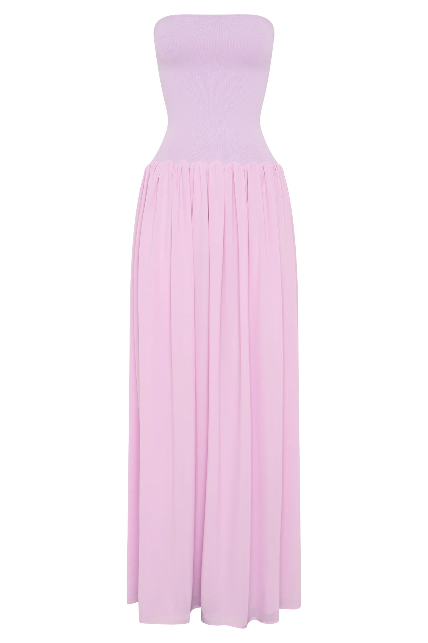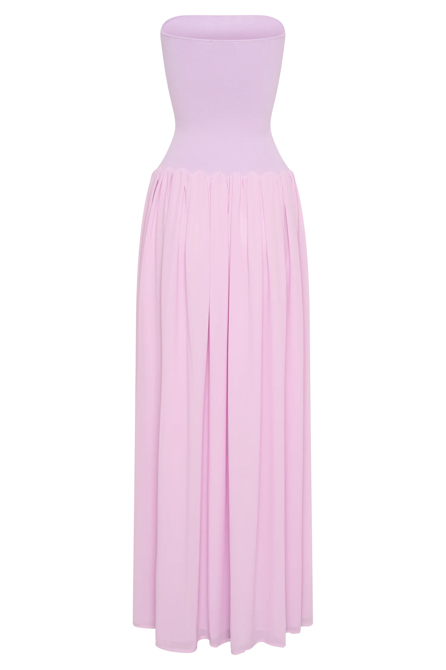 Float effortlessly into elegance with the LYANNA Knit and Chiffon Strapless Maxi Dress, a perfect blend of structure and flow. The strapless design highlights your shoulders and décolletage, while the knitted, fitted bodice hugs your silhouette for a flattering fit. A unique zig-zag hem adds a modern touch to the bodice, creating a striking contrast with the airy chiffon maxi skirt that drapes beautifully to the floor. Whether styled for weddings, evening events, or special occasions, this dress is a statement of grace and sophistication.