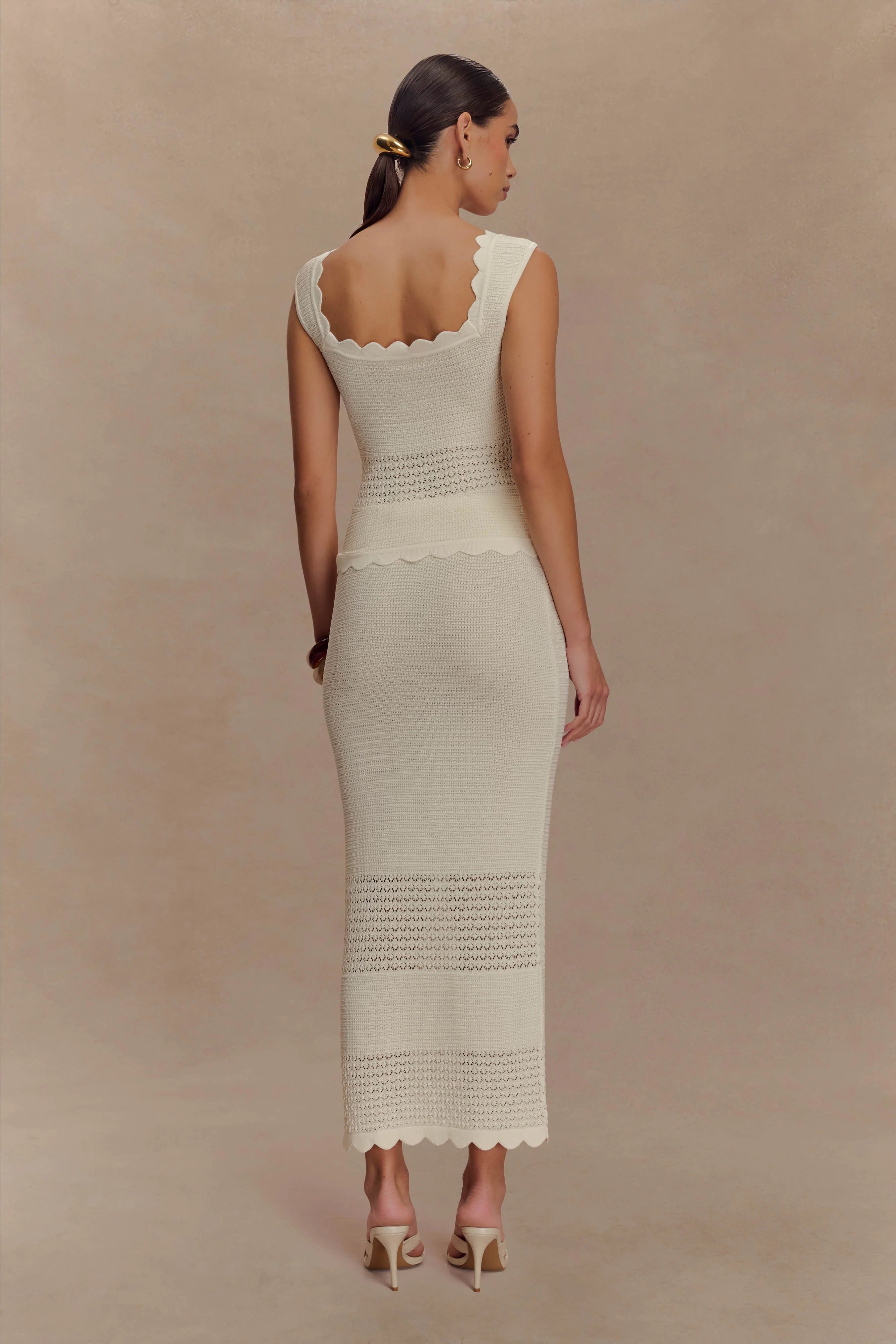 The MADELINE Scallop Knit Top is a delicate, day-ready piece designed to blend texture with timeless charm. Featuring a flattering square neckline, scalloped edges, and a rounded front hem, this longline silhouette is crafted in a detailed pointelle knit for a lightweight, breathable feel. The functional button front adds versatility, while the unlined finish keeps it effortlessly easy. Pair with the for a matching set that’s soft, refined, and perfect for any daytime occasion.