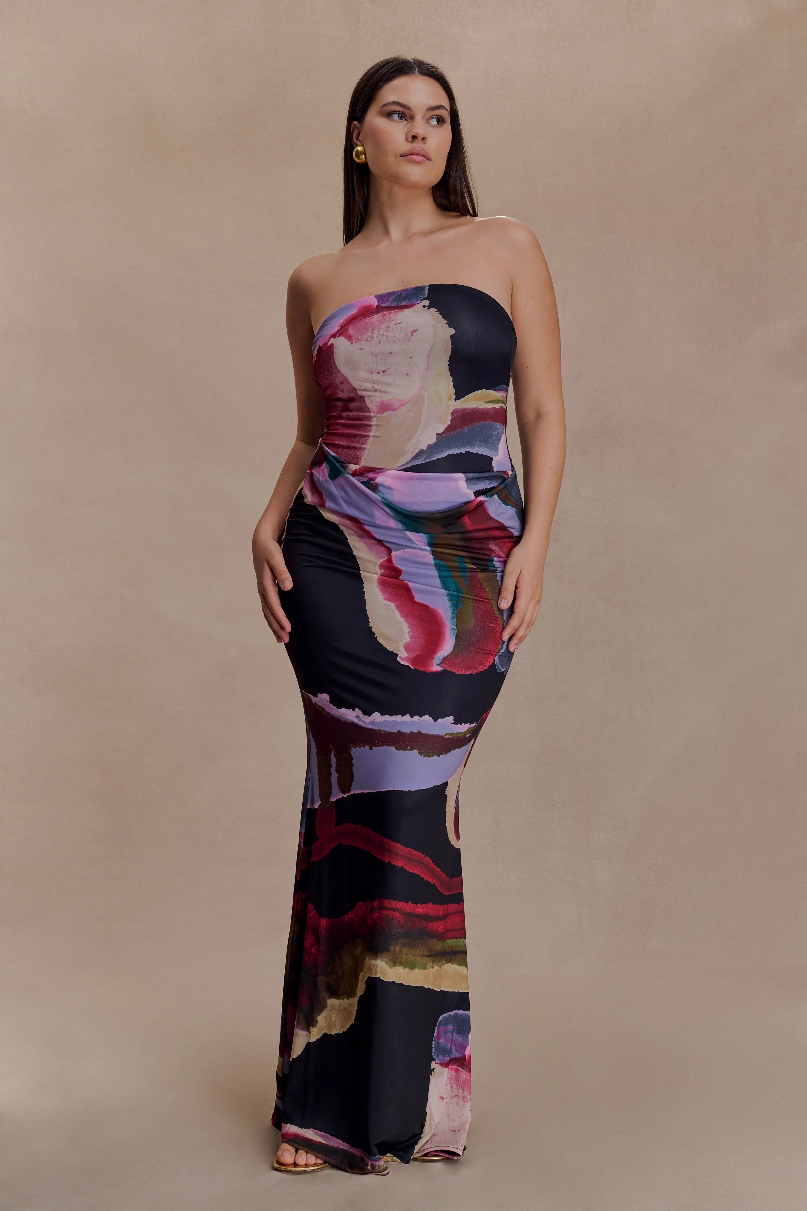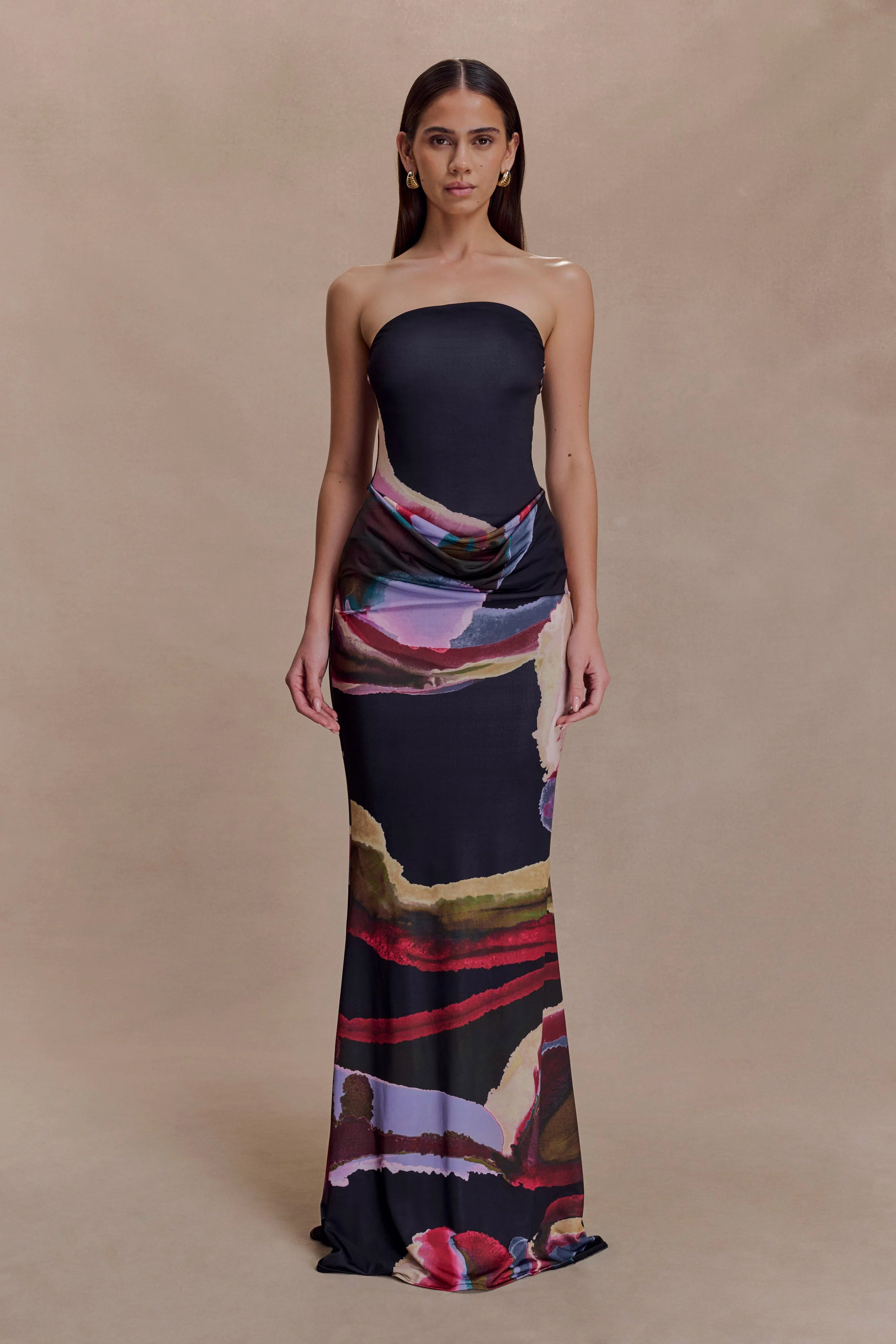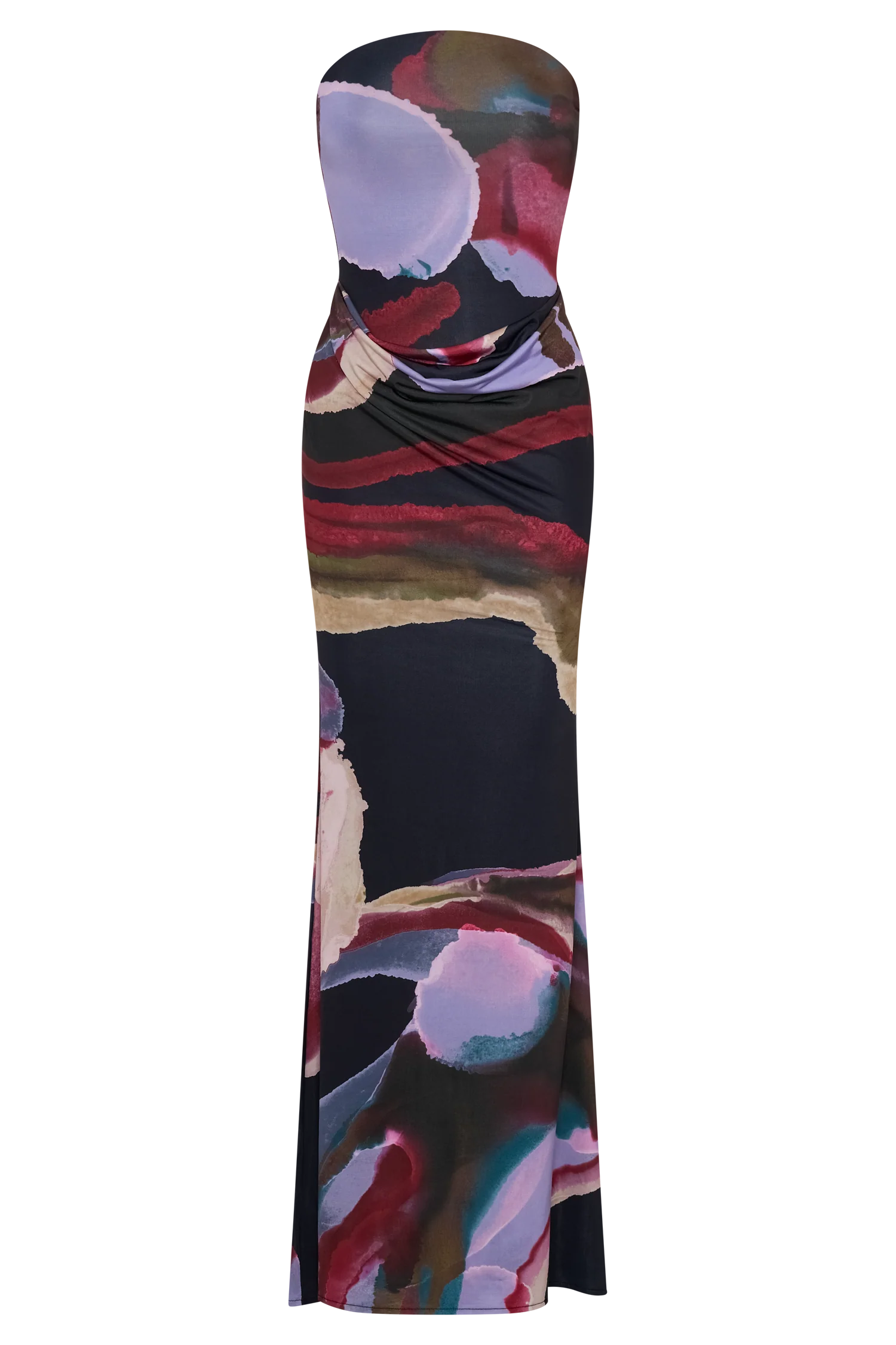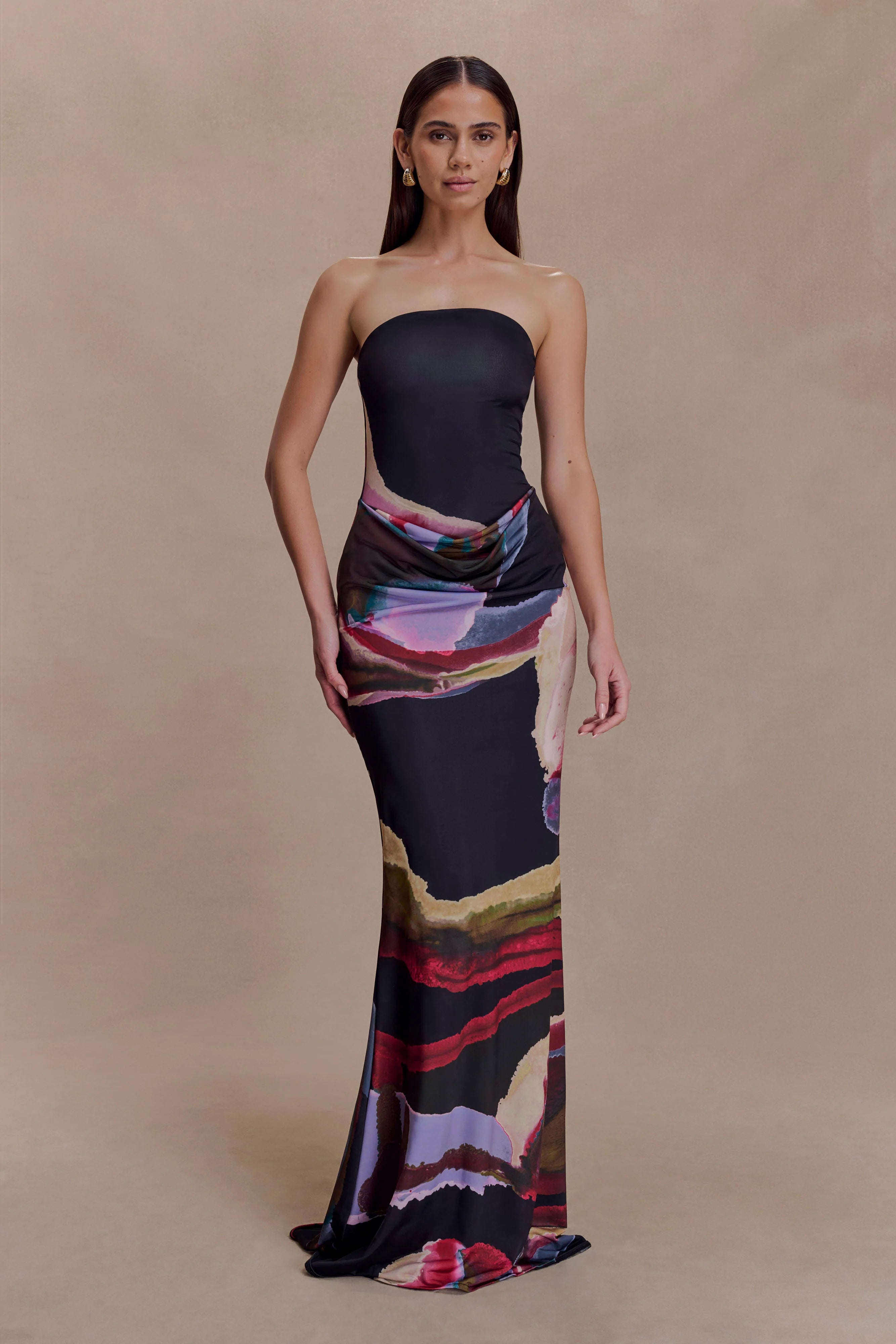 Command attention with the MADISON Strapless Slinky Maxi Dress, a stunning fusion of sophistication and allure. Featuring a rounded neckline and a sleek strapless design, this dress highlights your silhouette with its flattering bodycon fit. The maxi length and fishtail hem add a touch of drama, while the front draped skirt detail creates effortless movement and dimension. Fully lined for a smooth finish, this dress is the ultimate choice for evening soirées, galas, or any occasion where making a statement is a must.