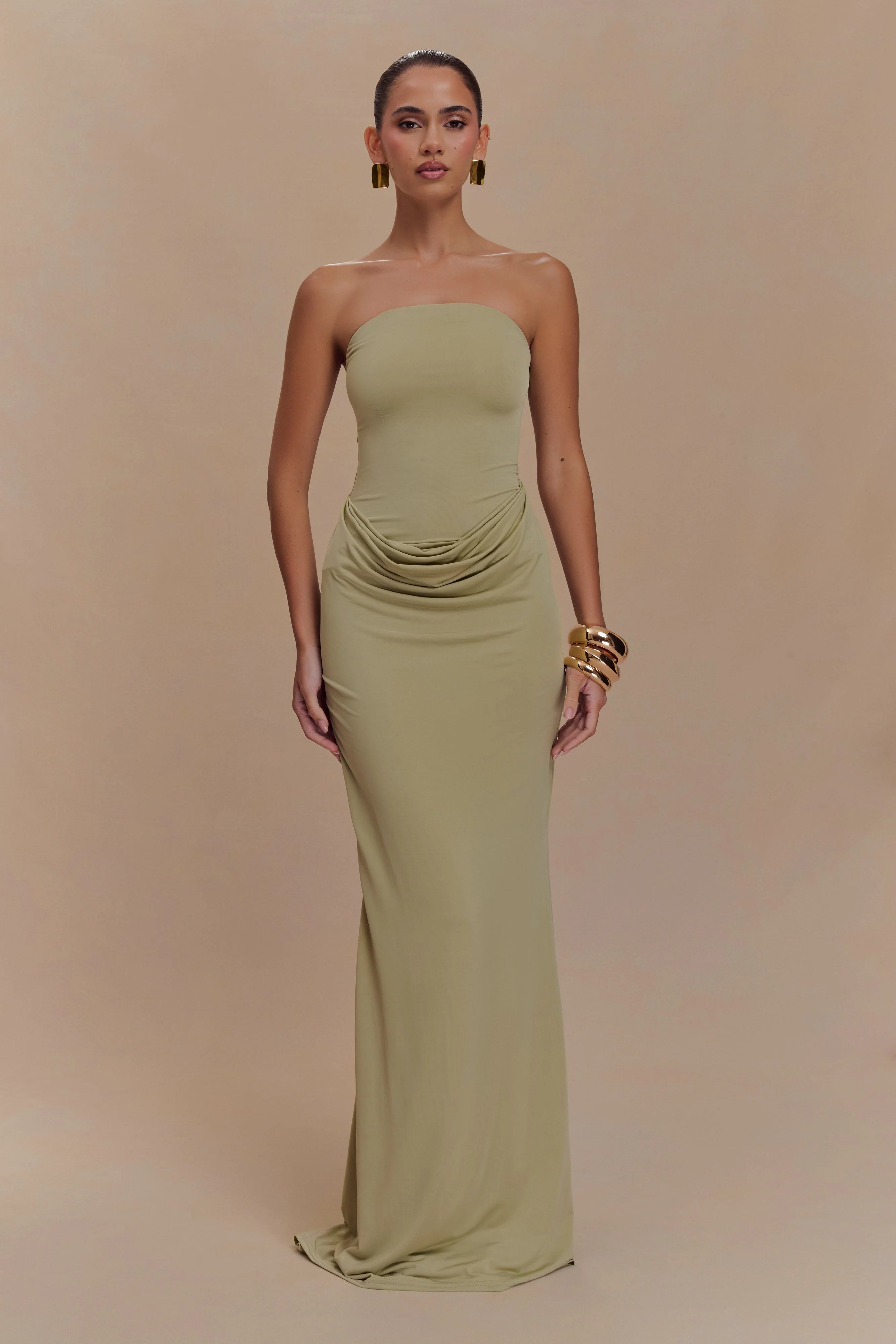Command attention with the MADISON Strapless Slinky Maxi Dress, a stunning fusion of sophistication and allure. Featuring a rounded neckline and a sleek strapless design, this dress highlights your silhouette with its flattering bodycon fit. The maxi length and fishtail hem add a touch of drama, while the front draped skirt detail creates effortless movement and dimension. Fully lined for a smooth finish, this dress is the ultimate choice for evening soirées, galas, or any occasion where making a statement is a must.