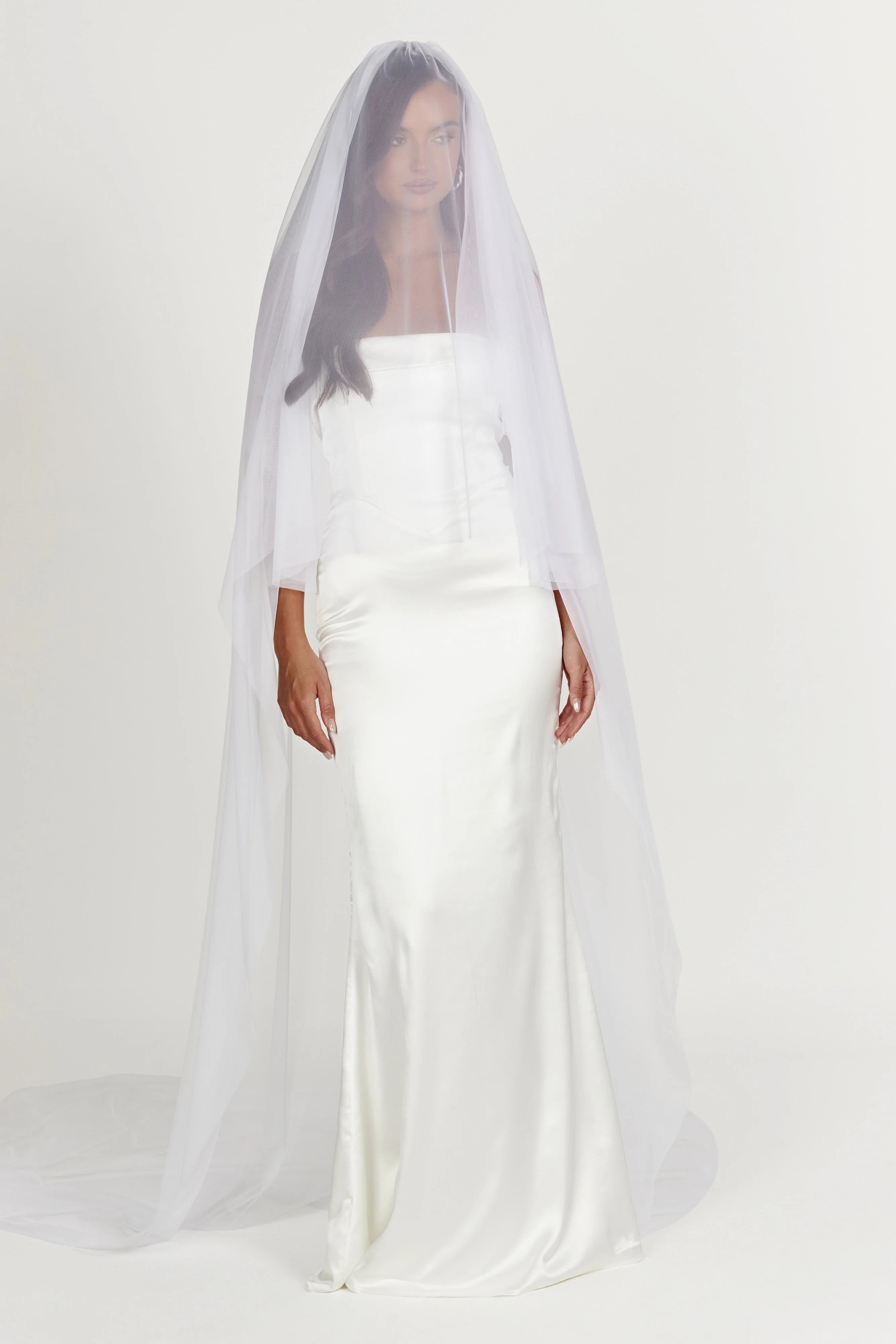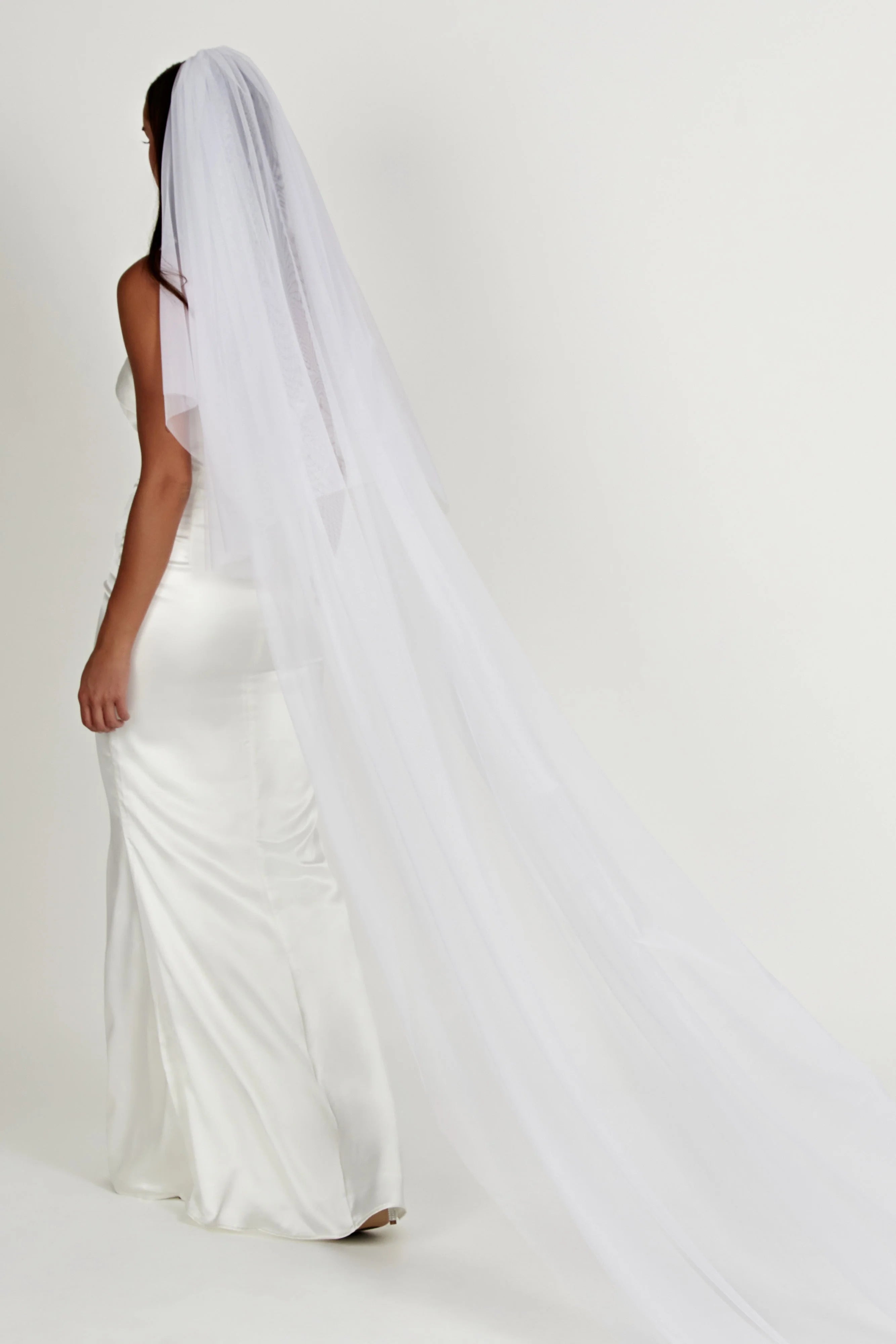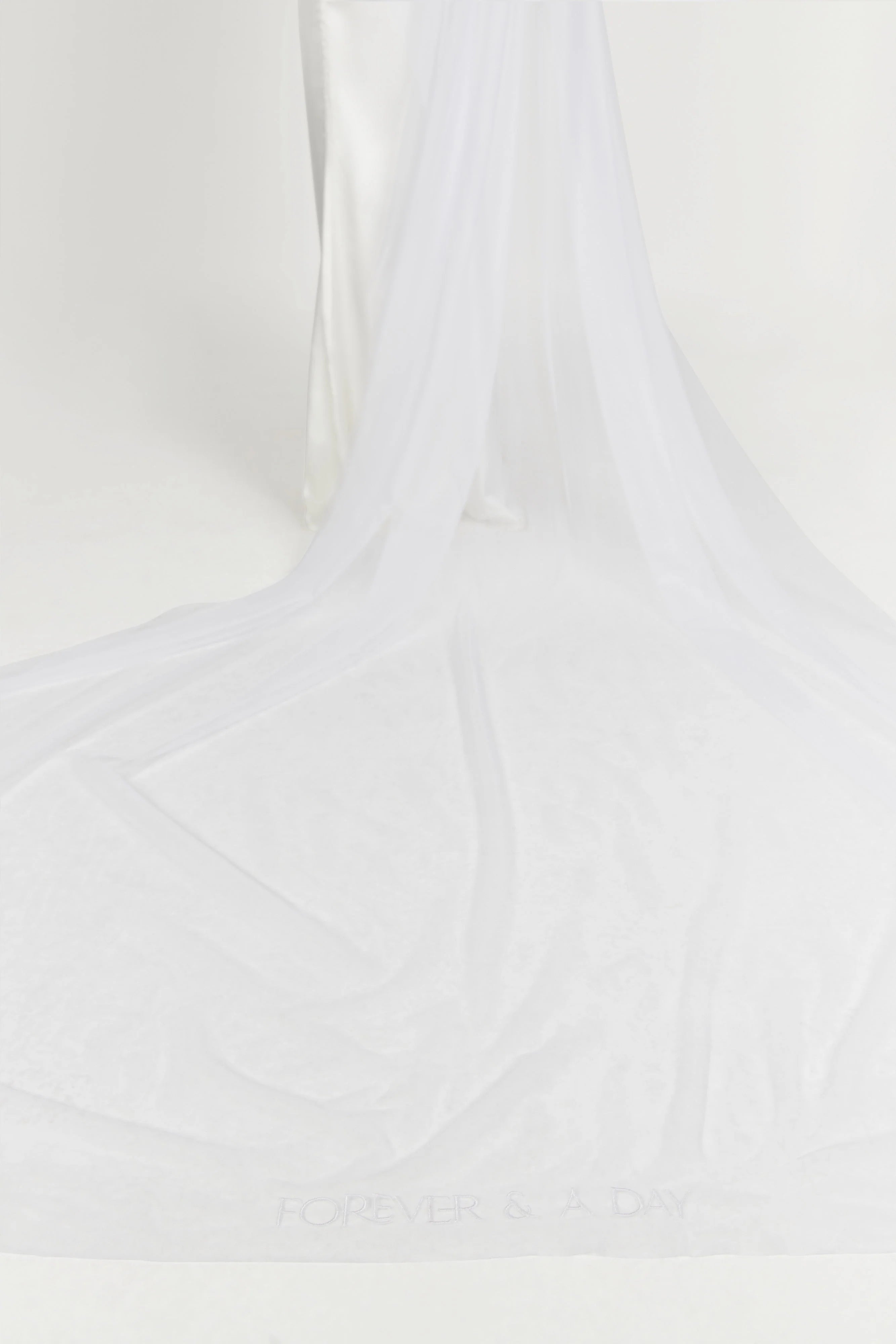 The finishing touch to your bridal look, this delicate ethereal veil is 300cm long and features a hidden comb clip that makes it easy to attach. We love the romance of a secret message and have included an intricate ‘Forever & A Day’ embroidery at the hem for a hint of playfulness for those paying attention. Crafted in the finest quality, MARGARETA is soft and lightweight for a romantic silhouette that complements any bridal aesthetic.