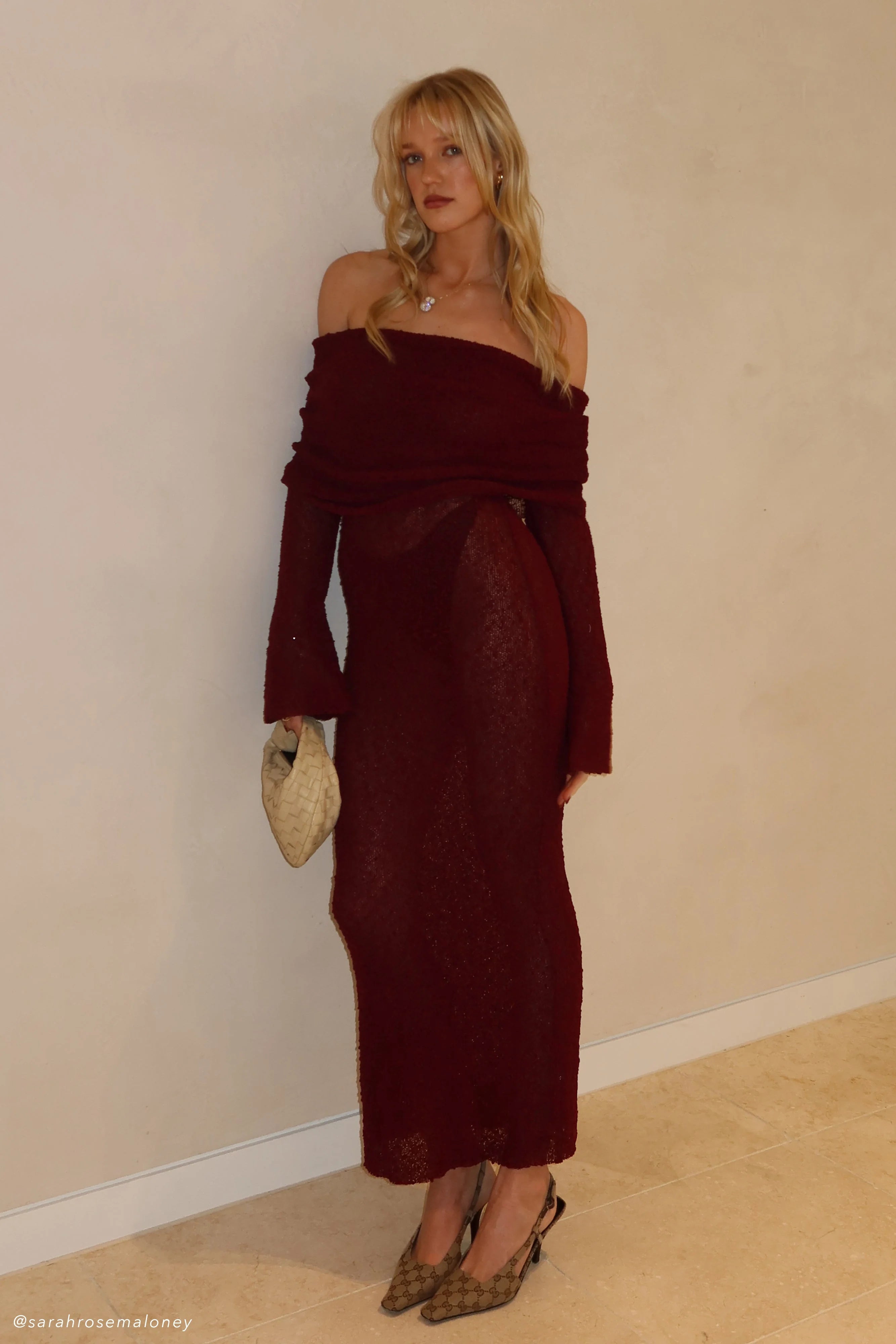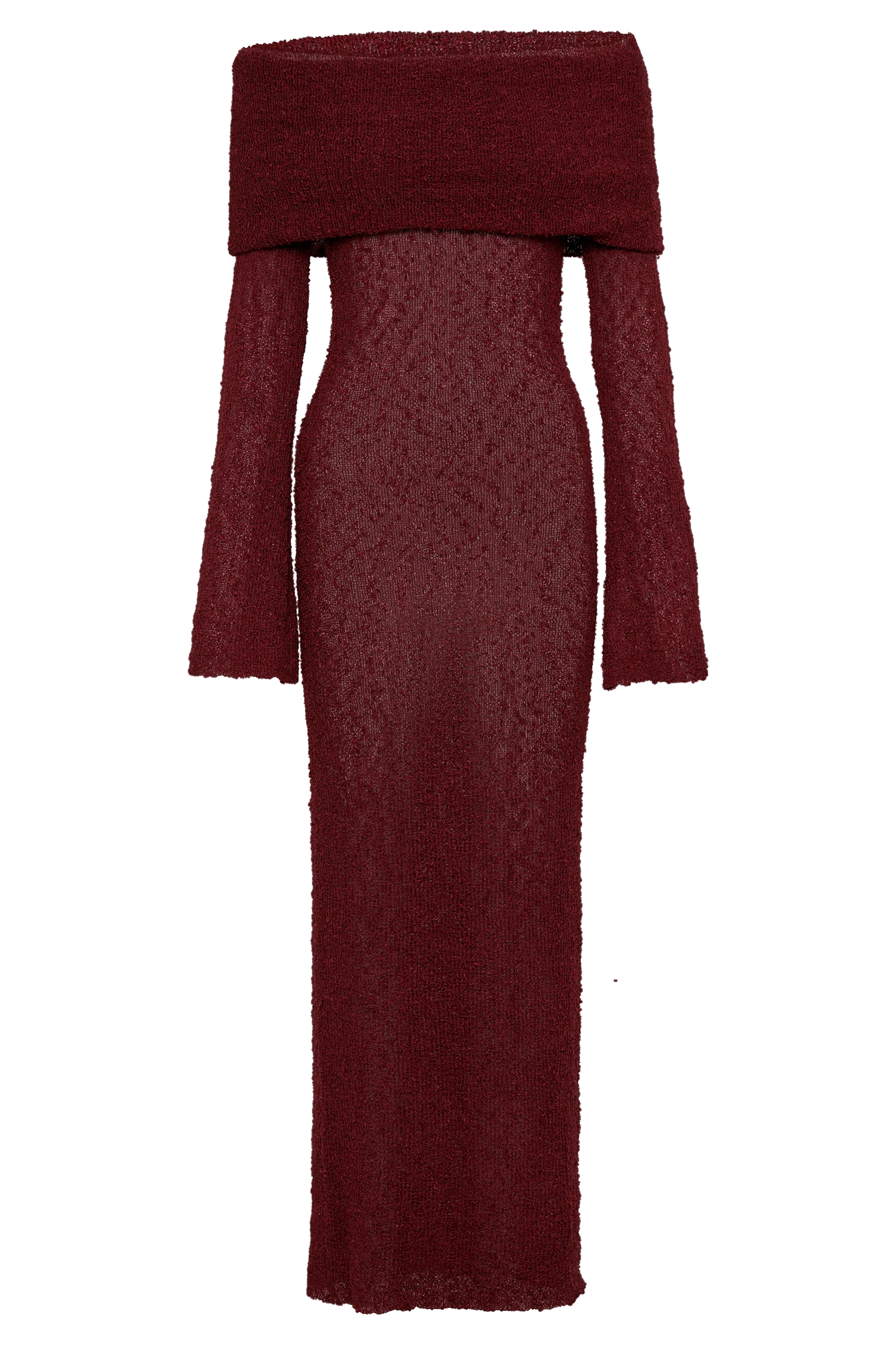 MARISOL is a ribbed design dress made from a Boucle material that is both flattering from up close and across the room. The natural stretch of the fabric creates a figure-sculpting silhouette, while also featuring a unique drape-styled, off-shoulder neckline combined with flared long sleeves. Style yours with the to complete the look.