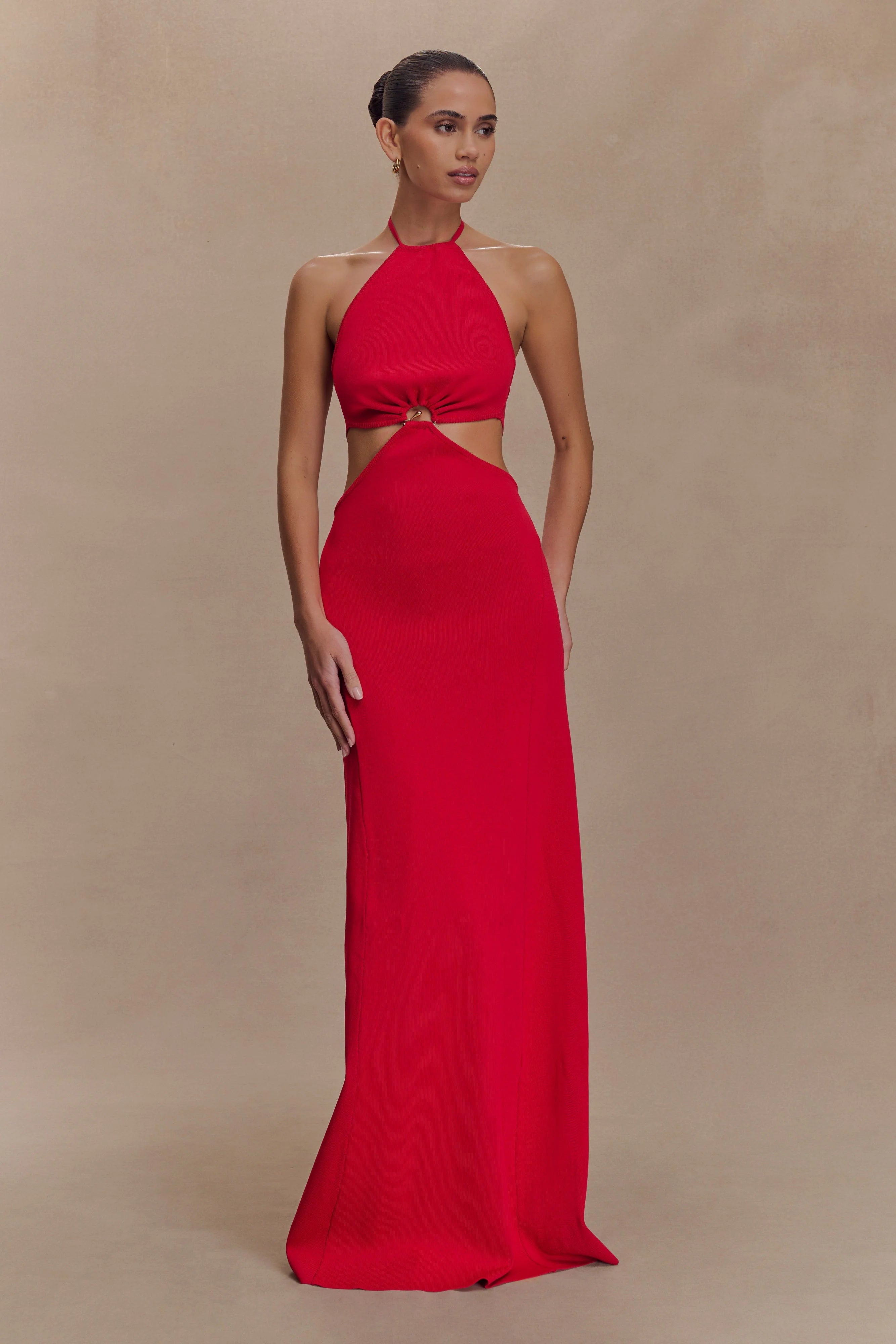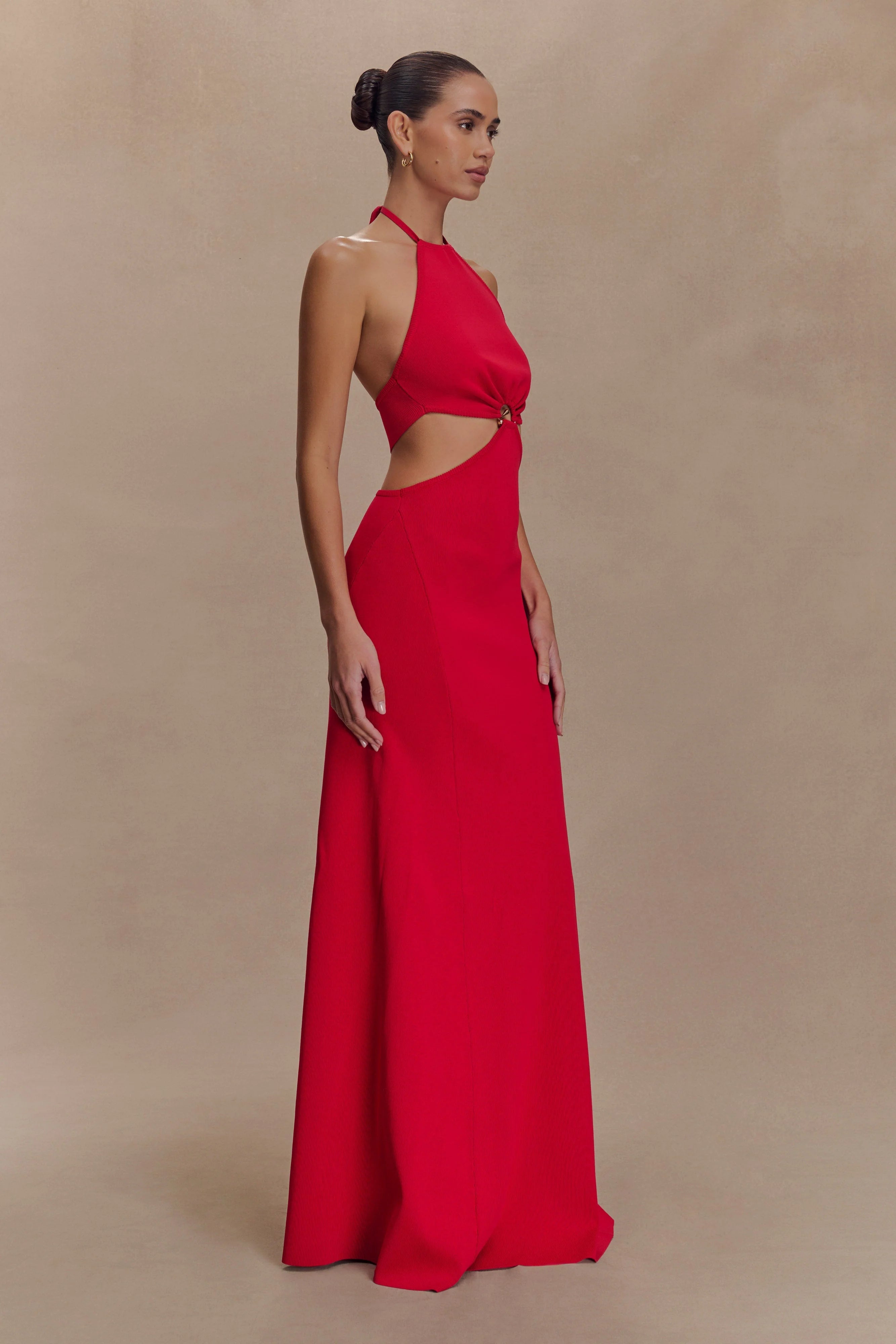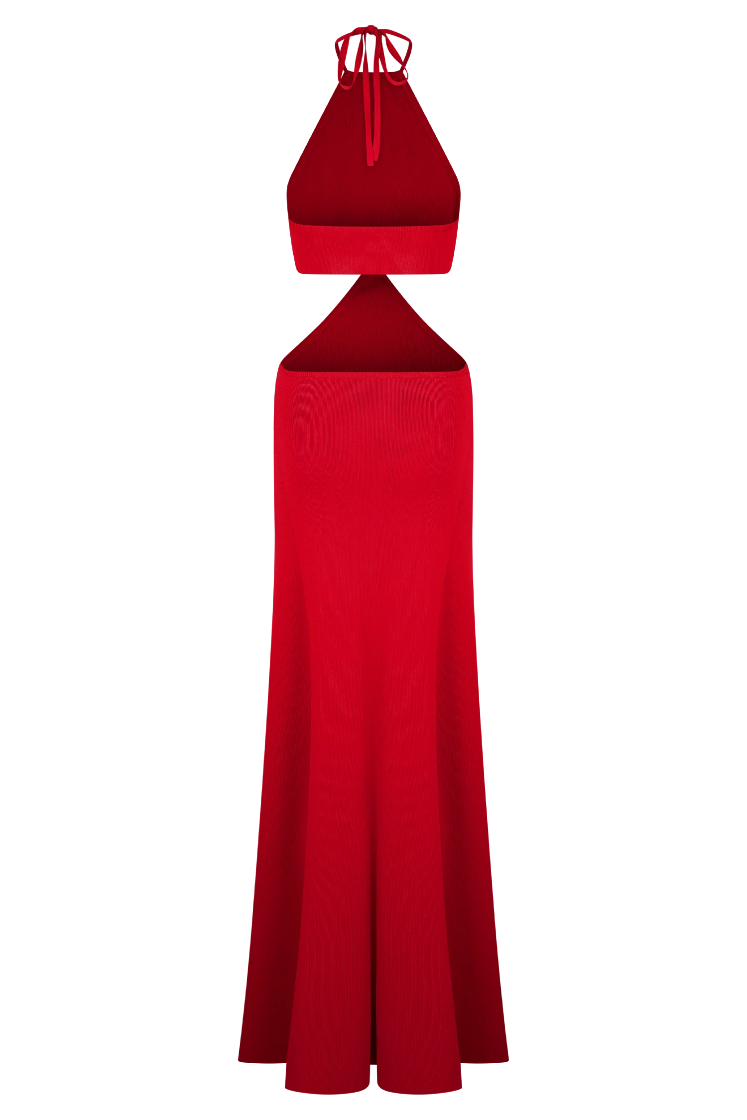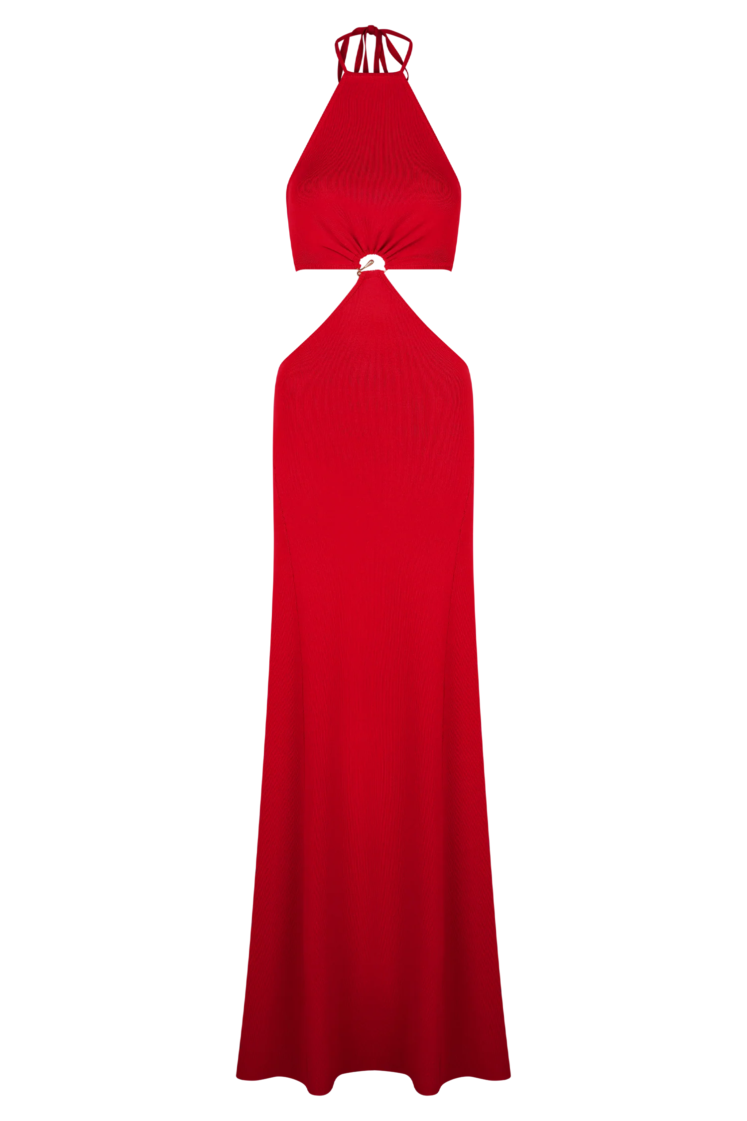 The MARLOWE Halter Knit Maxi Dress is a statement in effortless sensuality. Featuring an adjustable halter neckline and a striking open back, this dress is designed to turn heads with a front hardware detail and side-to-back waist cutout that flatters and defines. The A-line skirt adds balance to the bold silhouette, while the unlined knit keeps it lightweight and breathable. Perfect for warm evenings, holiday getaways, or anytime you want your outfit to do the talking.