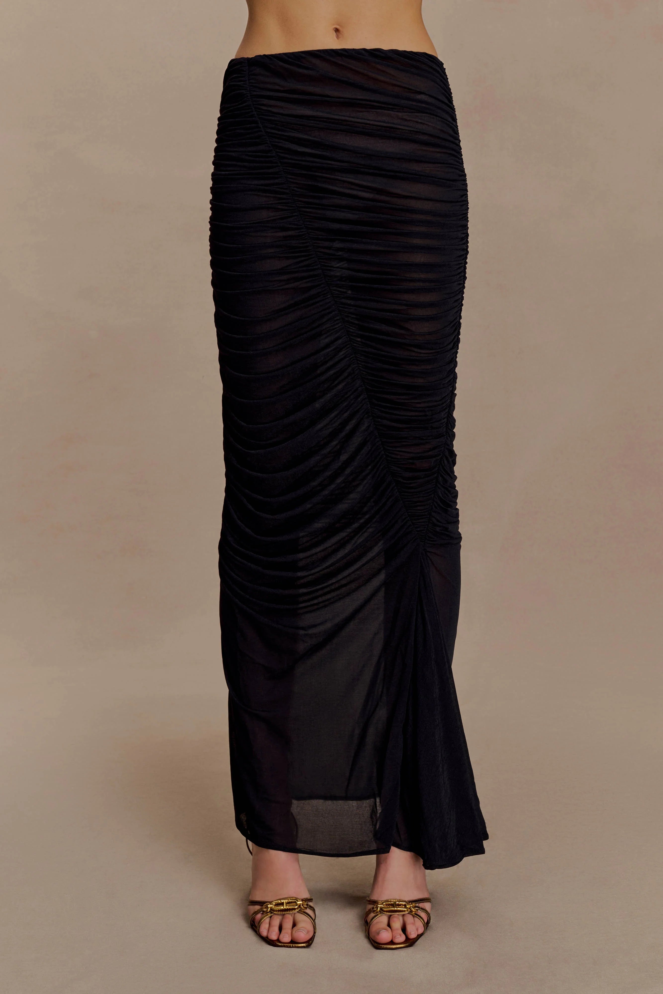 The MATILDA Ruched Mesh Maxi Skirt is designed to flatter with soft gathering and a sleek, elongating silhouette. Sitting at the mid waistline, it’s detailed with ruched accents throughout and a front godet insert that adds subtle volume and flow. Fully lined for comfort and cut to a maxi length, this skirt balances structured fit with fluid movement—perfect styled with its coordinating bodysuit for a statement set moment.