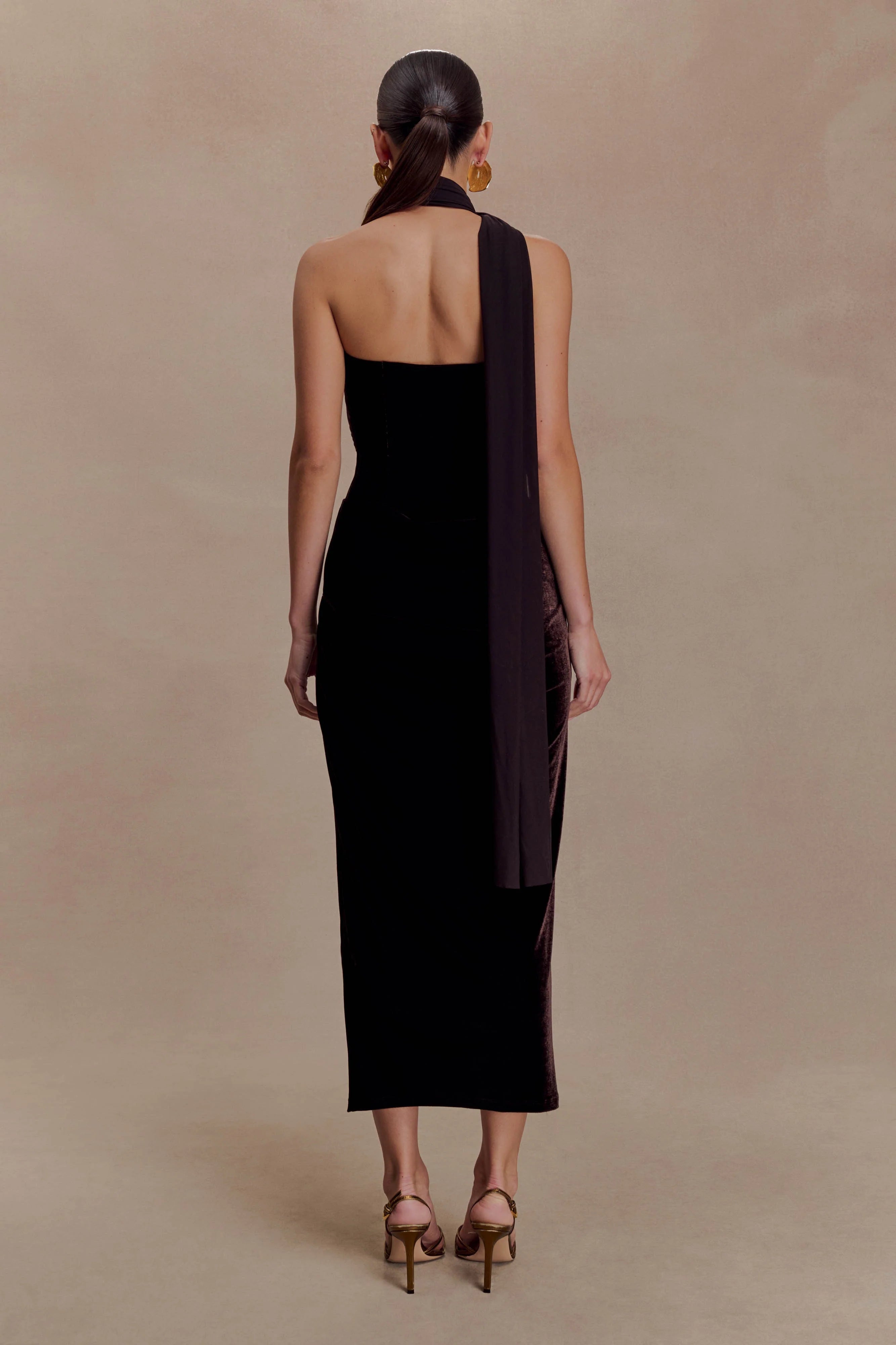 The MATTEA Velvet Midi Dress With Scarf is designed to captivate through rich texture and elegant structure. Featuring a strapless sweetheart neckline and a corset-style bodice, it shapes and defines the silhouette with precision. A softly draped overlay skirt with pleats at the side seams enhances movement, while the attached scarf — cascading from the underarm — adds a touch of fluid sophistication. Fully lined for comfort and finished with an invisible zip, this midi-length dress brings modern glamour to timeless eveningwear.