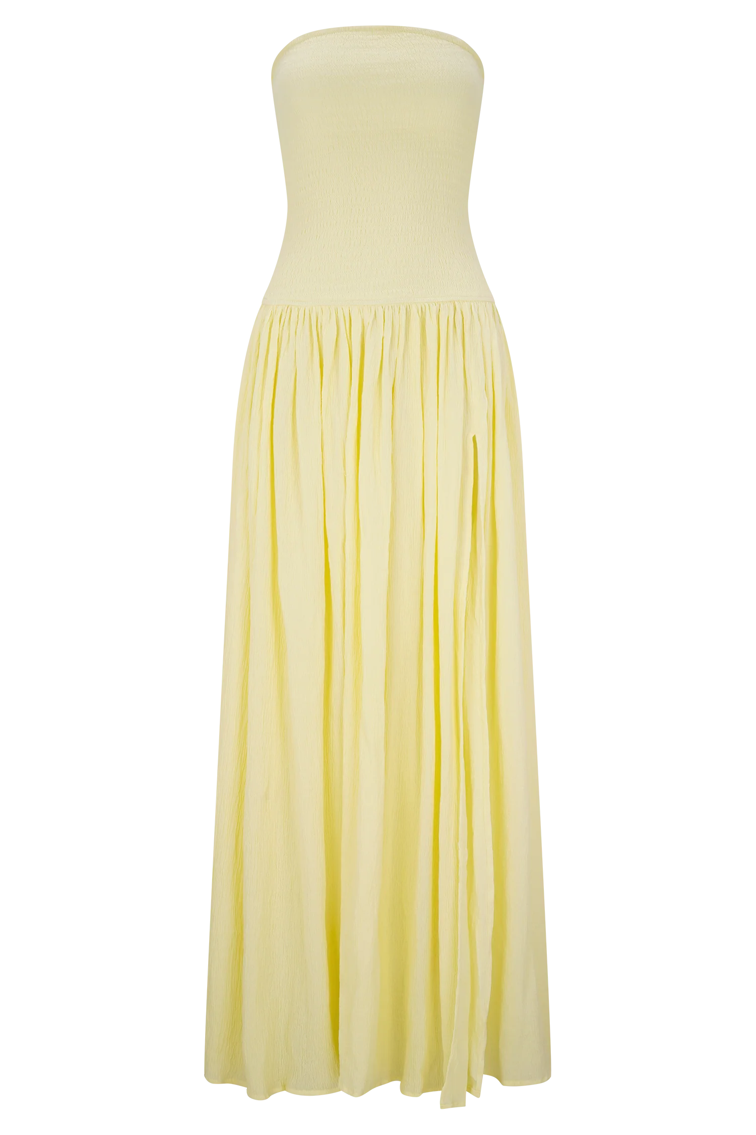 The MAUREEN Cotton Shirring Maxi Dress is the epitome of effortless elegance. This strapless dress features a shirred bodice that provides a comfortable and flattering fit, while the longline bodice extends into a beautifully gathered skirt. With a maxi length and a subtle leg split, this dress offers both sophistication and a touch of allure. Fully lined for added comfort, this dress is perfect for any occasion where style and grace are paramount.