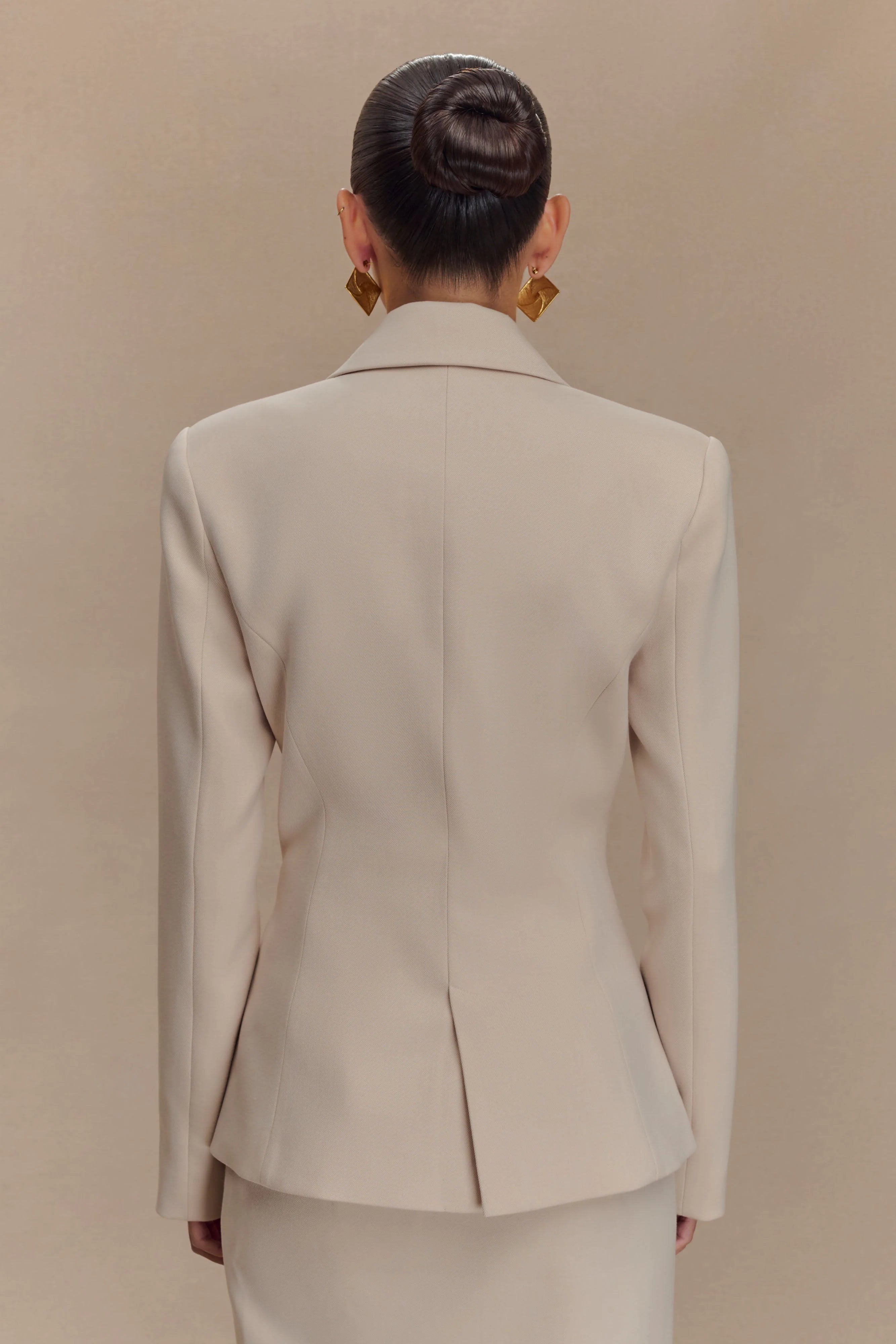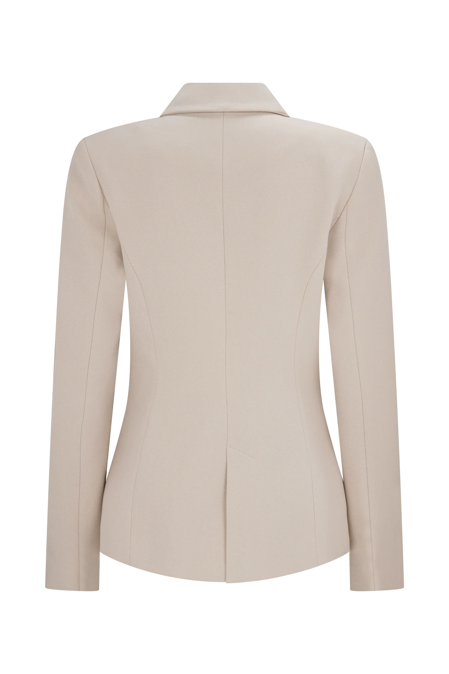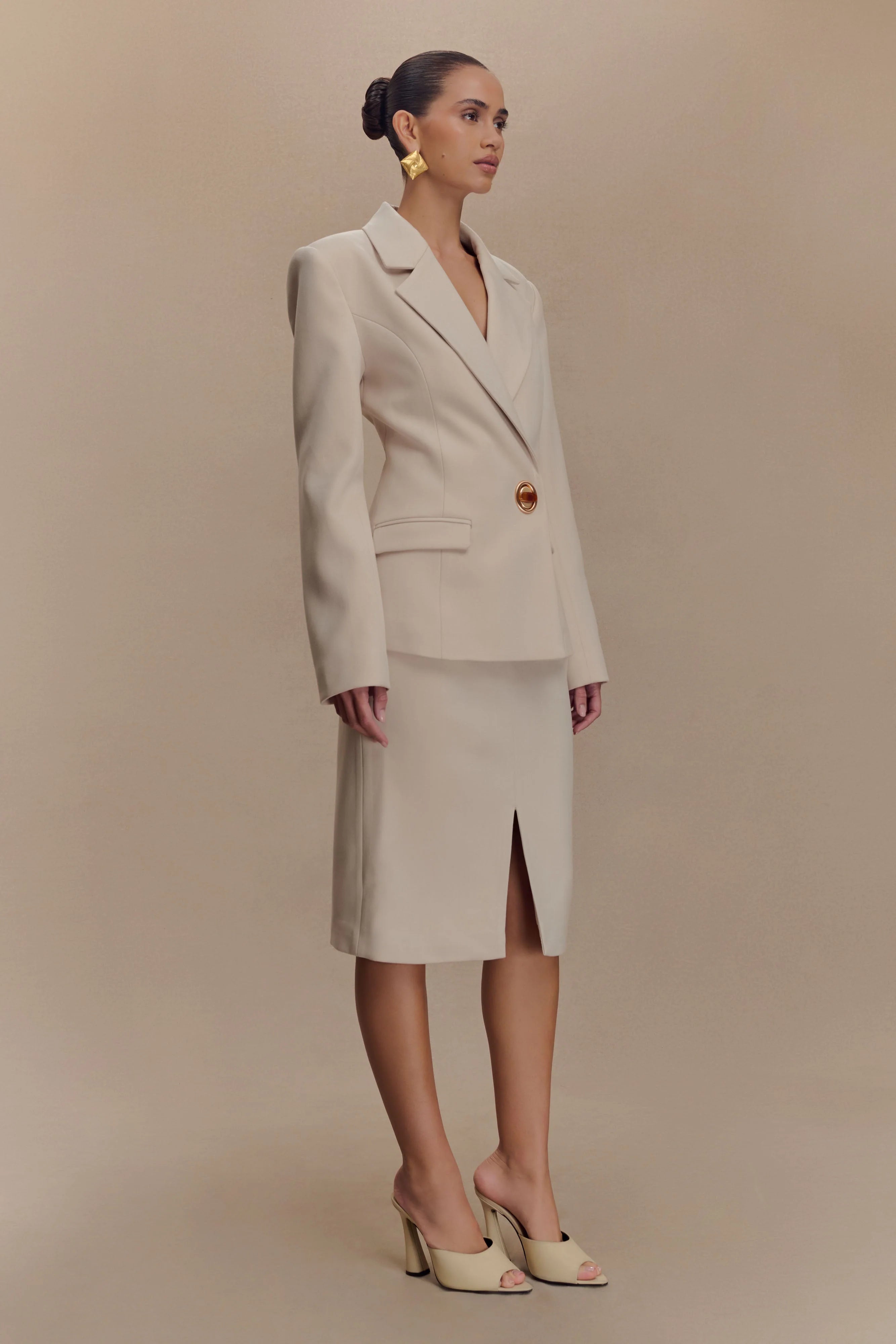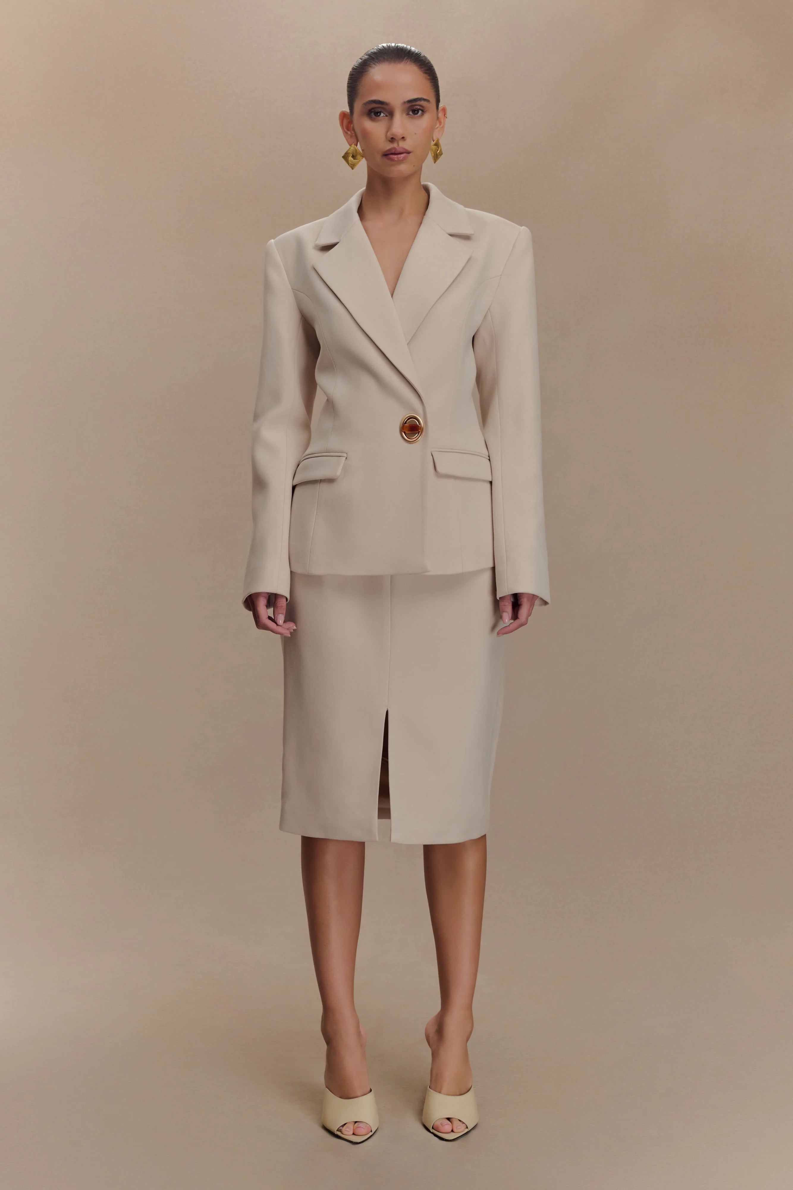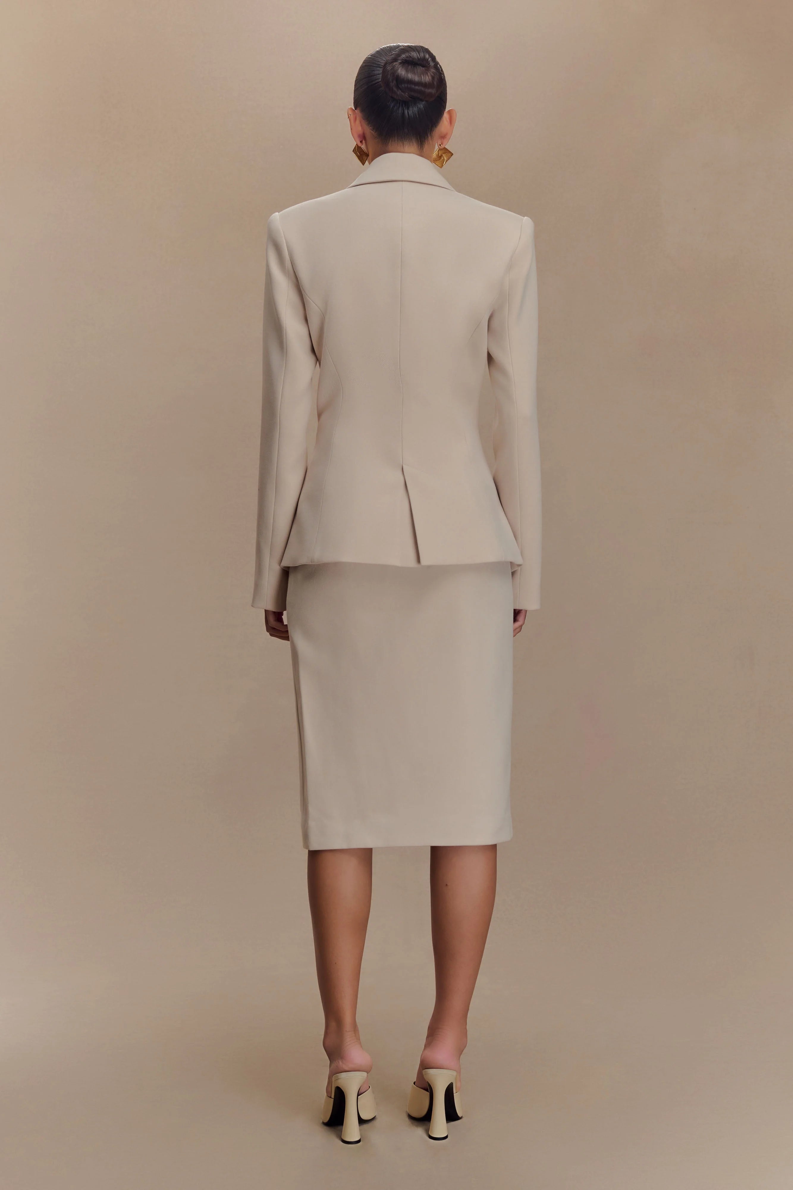 The MAX Cinched Waist Blazer is a refined take on classic tailoring, designed to sculpt and empower. Featuring a notched lapel, V-neckline, and structured shoulder pads, this blazer flatters with a cinched, fitted waist and functional button front closure. Faux front flap pockets add a clean finish, while full lining ensures all-day comfort and polish. Pair with the for a power pairing that blends timeless structure with modern sophistication.