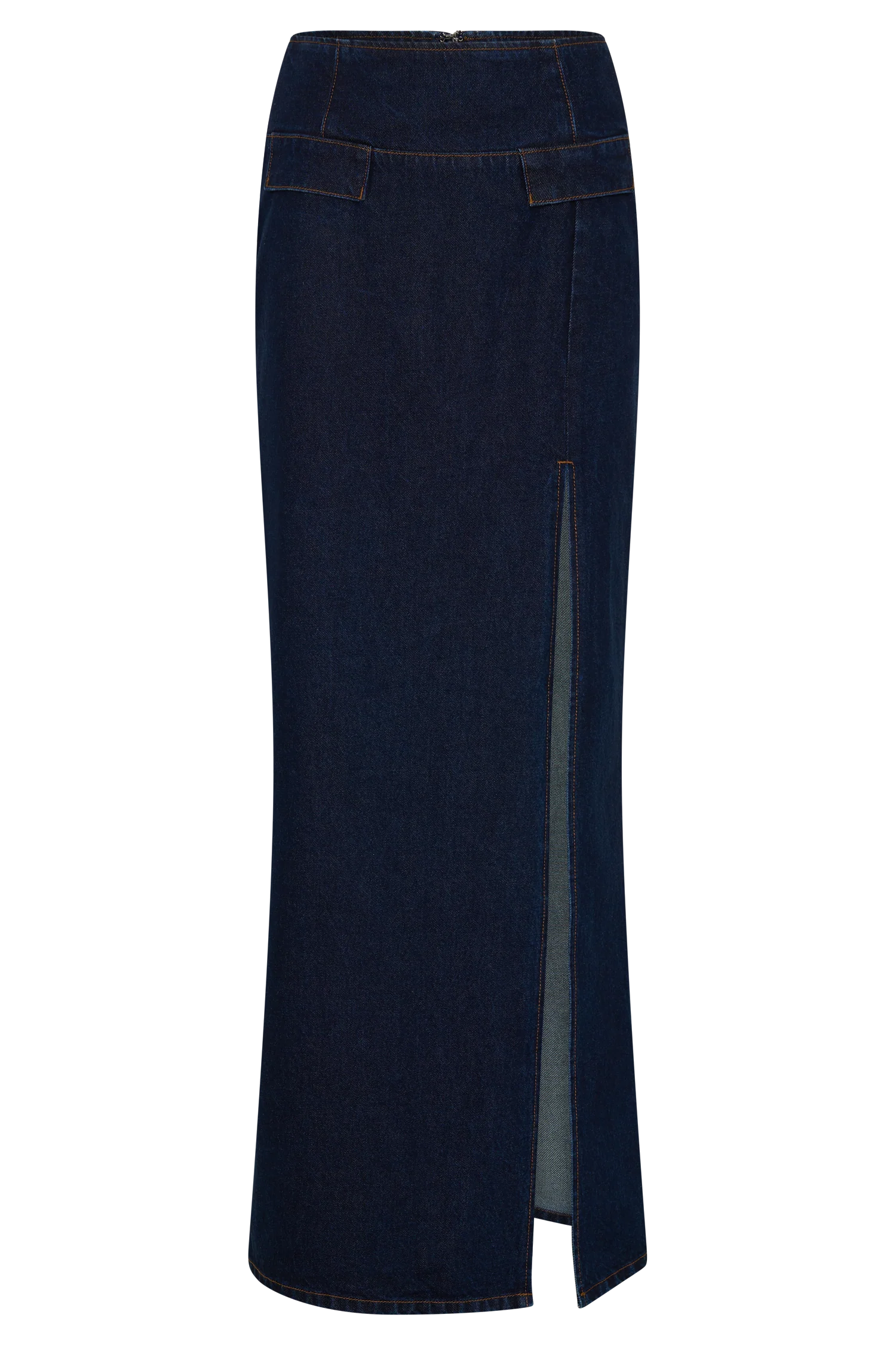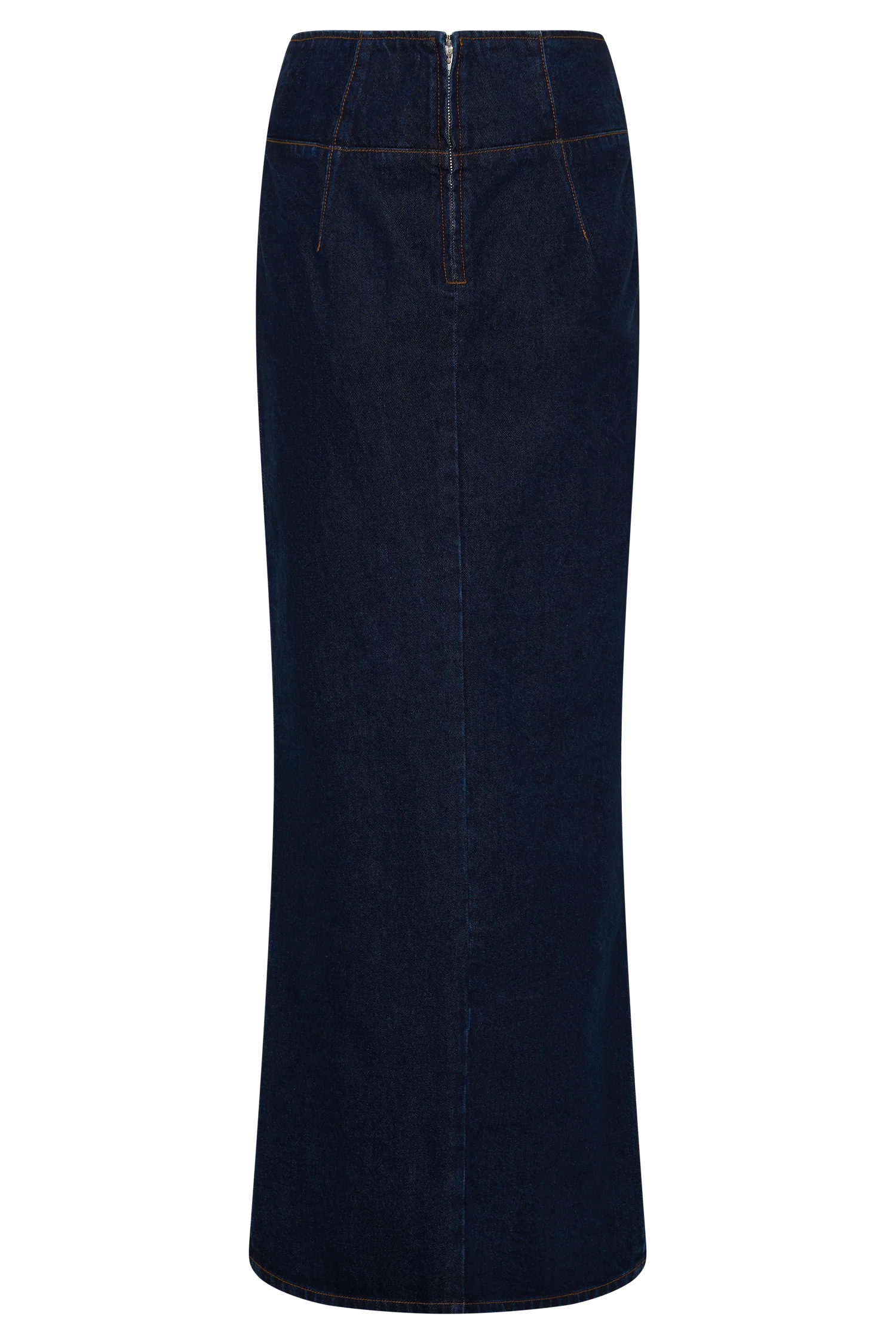The MAYLENA High Rise Denim Maxi Skirt is cut to flatter with its super high-rise waistline and wide waistband panel. Designed with front pocket flaps for subtle structure, it features a sleek maxi length with a side leg split that adds movement and allure. A clean back zip closure completes the look, making this skirt a versatile piece that transitions seamlessly from casual daytime styling to refined evening edits.