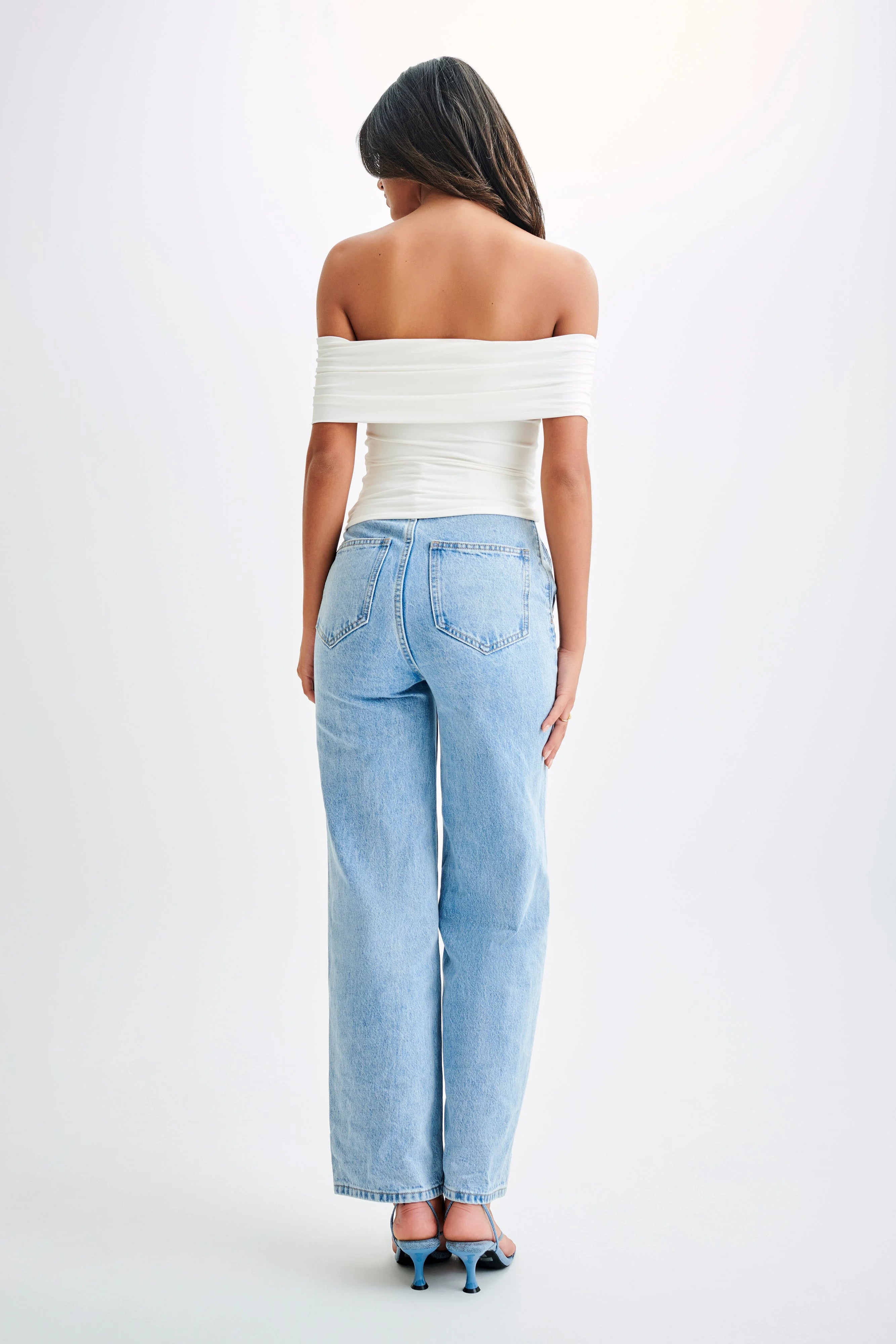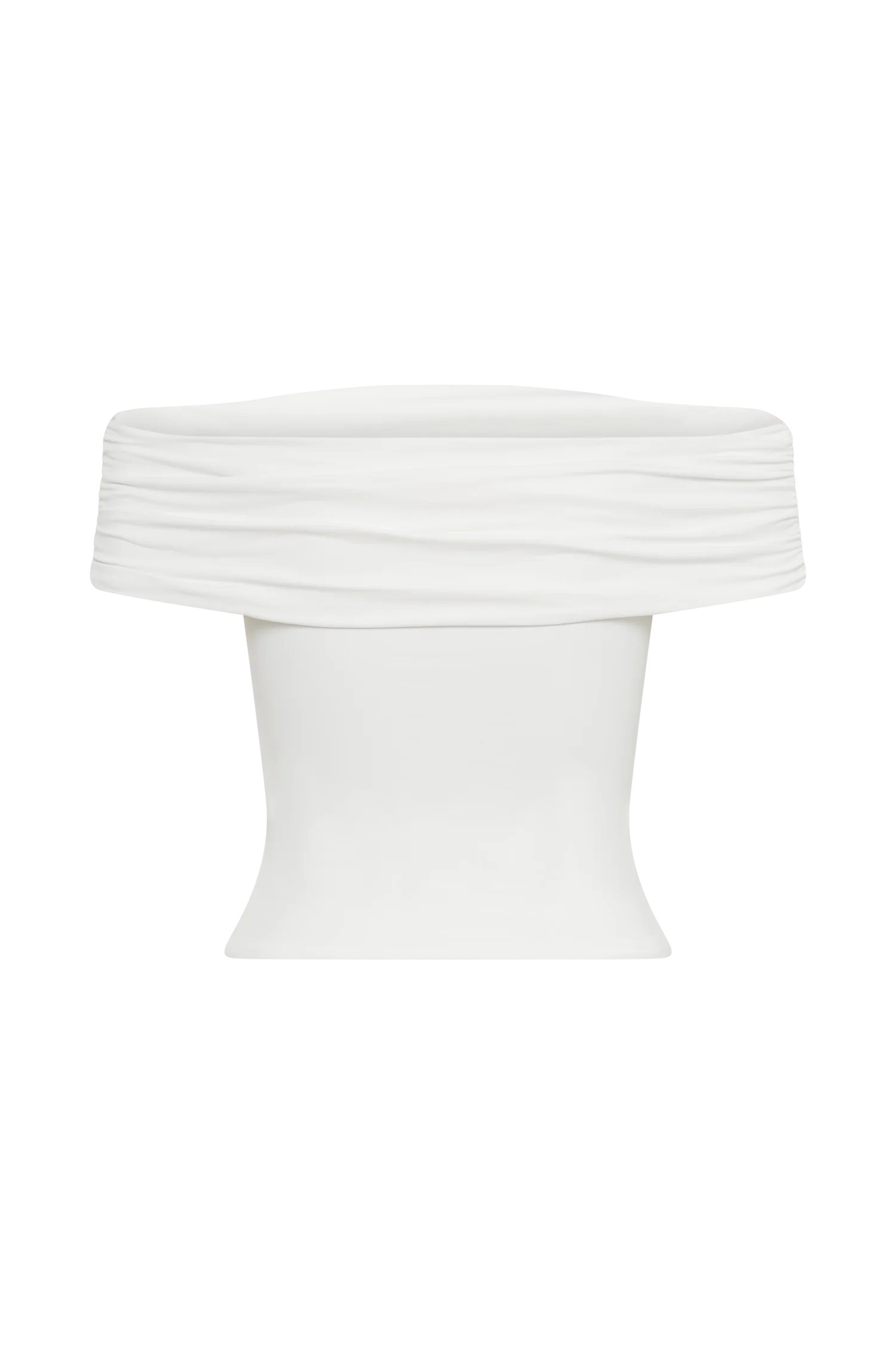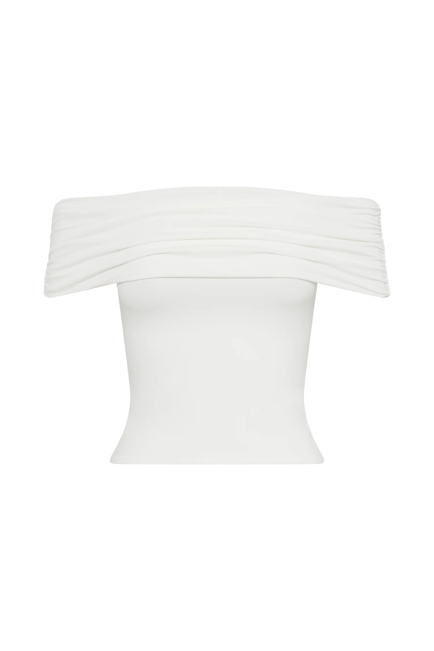 The MEENA Recycled Nylon Off-Shoulder Top seamlessly blends sustainability with style. Boasting an off-shoulder design and a ruched, foldover neckline, it adds texture and dimension to the look. With a slight bodycon fit, it flatters the silhouette while ensuring comfort. The cropped torso design introduces a playful element, making it a versatile piece suitable for various occasions. Crafted from recycled nylon, this top not only reflects a fashion-forward taste but also promotes a more sustainable wardrobe. Elevate your look with the chic Meena Off-Shoulder Top.