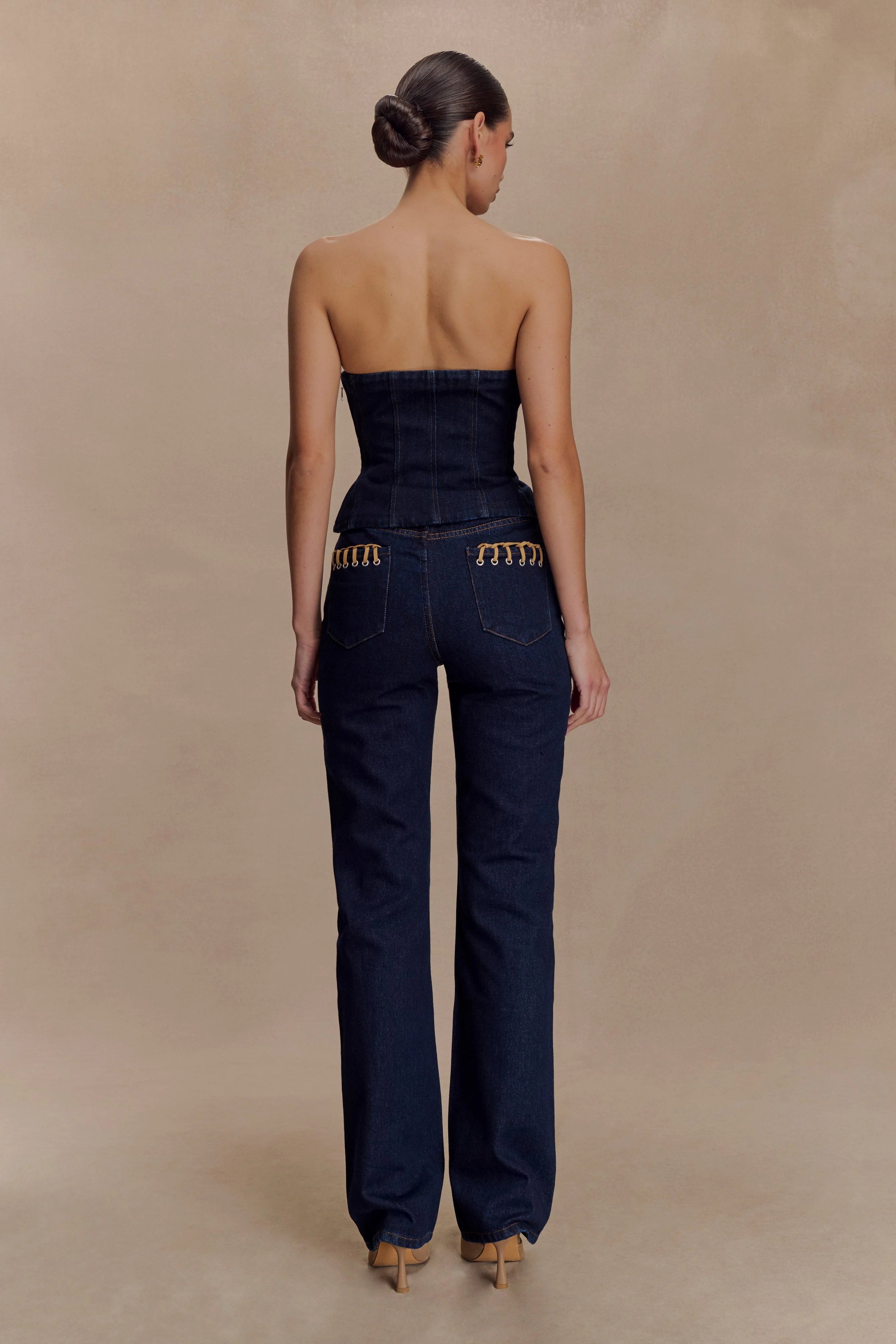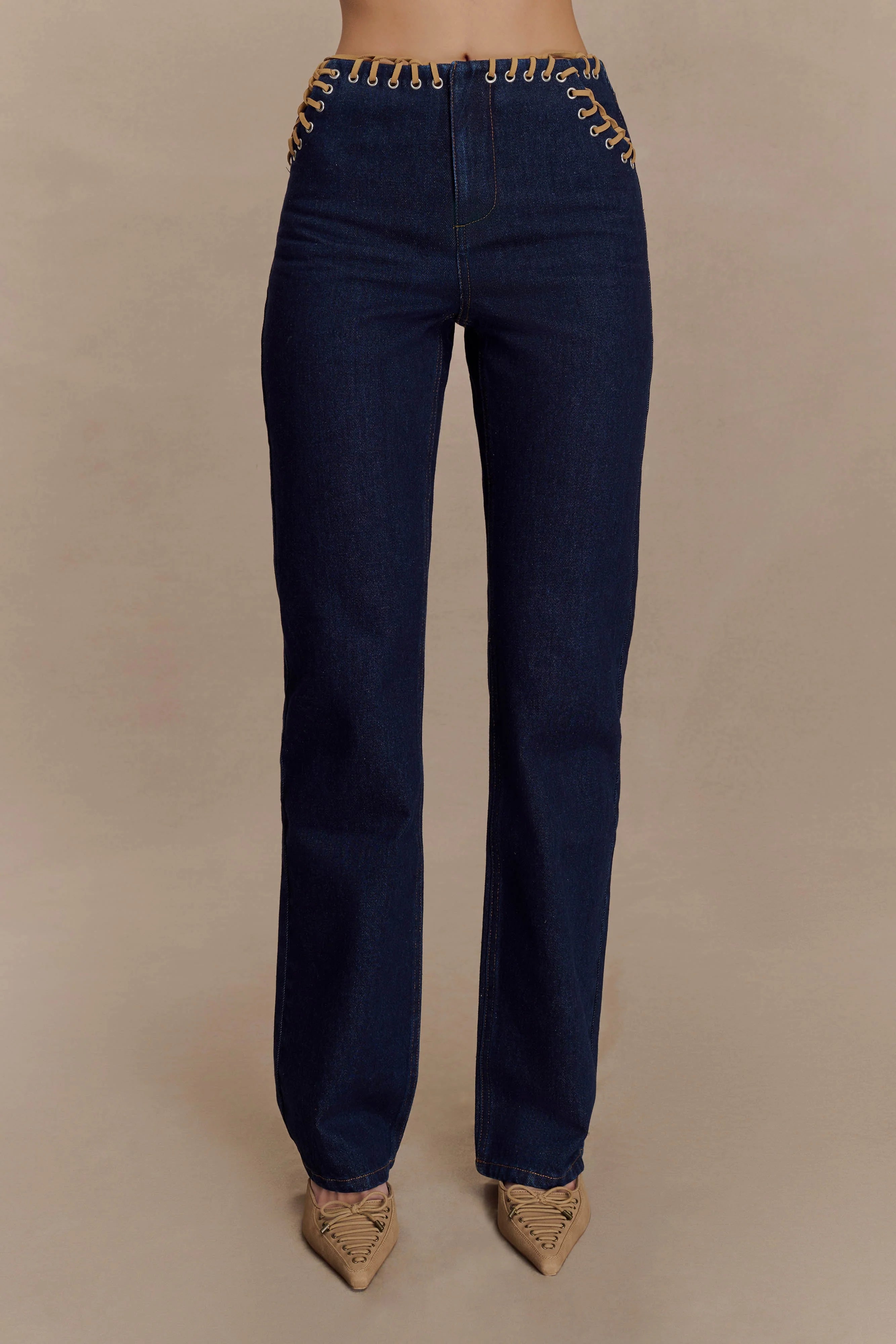 The MERYL Lace Up Denim Jean delivers an effortless blend of bold and cool-girl polish. Designed with a low-rise waistline and no traditional waistband for a sleek finish, this straight-leg silhouette features lace-up eyelet details along the waist and pocket edges—bringing a touch of statement styling to a classic denim base. Complete with functional front and back pockets and a fly front closure, these jeans are made for moments when your denim needs to do more.