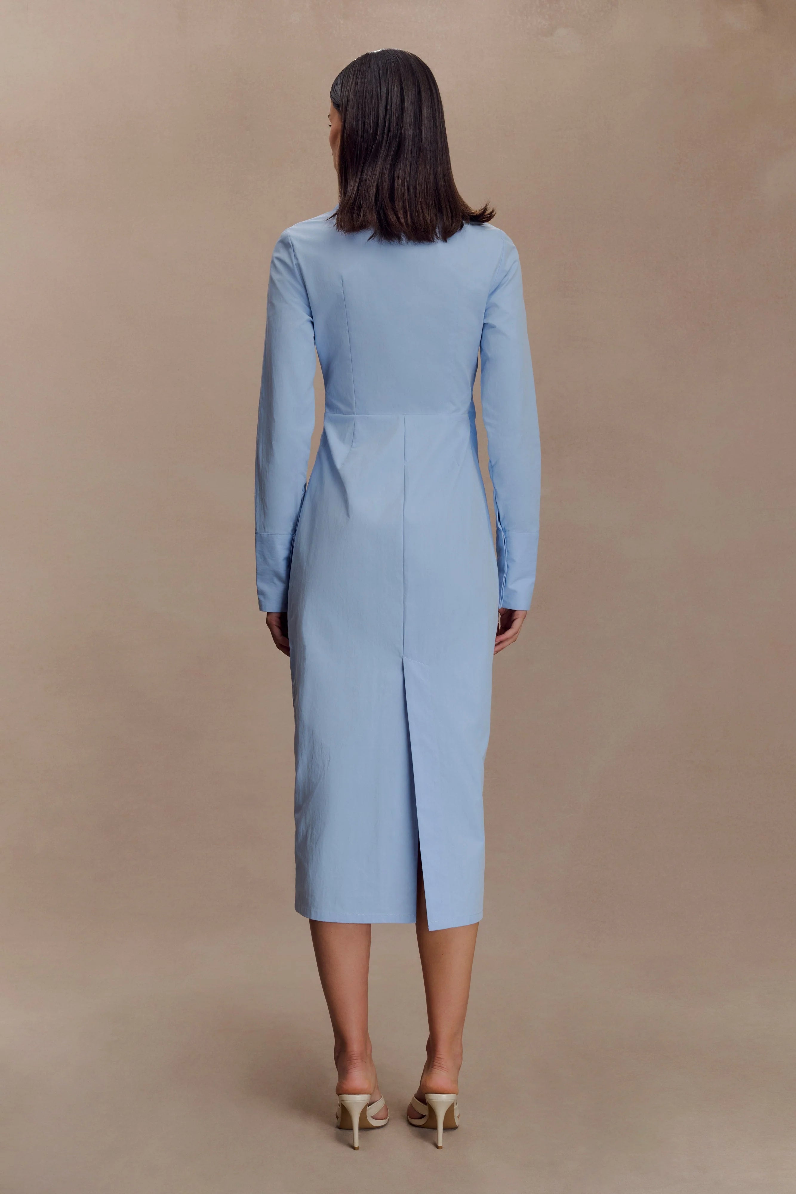 The MIKAILA Asymmetric Shirt Dress brings a directional twist to classic tailoring. Featuring an asymmetric collared neckline and a cross-front opening that secures with an internal snap button closure, it’s finished with a decorative gold button for subtle polish. Long sleeves with buttoned cuffs add structure, while a centre back split ensures ease of movement. Cut to a midi length and left unlined for a lightweight drape, this dress is a refined balance of sharp tailoring and modern minimalism.