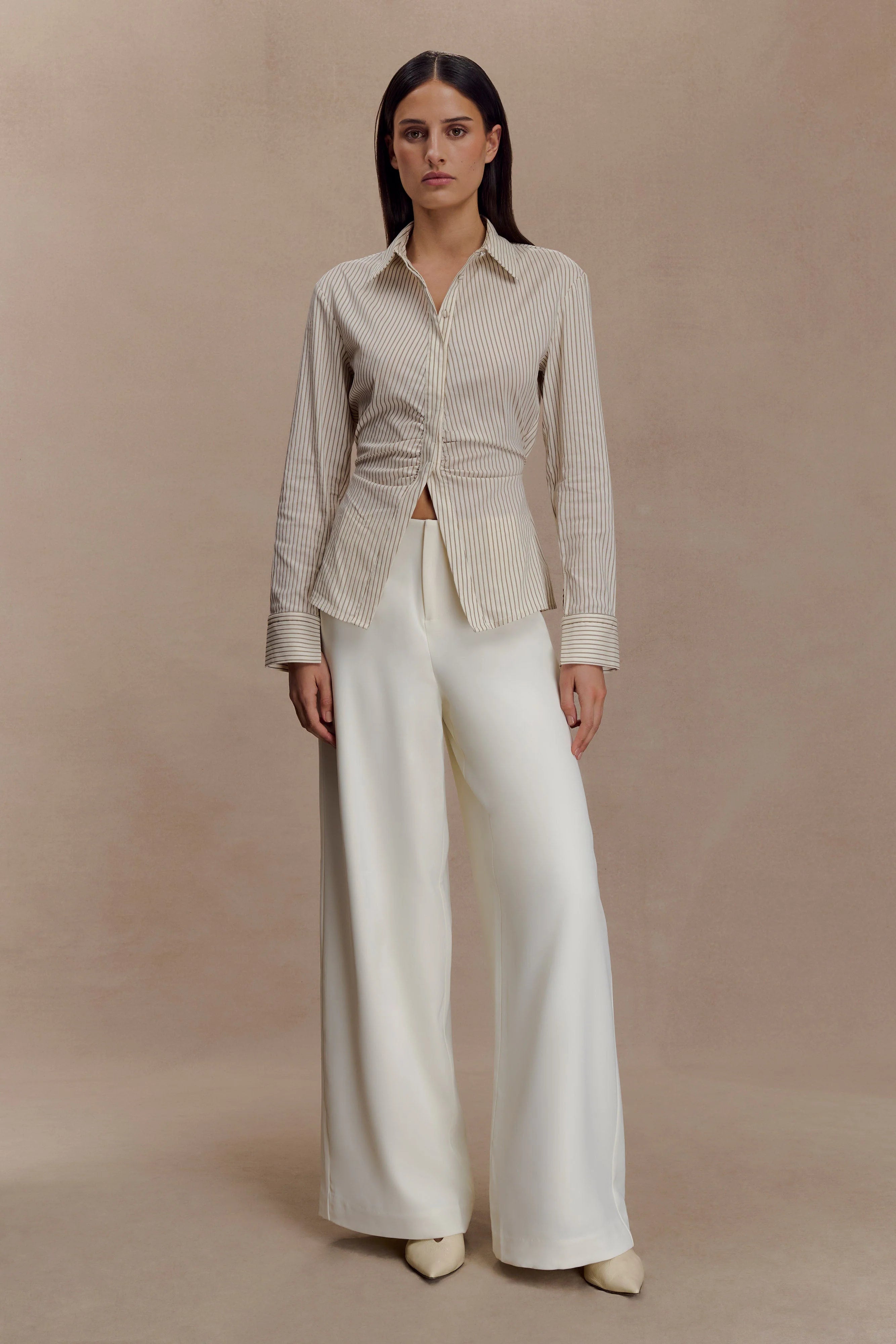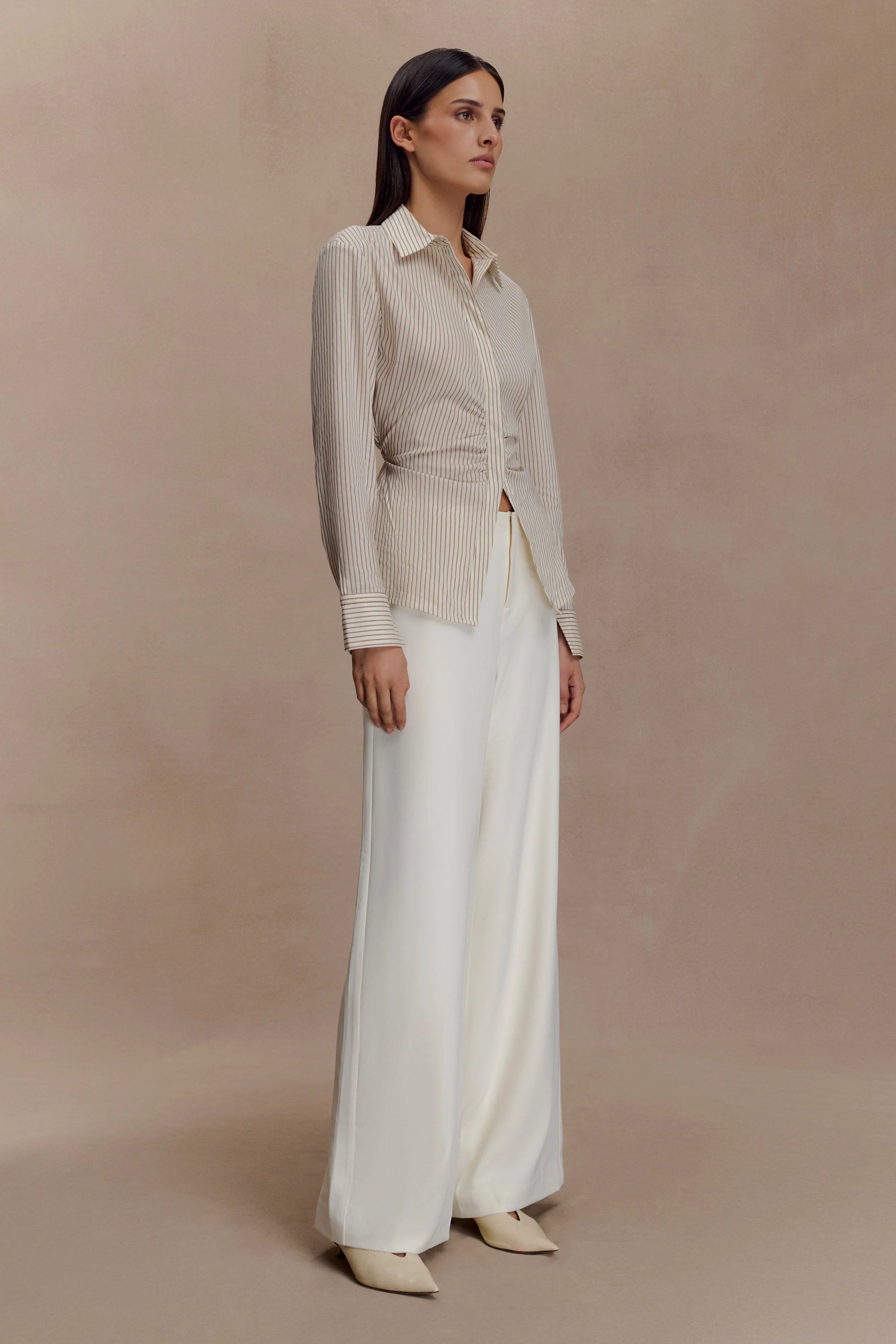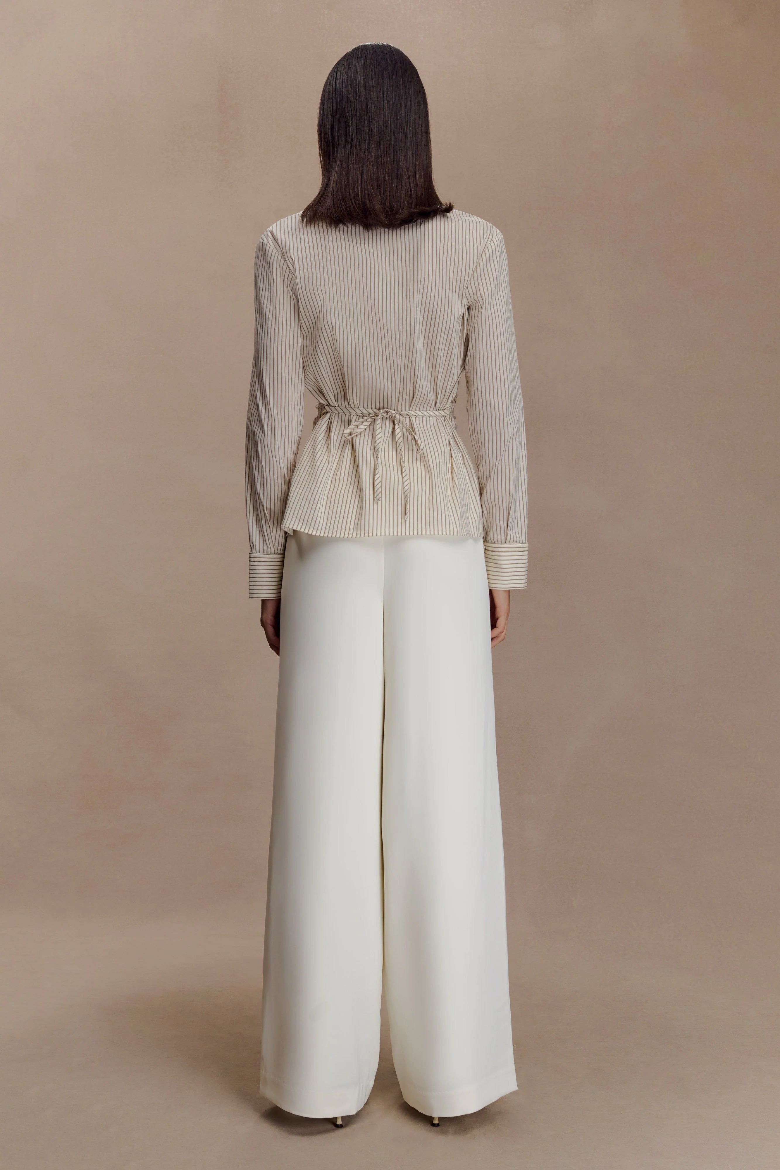 The MILLIE Tie Back Cotton Shirt takes a timeless staple and reimagines it with a feminine edge. Featuring a collared neckline, long sleeves, and a concealed button-front placket, it delivers sharp tailoring from the front. At the back, a waist tie threaded through side loops cinches the silhouette, creating a versatile fit that can be styled, structured or relaxed. Finished with buttoned sleeve cuffs and crafted from breathable cotton, this shirt is an effortless balance of polish and ease.