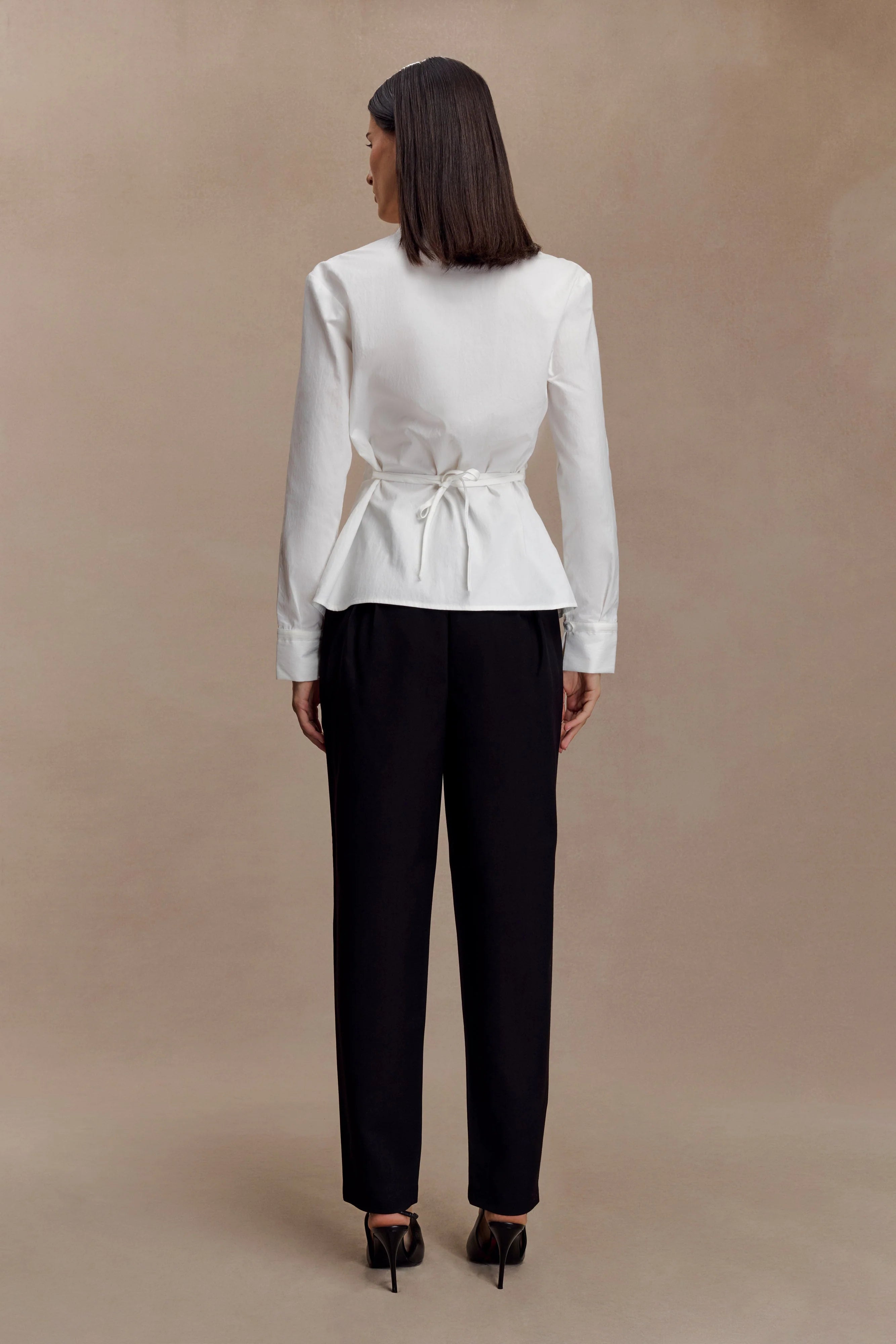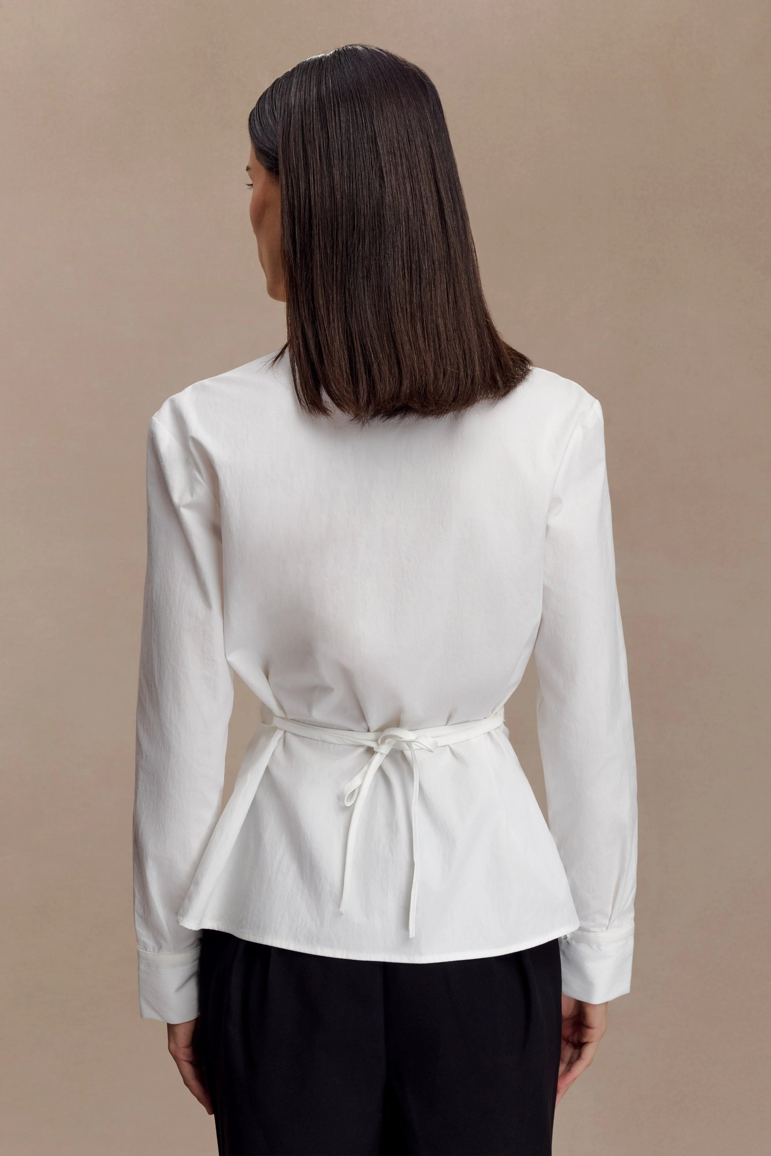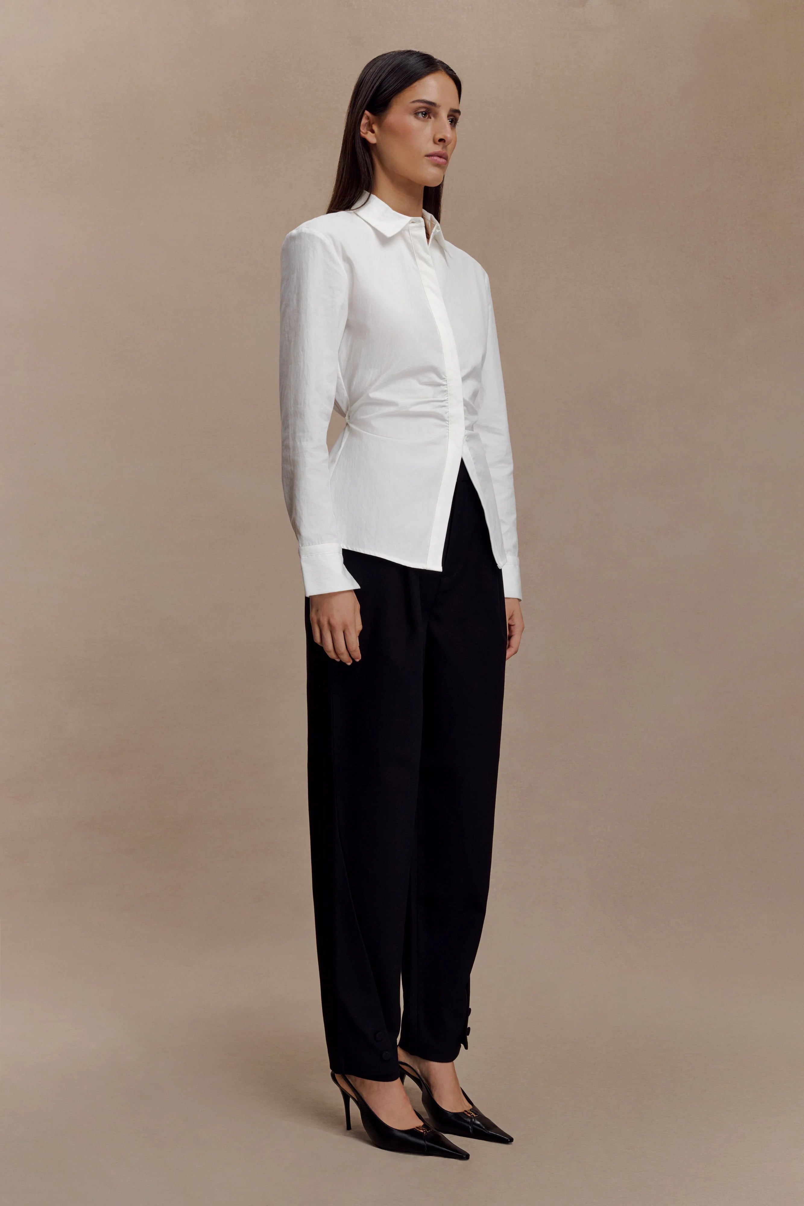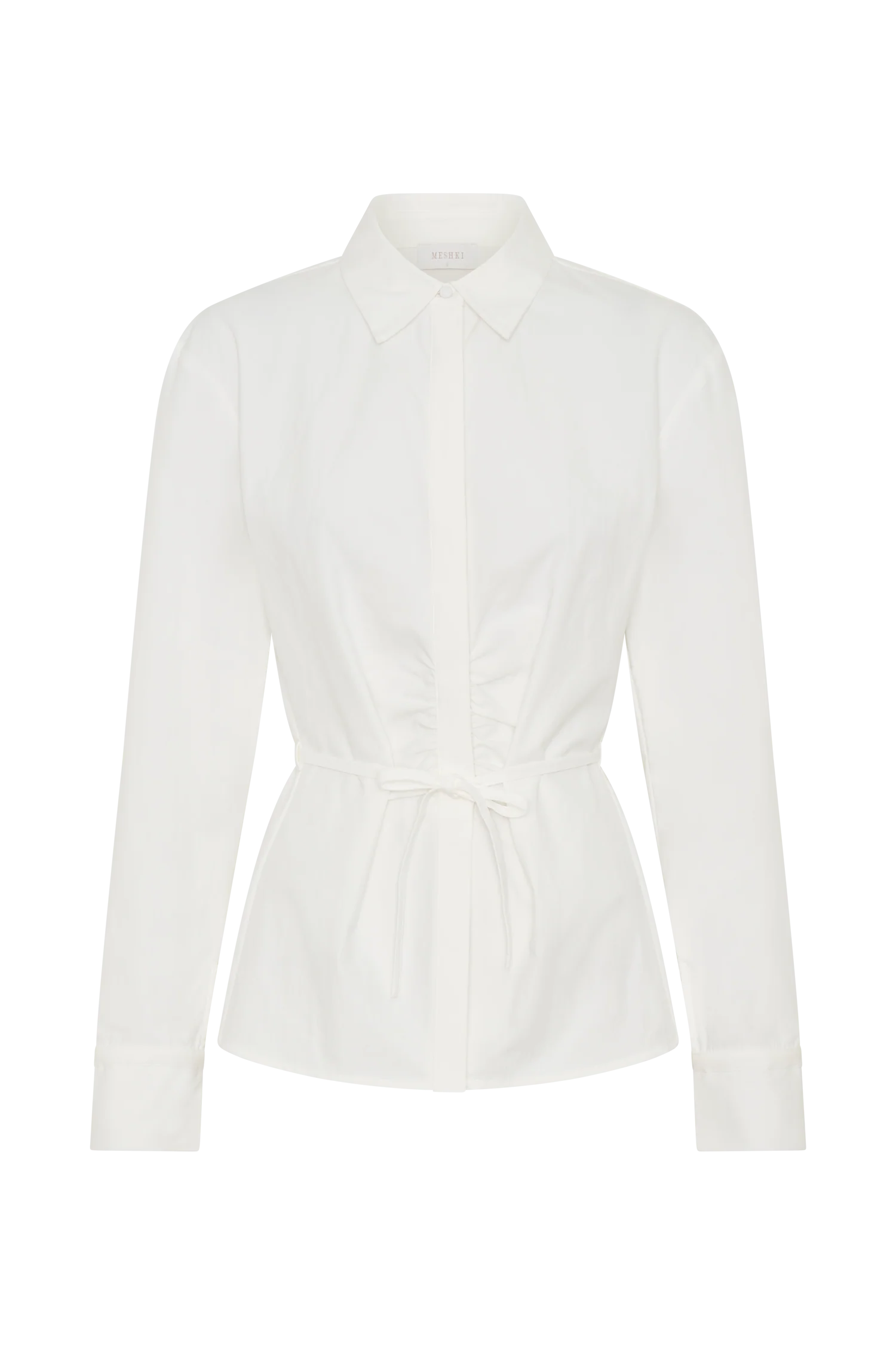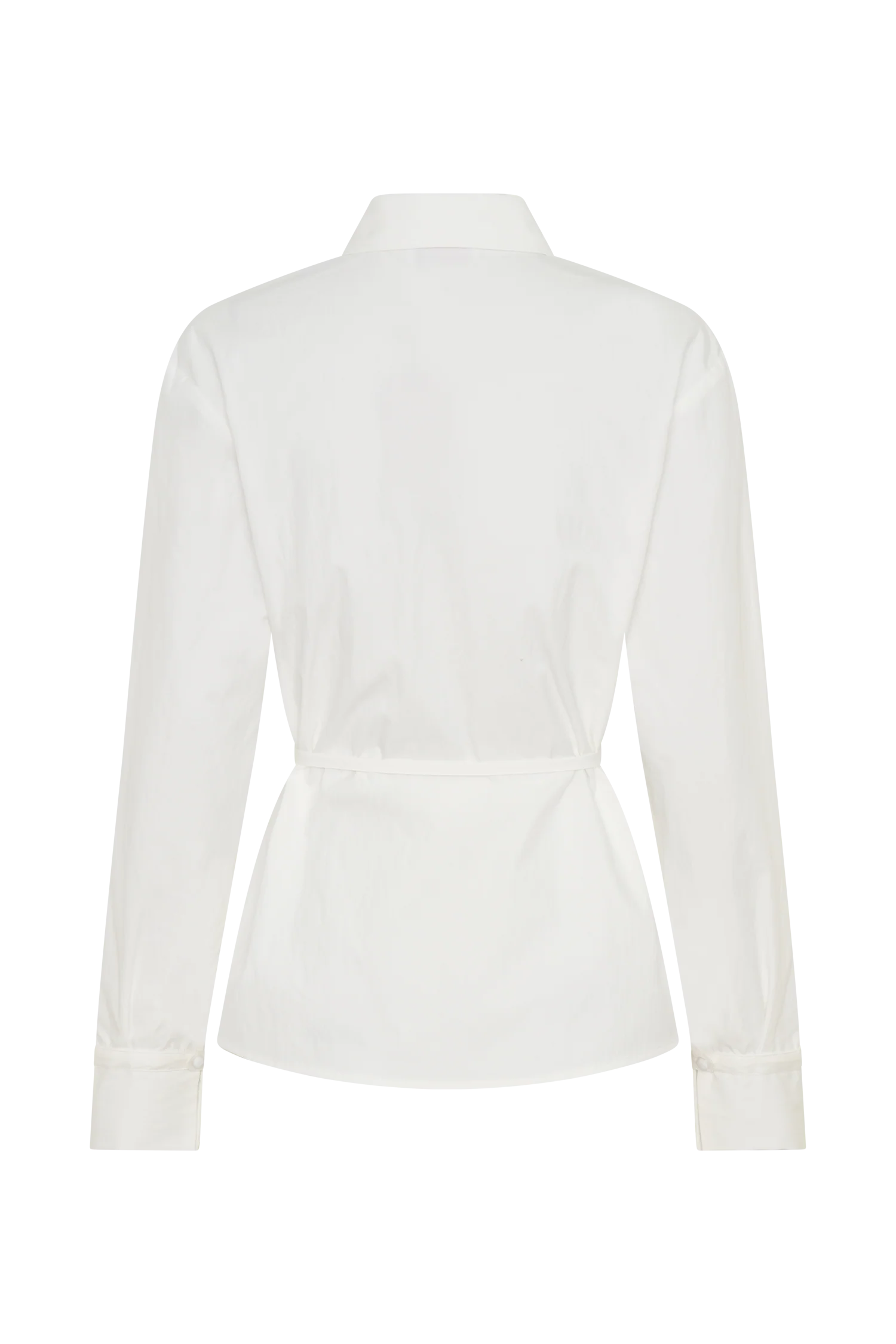 The MILLIE Tie Back Cotton Shirt takes a wardrobe staple and gives it a modern update. Featuring a collared neckline, long sleeves, and a concealed button-front placket, it delivers clean tailoring from the front. At the back, a waist tie threaded through side loops cinches the silhouette, creating a customisable fit that can be styled relaxed or defined. Finished with buttoned sleeve cuffs and crafted from breathable cotton, this shirt balances structure with ease for everyday refinement.