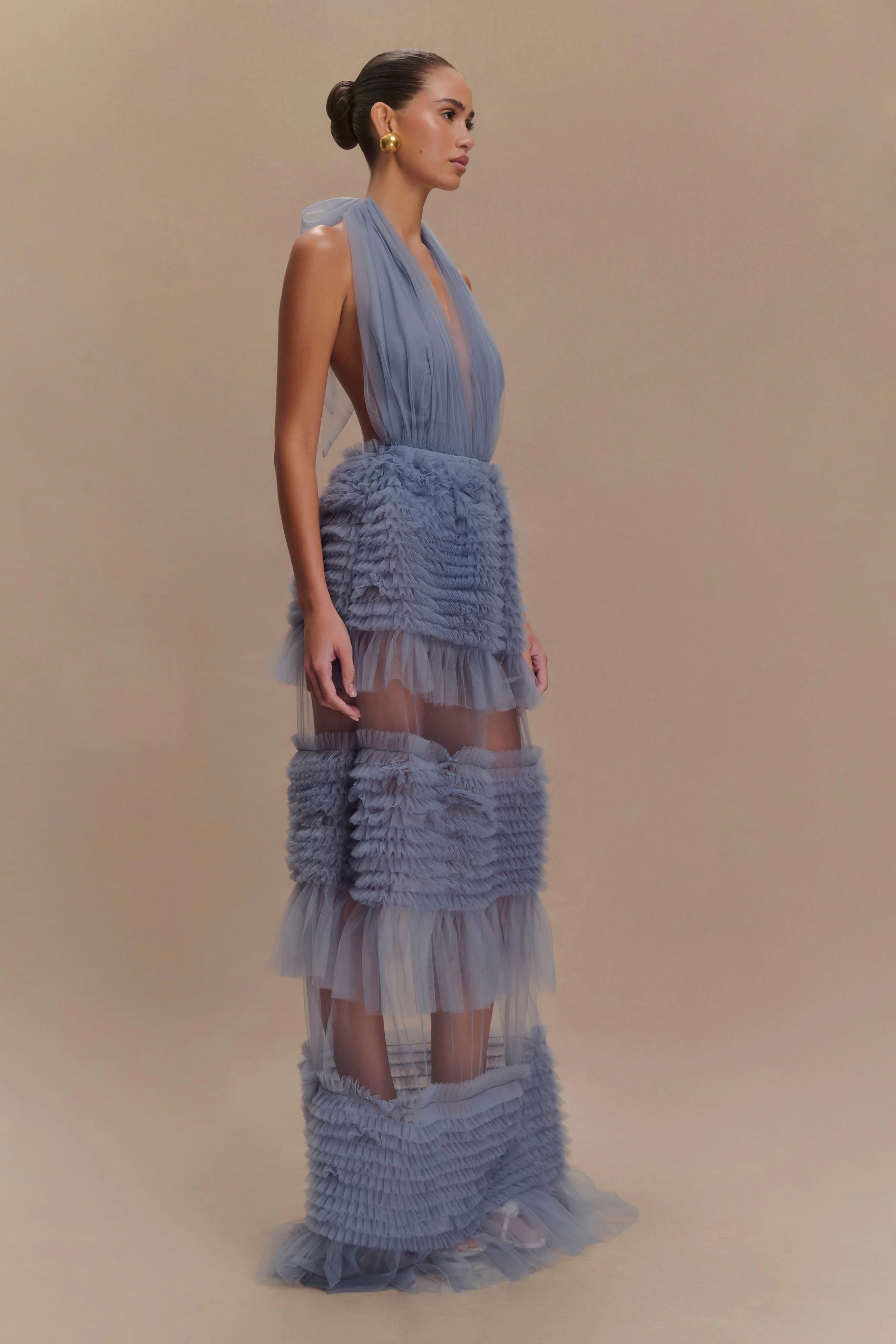 The MINKA Mesh Ruffle Halter Maxi Dress is a captivating blend of boldness and romance. Featuring a daring deep plunge neckline and an adjustable halter for a perfect fit, this dress is designed to turn heads. The gathered mesh bust panels create soft texture and flattering detail, while the tiered ruffle mesh skirt adds a flowing, ethereal charm. With its maxi length, it offers a dramatic silhouette, and the unlined design ensures a light, airy feel.