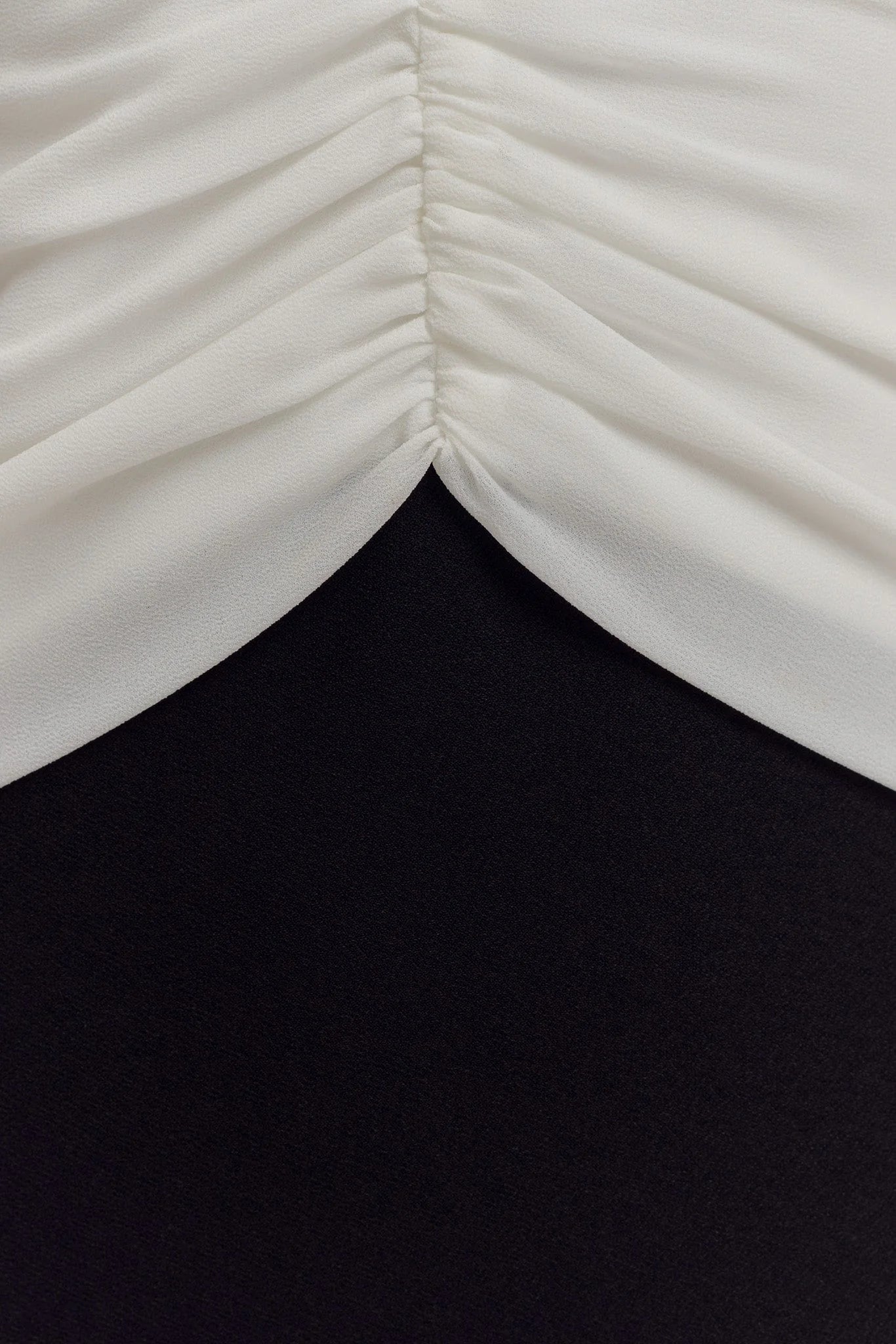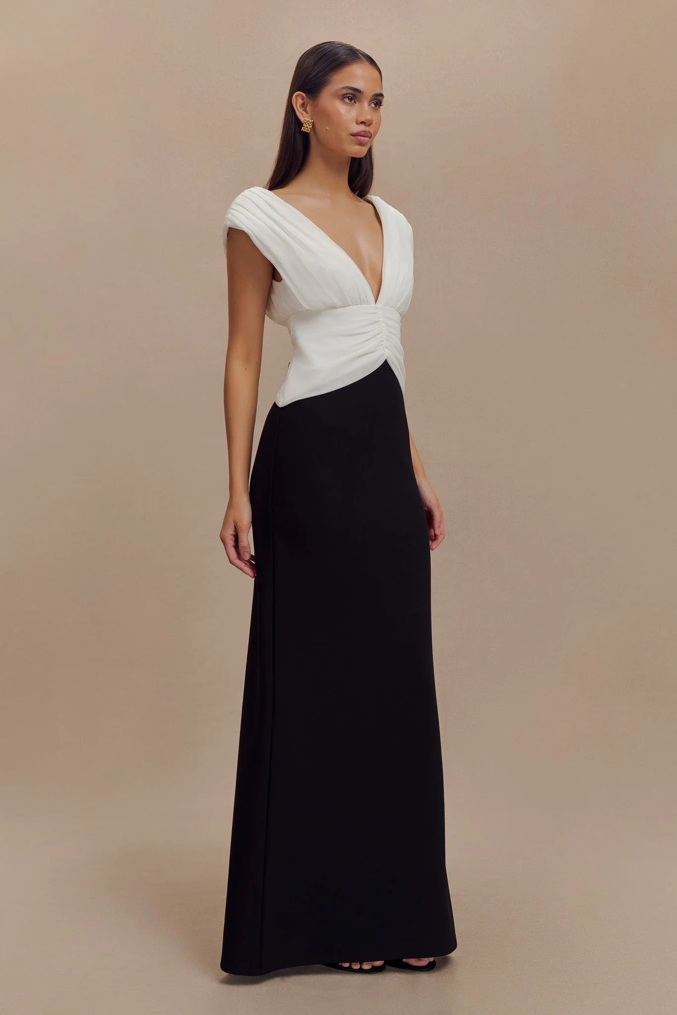 The MONIQUE Contrast Maxi Dress is a striking blend of elegance and modern design, perfect for making a memorable impression. Featuring a flattering V neckline and an open V back, this dress combines sophistication with a touch of allure. The chiffon upper adds a delicate, airy feel, while ruching detail at the bust and centre front enhances its refined silhouette. The chiffon overlay on the top skirt creates a graceful, flowing effect, and the stretch lower skirt provides both comfort and a sleek fit. With its contrast lower skirt and maxi length, this dress offers a stunning, fashion-forward look suitable for any special occasion.