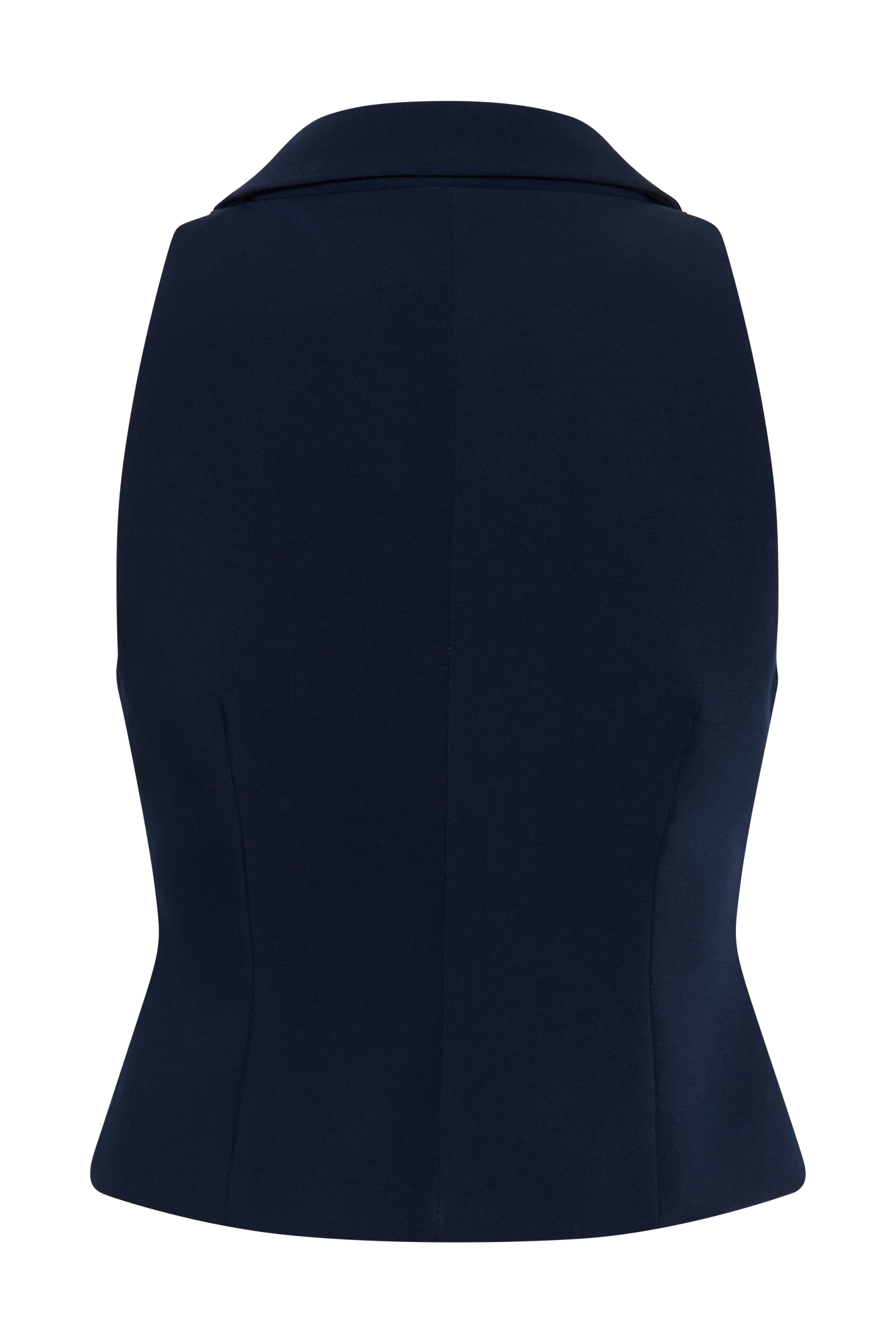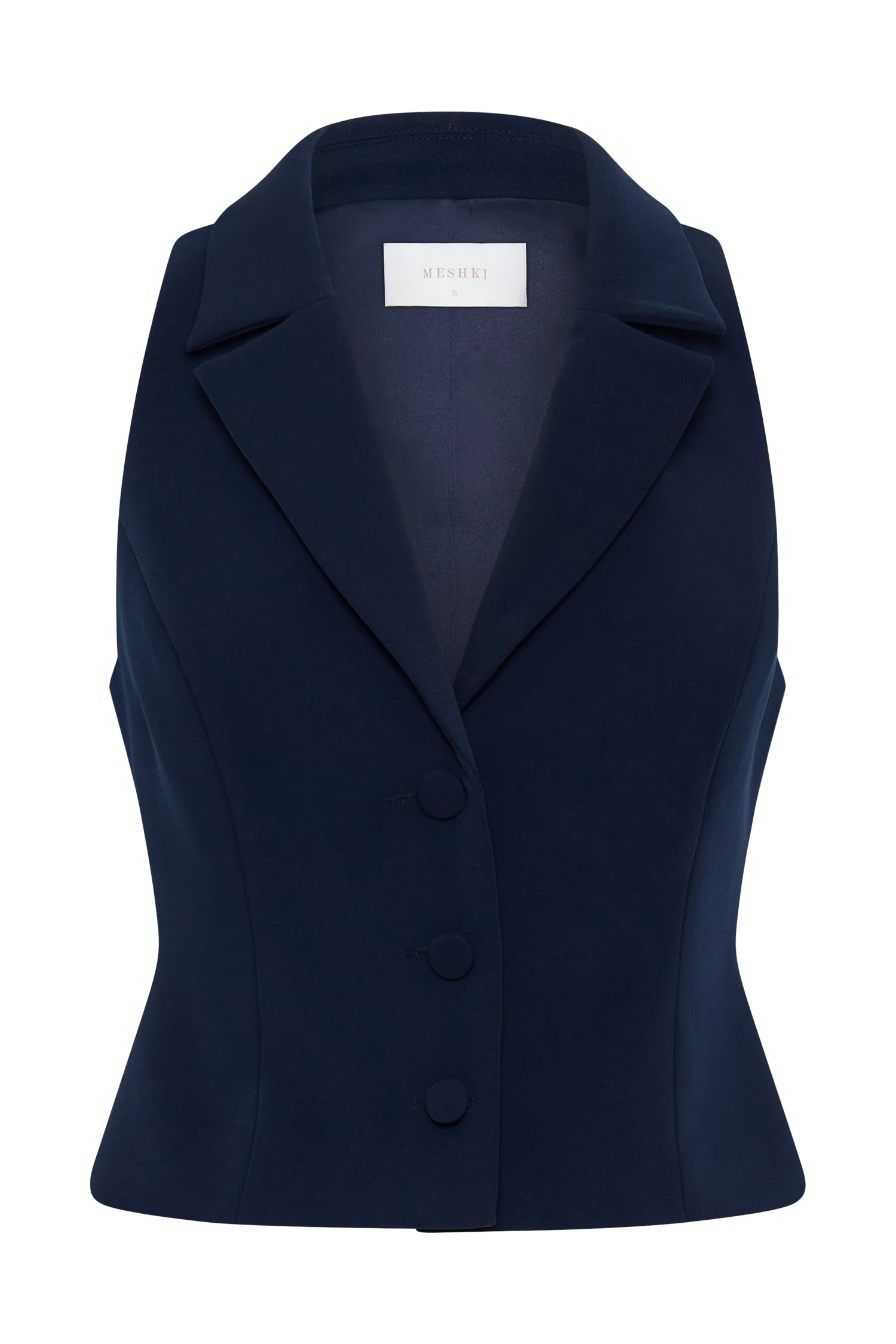 This is a sleeveless, single-breasted suiting vest with a deep V-neckline and functional front buttons. The lapel collar and longline bodice add structure to the soft, comfortable fabrication, seamlessly blending form and function. The silhouette is a suiting classic–clean lines, smooth edges, and subtle details. Minimalist and modern, MURA is a beautiful, versatile addition to your wardrobe for wear season after season. Complete the look with a structured, textured skirt like .