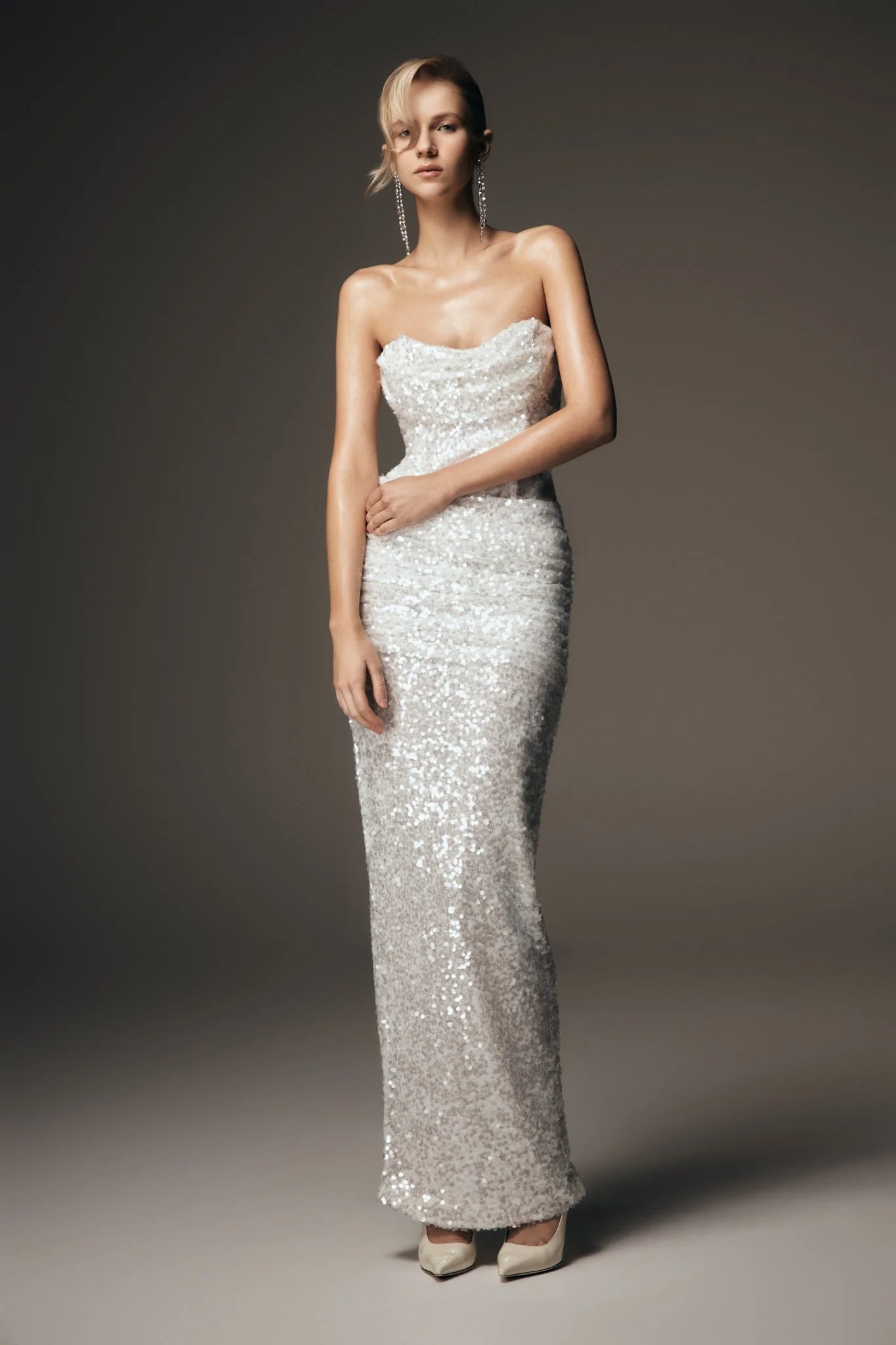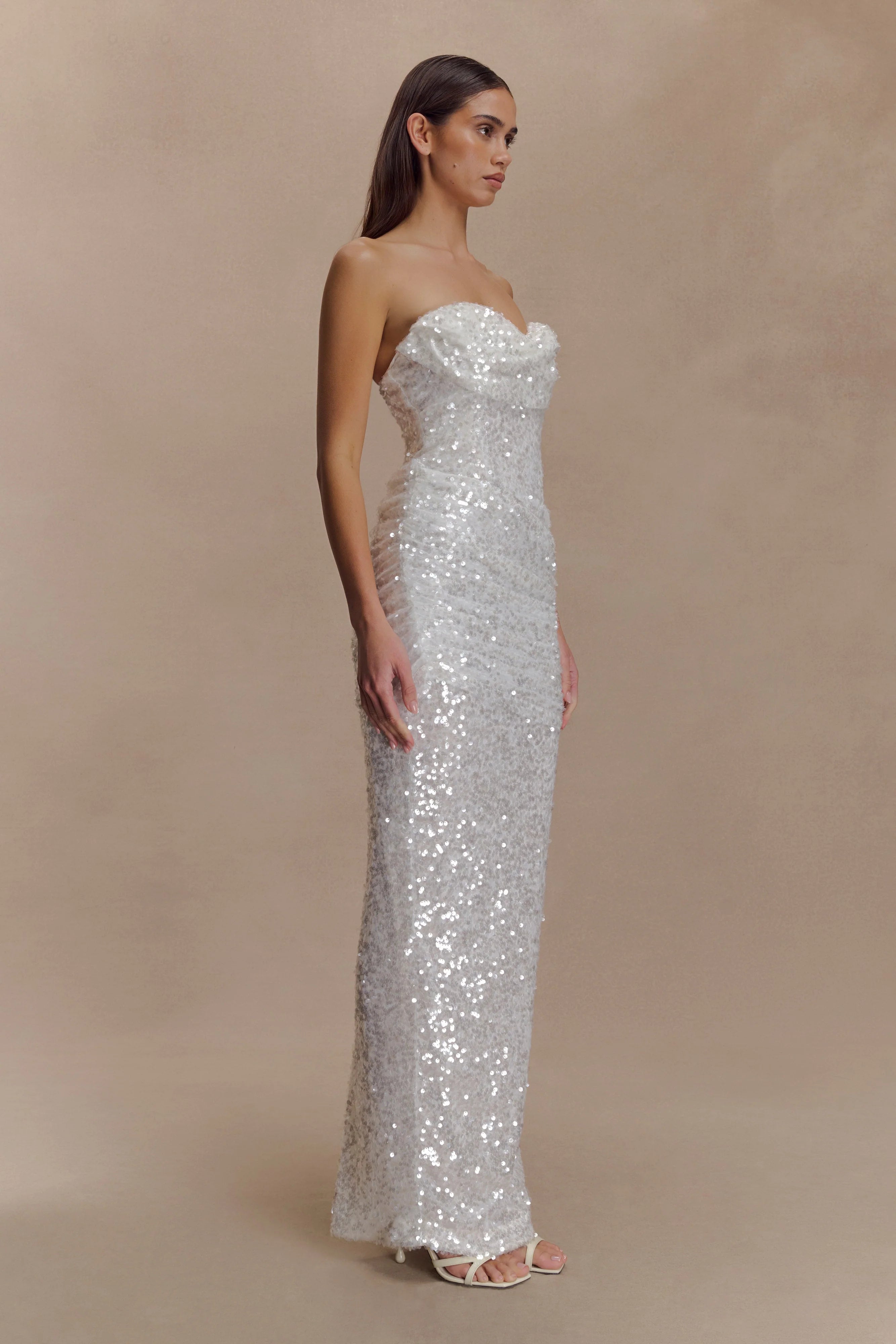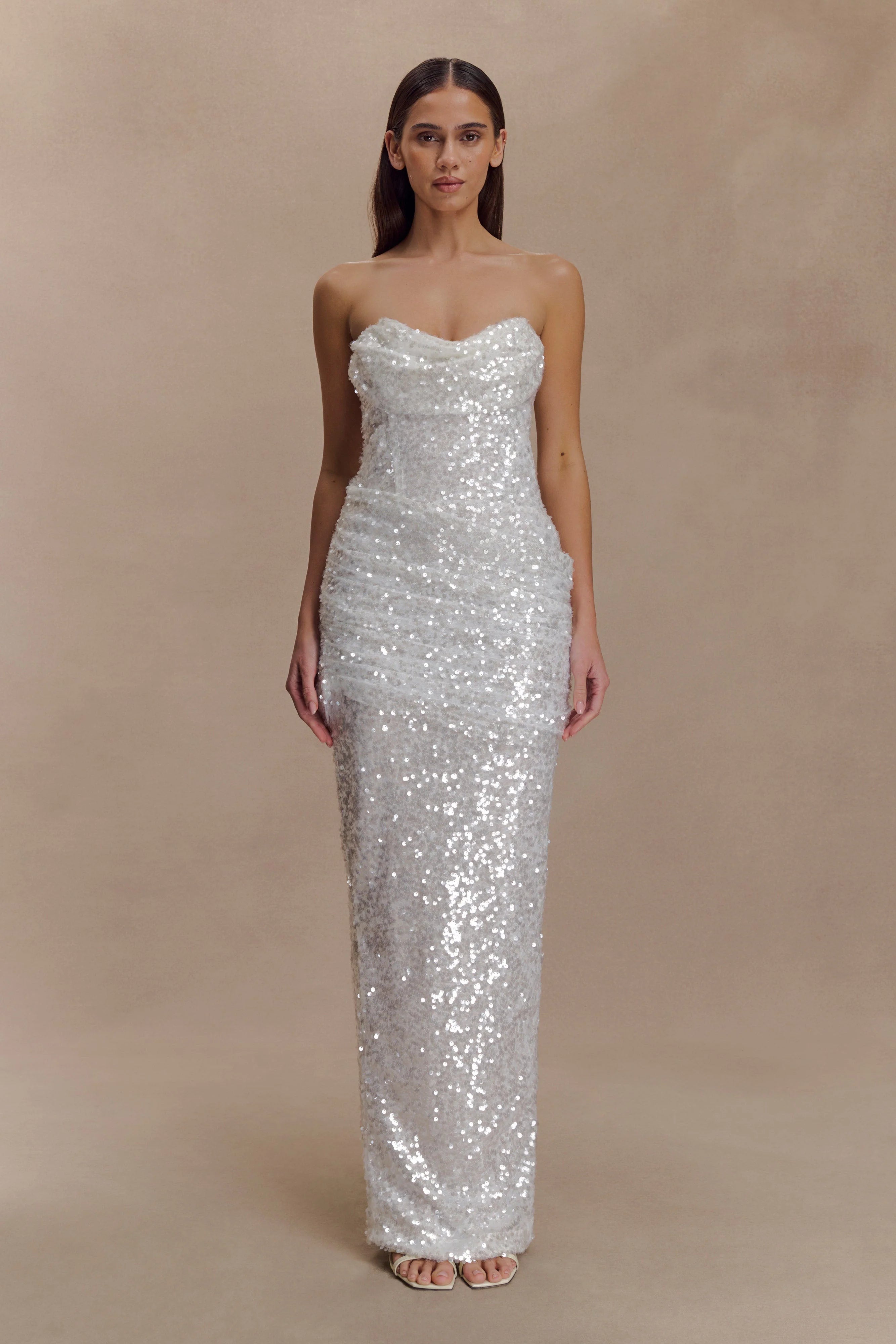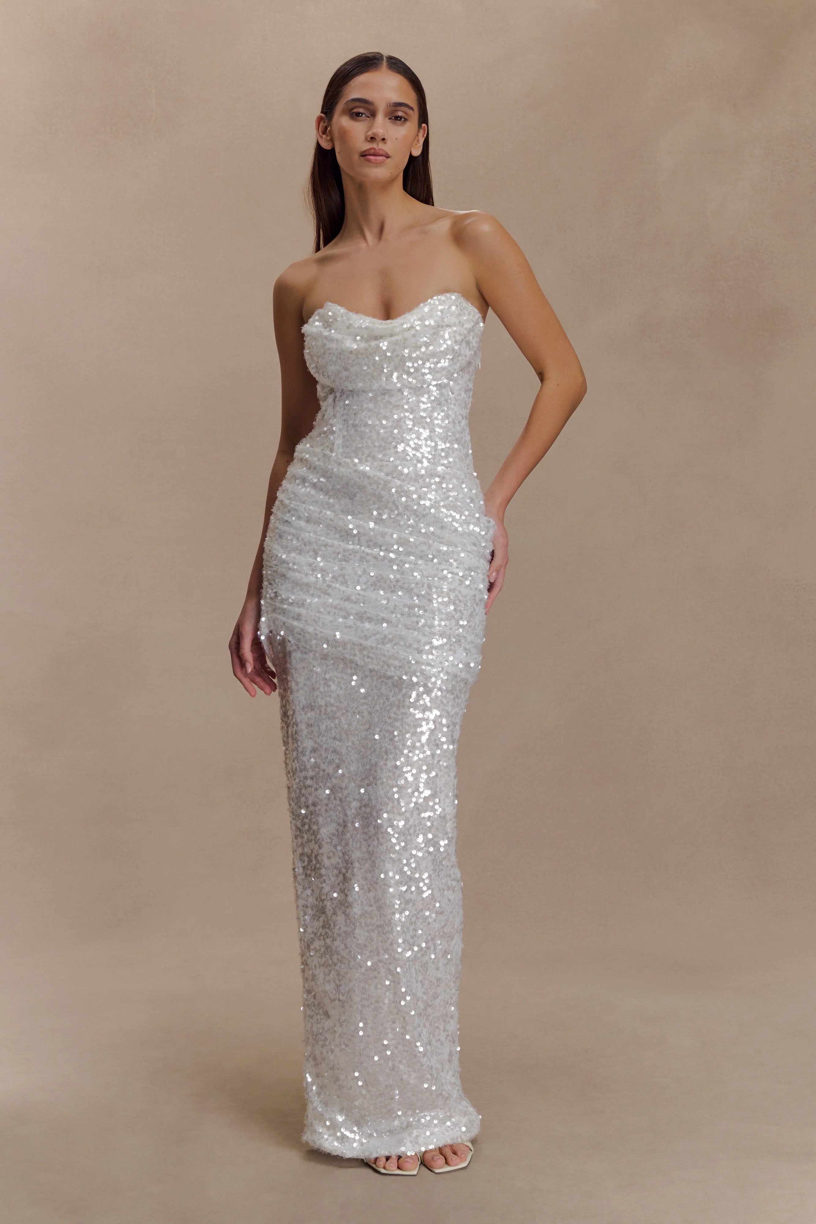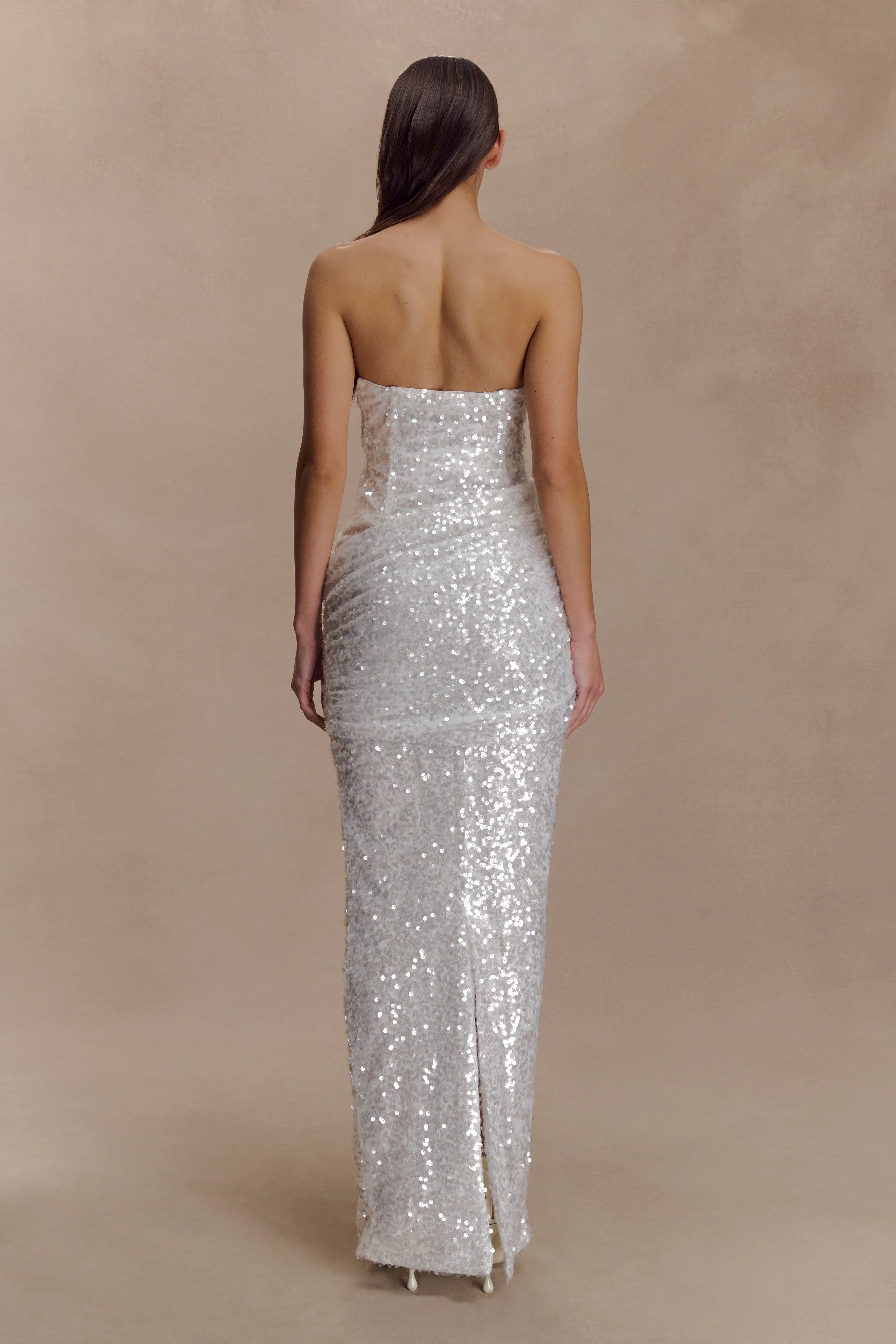 The NALA Strapless Sequin Maxi Dress is designed for moments that demand the spotlight. Featuring a sleek strapless neckline and bodycon silhouette, it’s structured with internal boning for a secure, sculpted fit. A back leg vent allows for graceful movement, while the invisible zip ensures a seamless finish. Partially lined for comfort, this dress glistens with every step—perfect for evenings where shimmer takes centre stage.