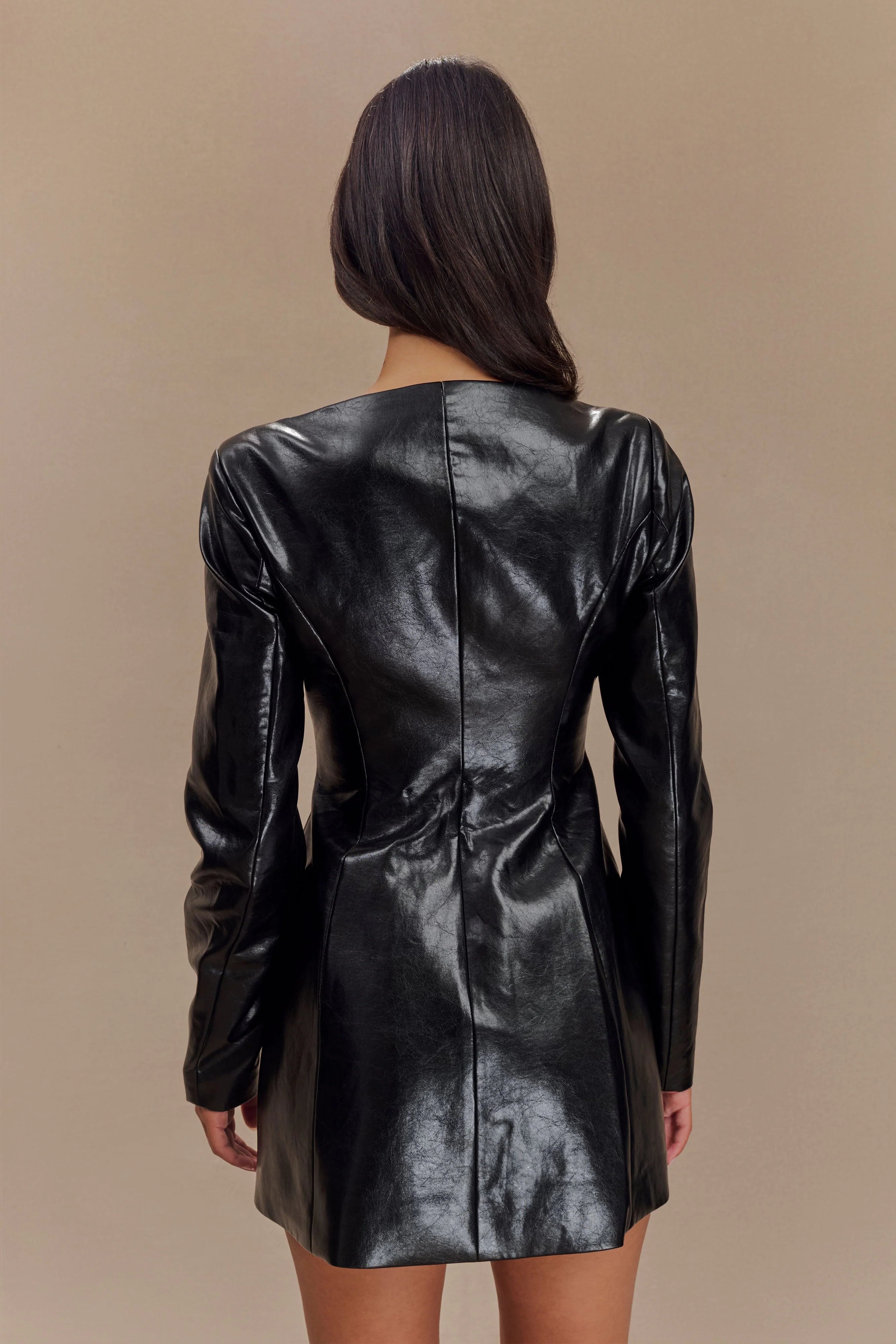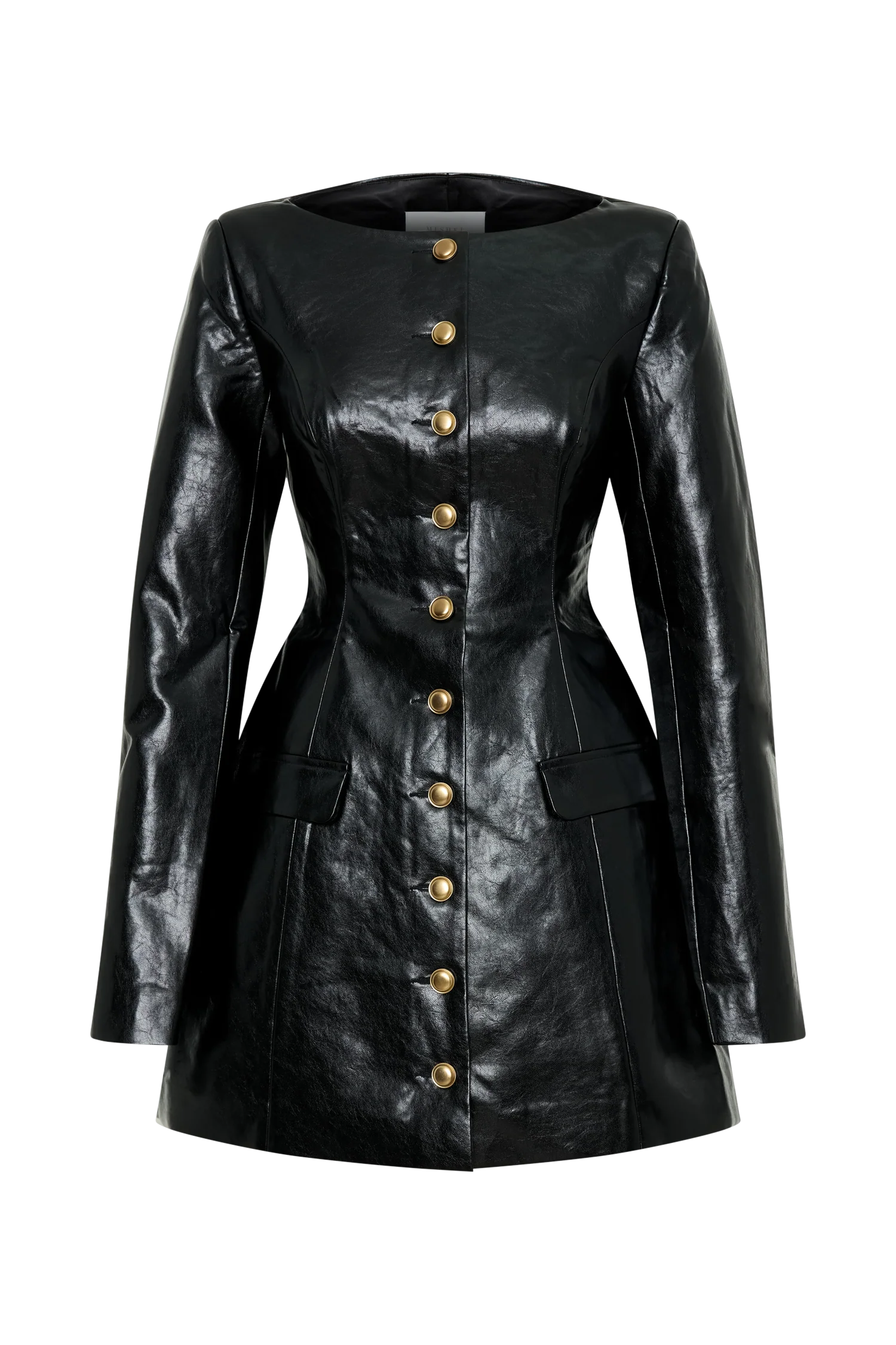 Make a striking statement with the NANCY Faux Leather Mini Dress, a perfect blend of edgy style and sophisticated design. Featuring a chic boat neckline that elegantly frames your décolletage, structured shoulders add a bold, confident touch. The long sleeves provide a sleek contrast to the mini length, making it ideal for any occasion. With a central front button closure, this dress offers a polished finish, while the structured skirt shape creates a flattering silhouette that accentuates your figure. Non-functional pockets enhance the modern aesthetic without sacrificing style.
