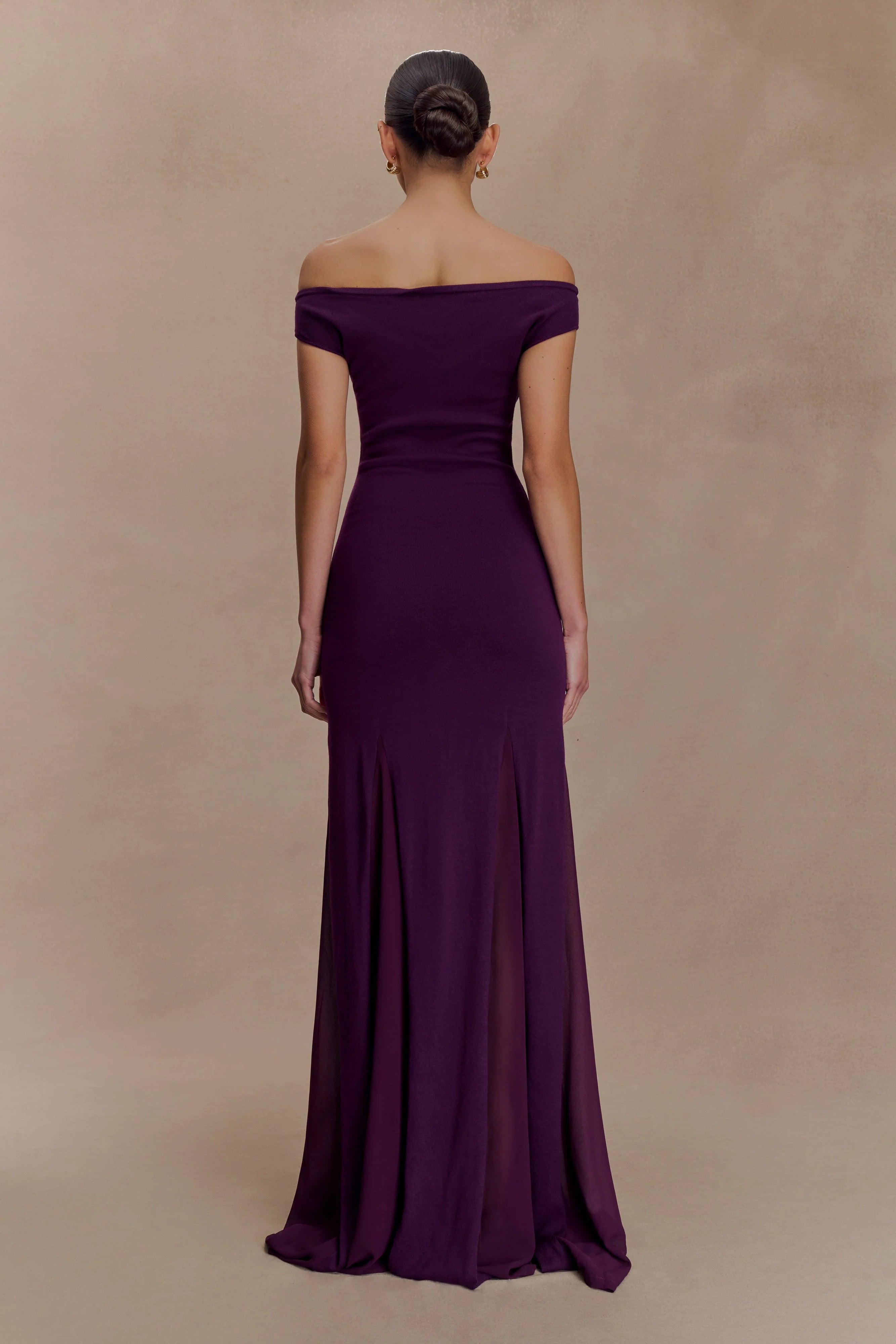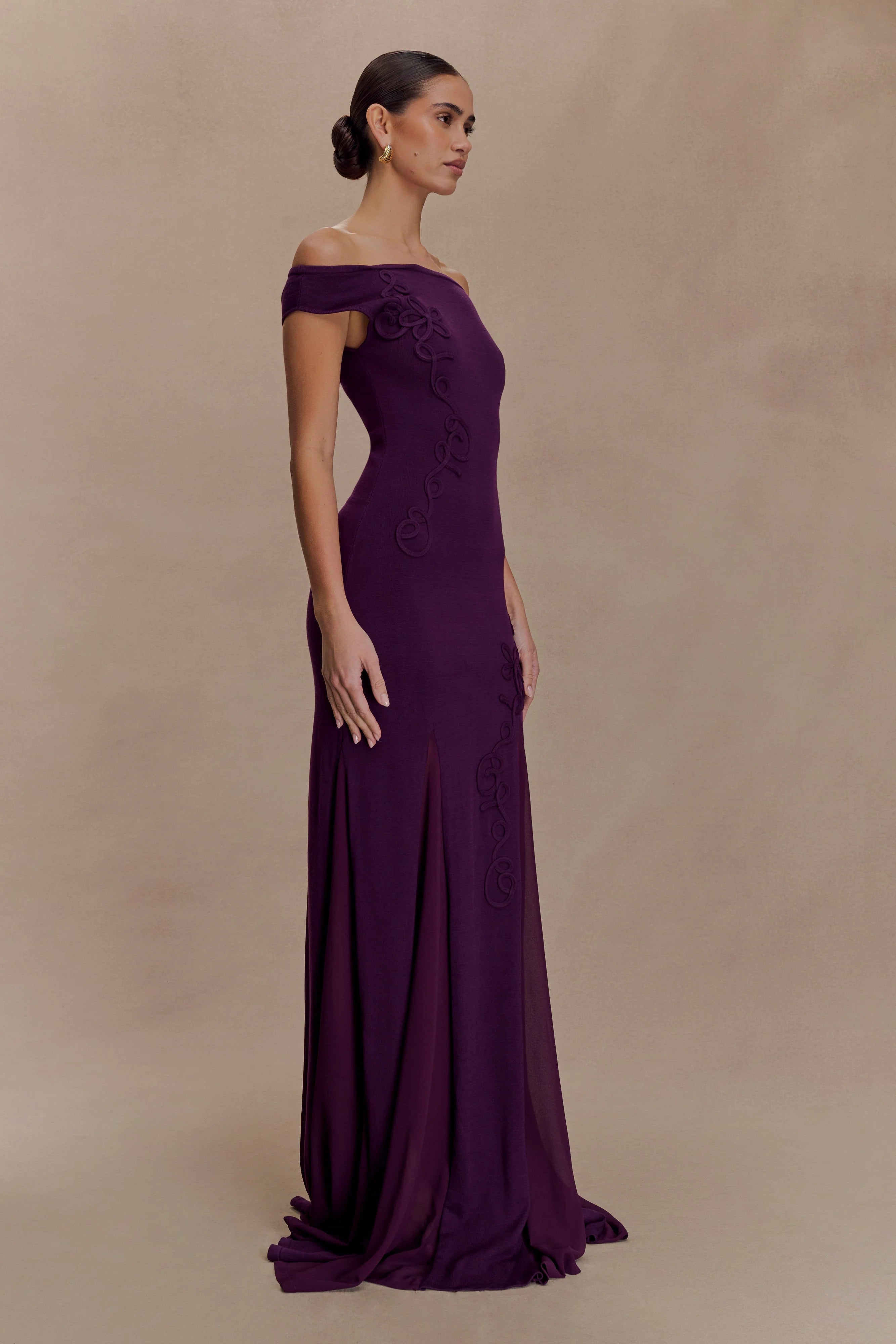 The NESTA Embroidery Off Shoulder Knit Dress is a refined take on romantic dressing. Designed with a flattering bardot neckline and figure-hugging knit base, this maxi silhouette is elevated by floral embroidery and flowing chiffon godets that add movement with every step. Equal parts soft and structured, this dress is your go-to for elegant evenings, garden celebrations, and everything in between.