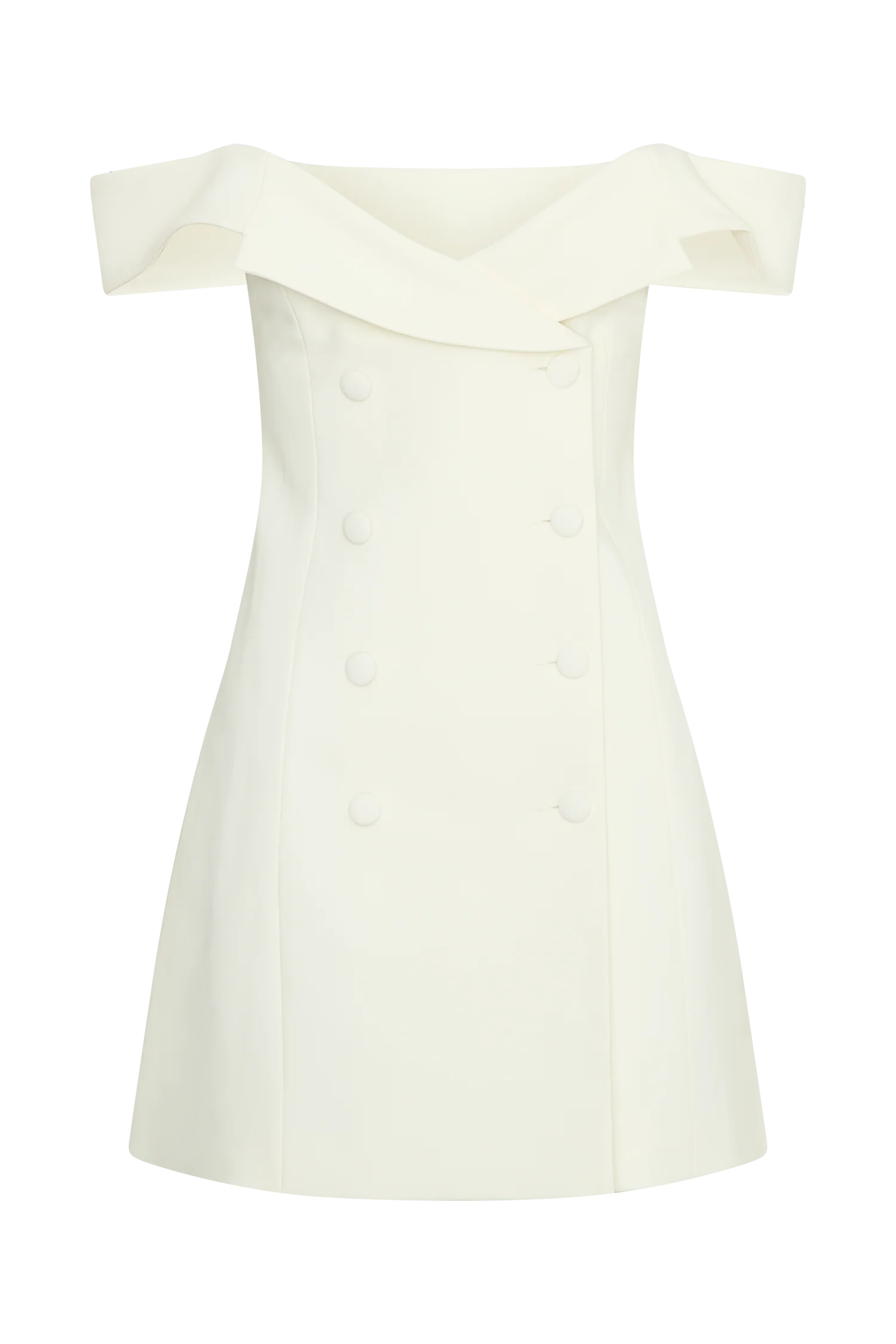 The NOELLE Off Shoulder Suiting Mini Dress is a captivating blend of sophistication and modern style. Featuring a Bardot neckline with a chic off-shoulder design and lapel detail, this mini dress exudes elegance and confidence. The functional front flap closure adds a touch of classic tailoring, while the fit-and-flare shape creates a flattering silhouette that enhances your figure. With its mini length, the Noelle Dress is perfect for making a statement at any event or evening out, effortlessly combining formal elegance with contemporary flair.
