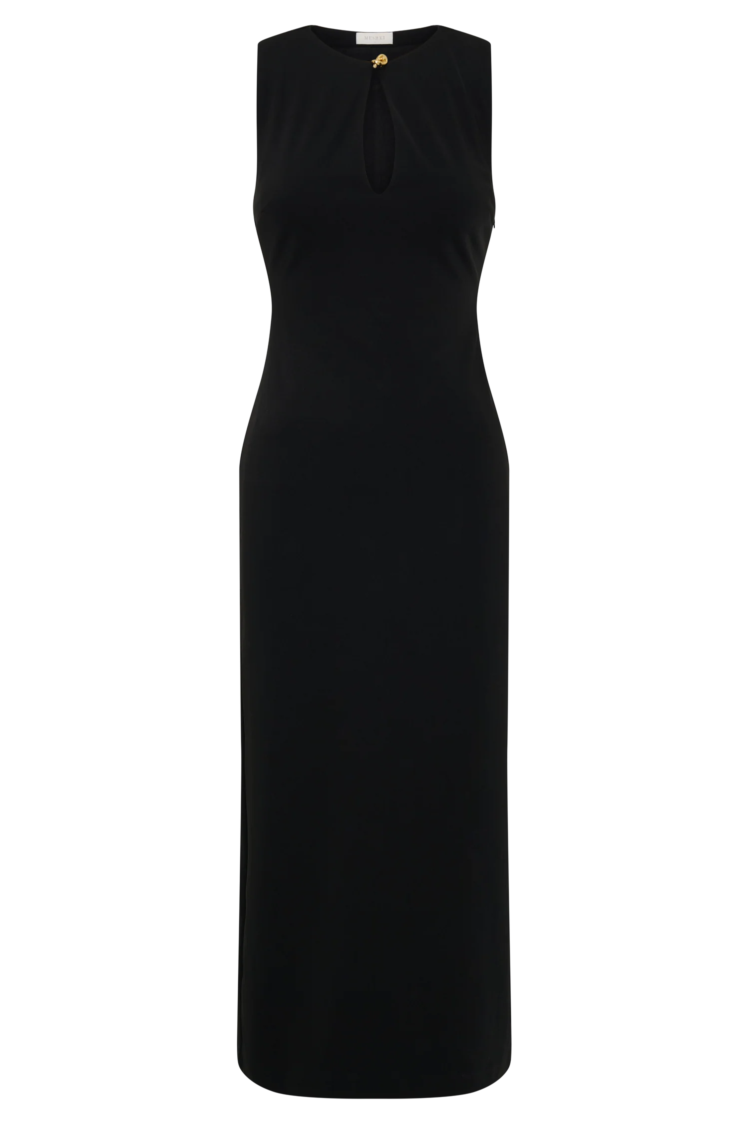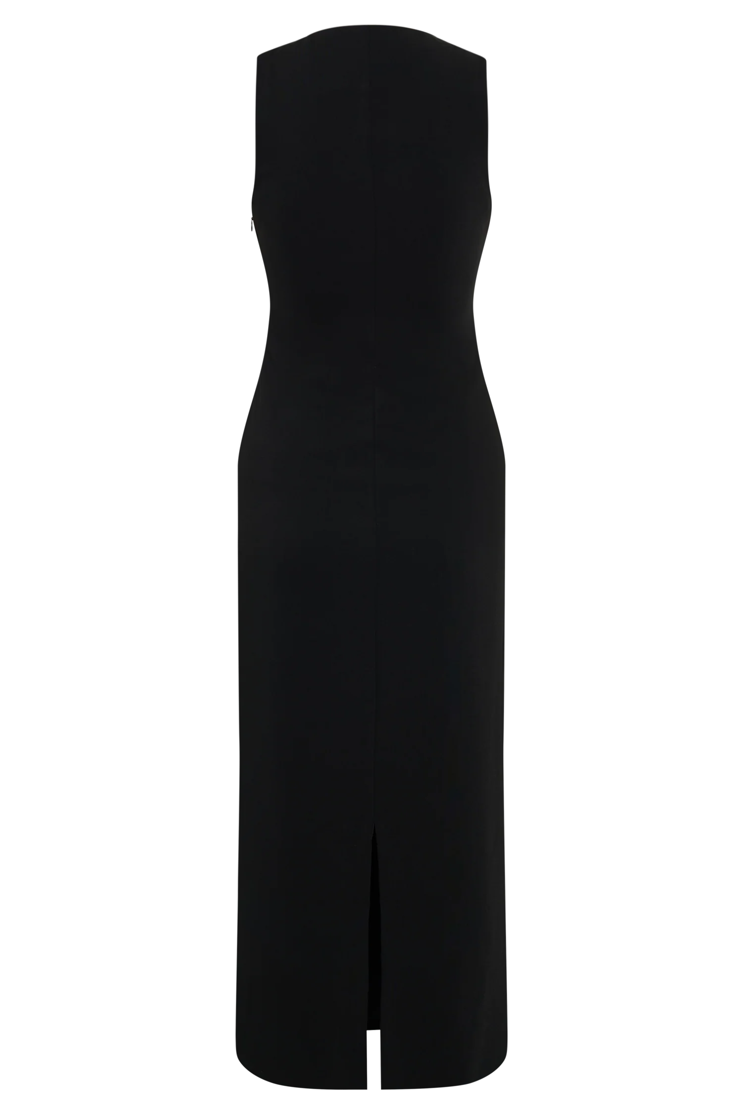 The NORAH Sleeveless Crepe Midi Dress is cut for sleek sophistication with a bodycon silhouette that elongates the frame. Featuring a clean crew neckline with a functional front button, it’s balanced by a sleeveless design for modern minimalism. A back split ensures ease of movement, while full lining and an invisible finish refine the look. Falling to a maxi length, this dress delivers timeless polish—perfect for day-to-evening occasions.