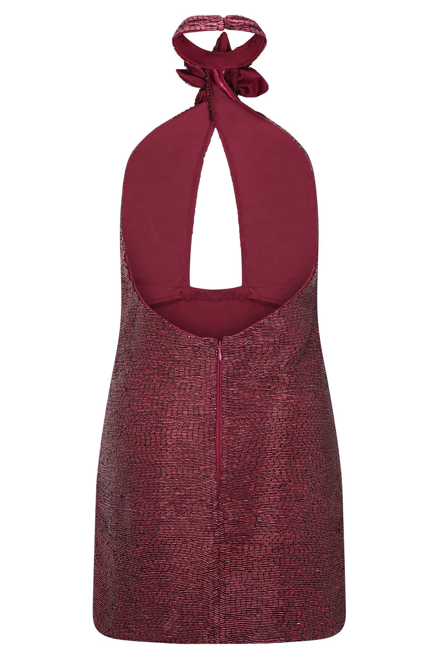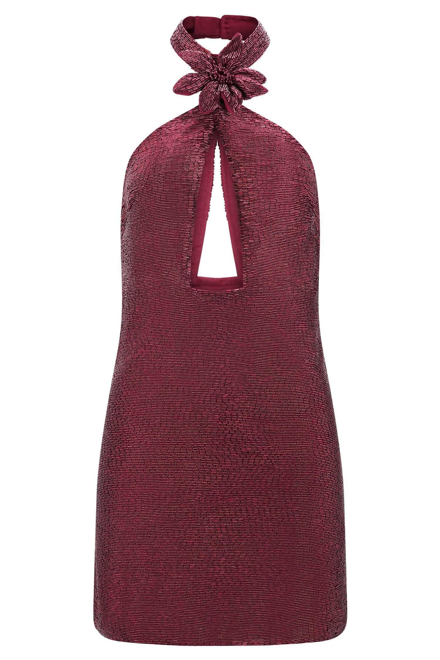 The NYLAH Beaded Halter Mini Dress is a masterpiece of elegance and craftsmanship, featuring a halter neckline adorned with a stunning flower neck design for a bold, feminine statement. A centre-front cutout adds a touch of allure, while the bodycon fit and mini length create a sleek, figure-enhancing silhouette. Hand-beaded with shimmering gold beads, this dress radiates luxury and sophistication. Finished with a centre-back zip and full lining for comfort, it’s a show-stopping piece perfect for your most glamorous occasions.