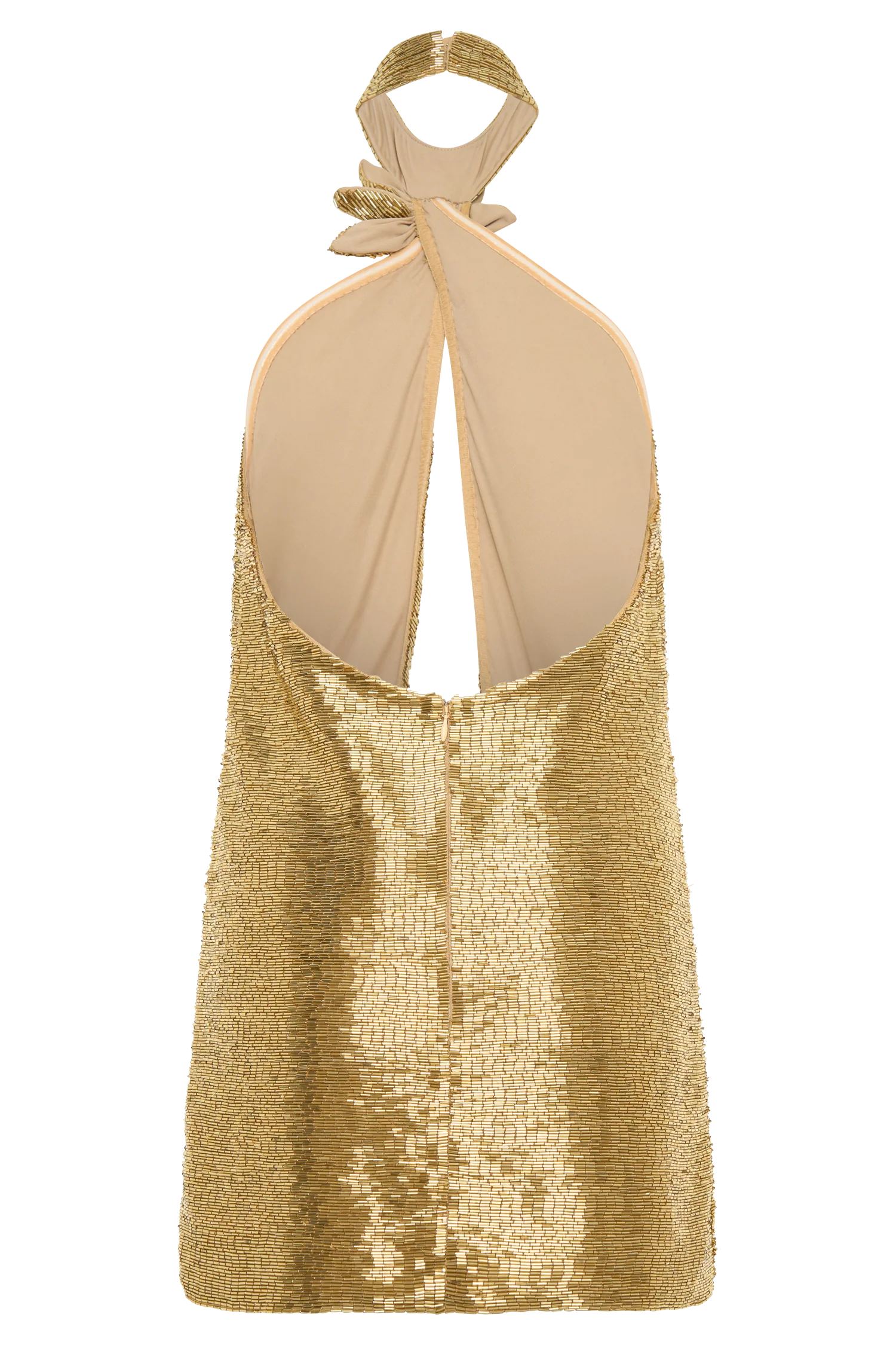 The NYLAH Beaded Halter Mini Dress is a masterpiece of elegance and craftsmanship, featuring a halter neckline adorned with a stunning flower neck design for a bold, feminine statement. A centre-front cutout adds a touch of allure, while the bodycon fit and mini length create a sleek, figure-enhancing silhouette. Hand-beaded with shimmering gold beads, this dress radiates luxury and sophistication. Finished with a centre-back zip and full lining for comfort, it’s a show-stopping piece perfect for your most glamorous occasions.